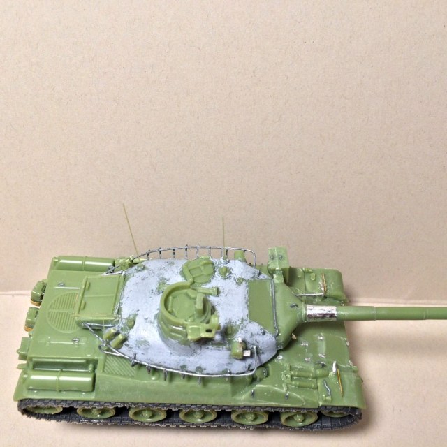 Все доп. детали сделаны из пищевой фольги и проволки . Траки взял от журнального абрамса (сторюблёвого) они хоть капельку лучше ,чем наборные , хотя тоже ужасны .