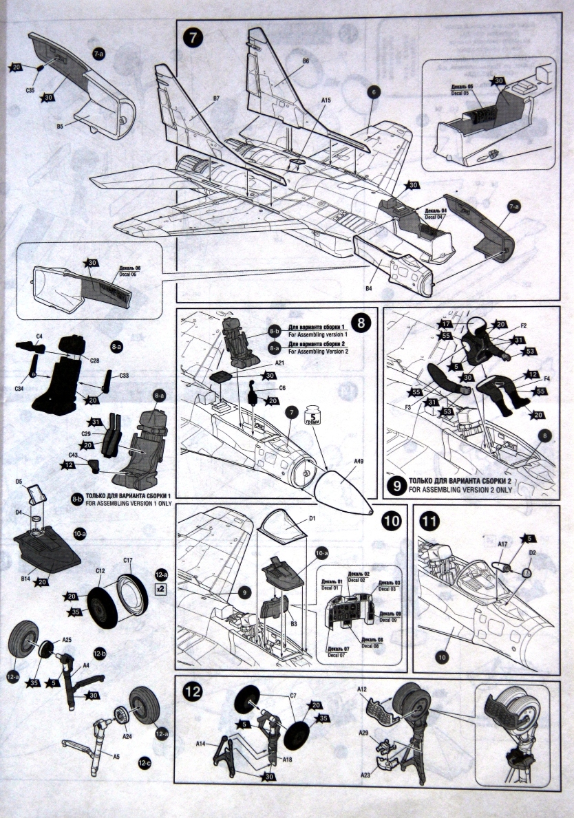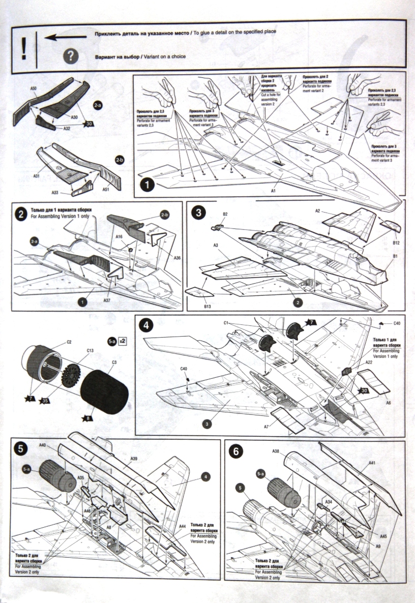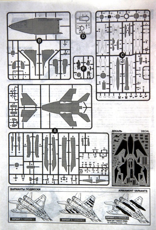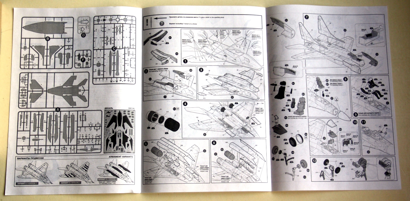 Инструкция по сборке, сделана "гармошкой" на 6 страниц, показывает 2 варианта сборки (с убранными и выпущенными шасси) и 3 варианта подвески (без пилонов, с пилонами и с ПТБ).