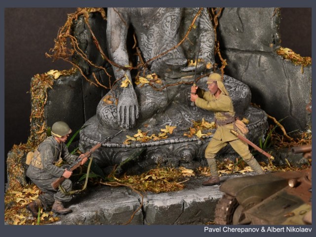 Мой друг и коллега Альберт Николаев покрасил ее под старый камень, построил диорамное основание, высадил растительность, и получилась вполне удобная подставка для техники и фигур. Роспись фигур - также работа Альберта. Я занимался только самим танком.