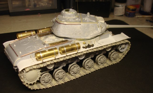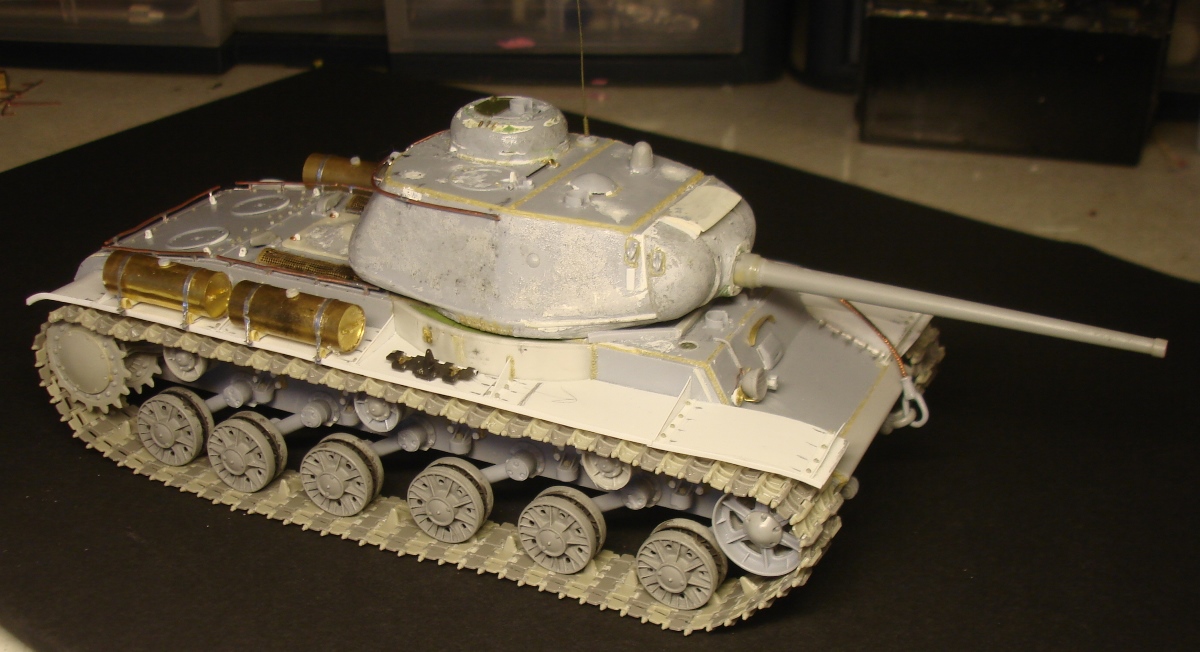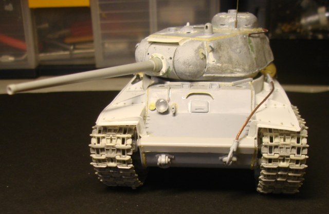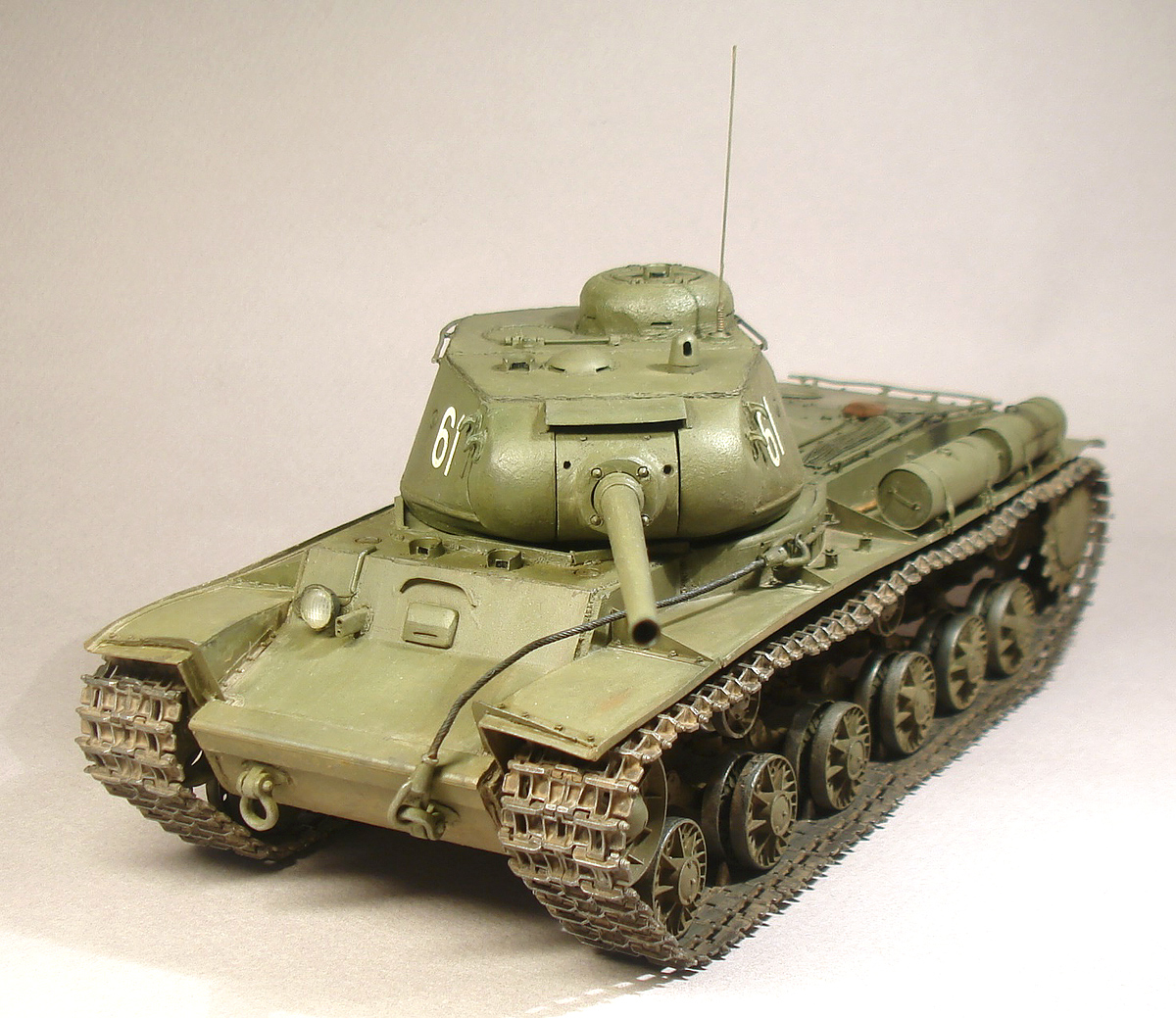 В основе - старый пластик ВЭ, который дополнил опорными катками от "Комплект ЗИП", траками "Мастер-Клуб", некоторыми деталями от "Трумпетера" (ленивцы, ступицы поддерживающих роликов, выхлопные патрубки, корпус и стекло фары). Изготовил устройства натяжения гусениц, надгусеничные полки (листовой полистирол) поручни (паяная медная проволока), сварные швы (двухкомпонентка "Тамии"), использовал метизы "Мастер-Клуба", сухие декали (MicroWorld), элементы травления Voyager.