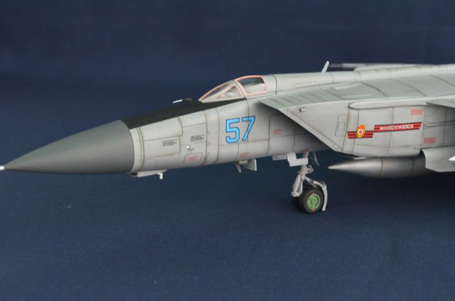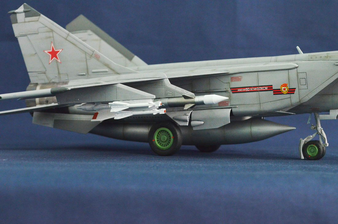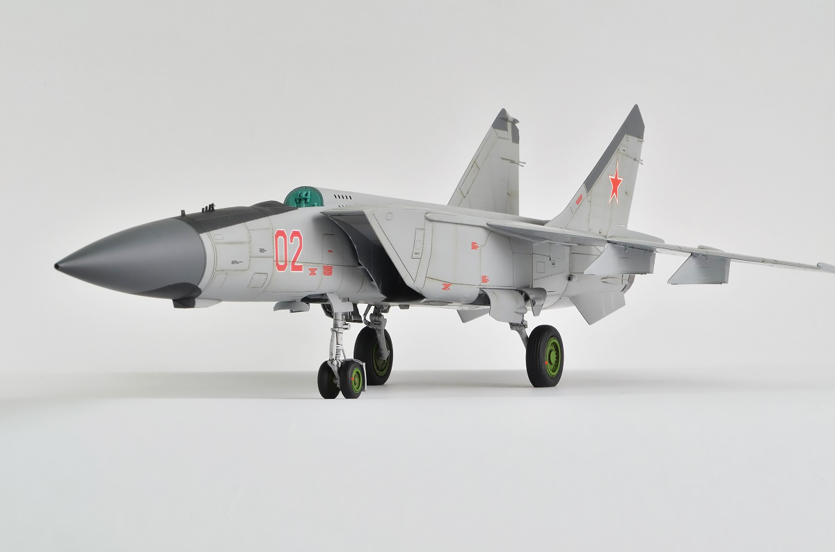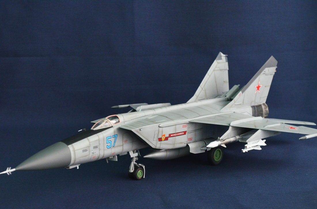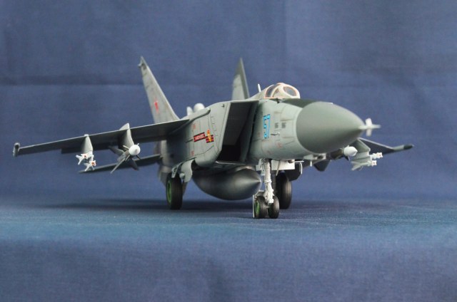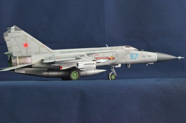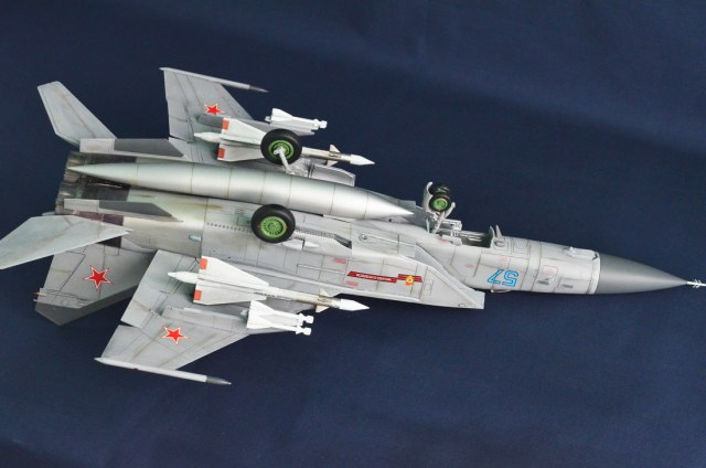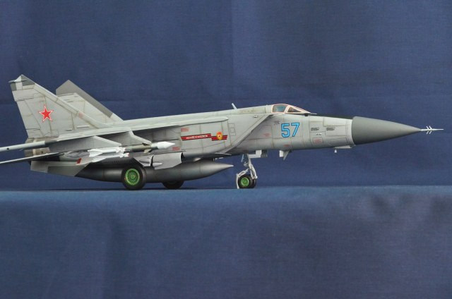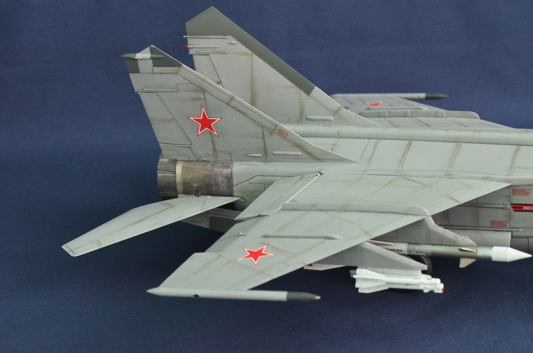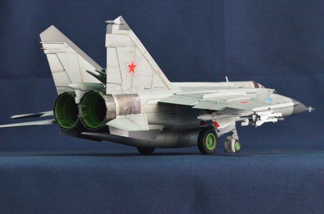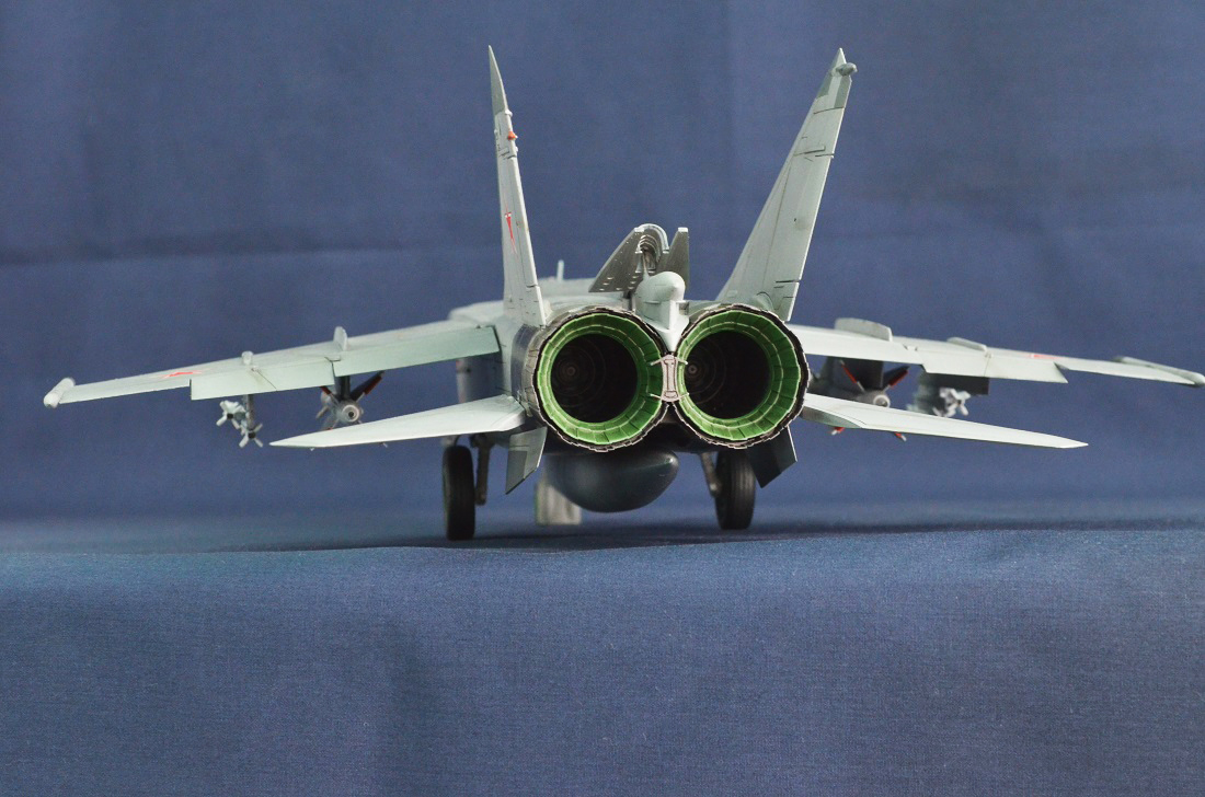 Как всегда-аккуратная сборка и окраска. Что не понравилось: ДУАСы великоваты, жаропрочное покрытие внутри ФК (зелёное) ярковато. Я брал эту краску у АКАНа, но использовать не стал именно по этой причине. Не совсем понял почему панели внутри ВЗ так сильно опущены (похоже, это режим полёта больших скоростях). Ну и последнее (исключительно ИМХО!) я бы Р-60 не стал на МиГ-25 вешать.