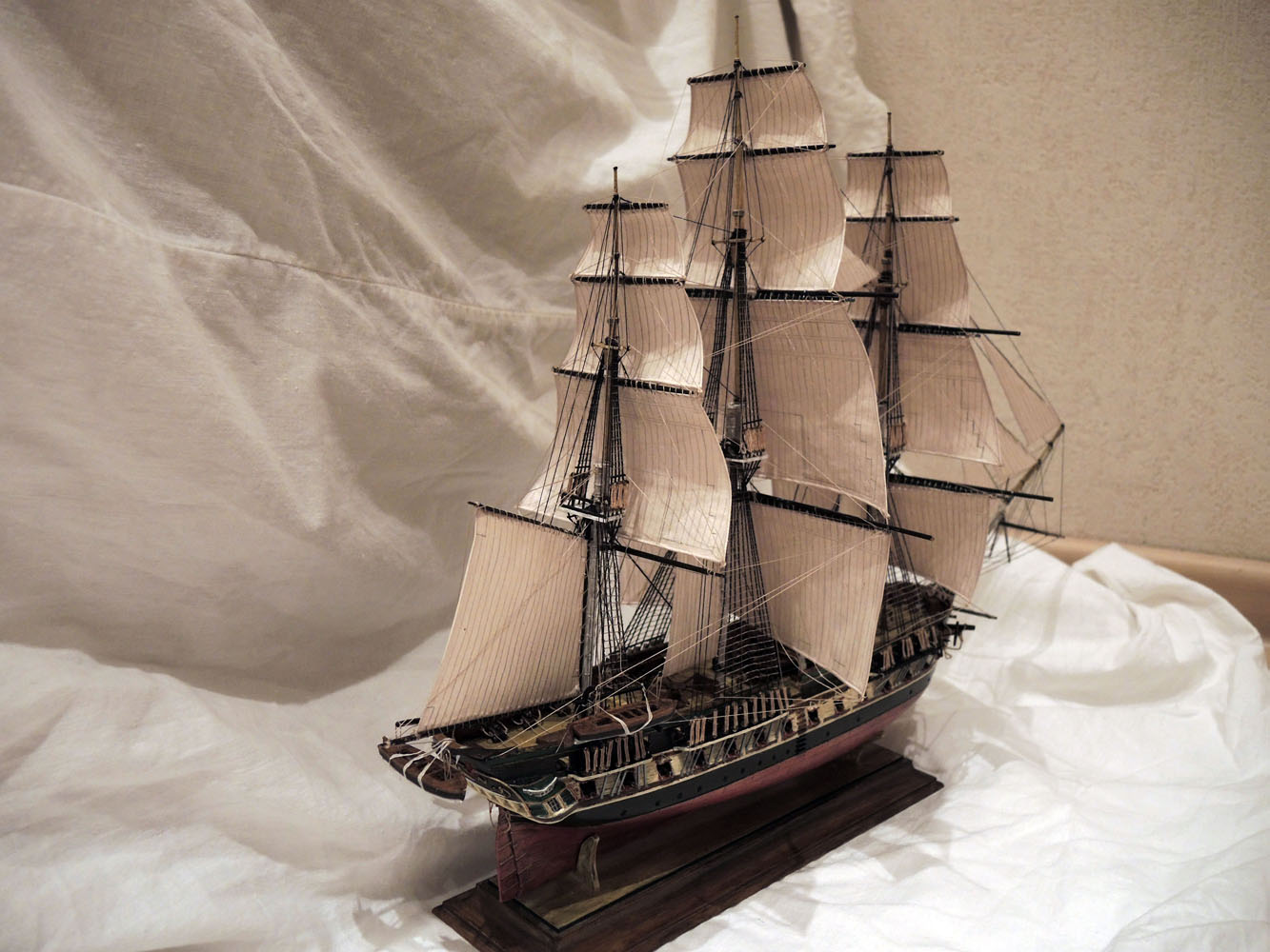 Мое мнение по модели - с одной стороны это одна из наиболее доступных по цене моделей фрегата, и это было основным критерием при покупке, но с другой стороны содержимое для новичка трудно в работе в виду маленького масштаба и значительного объема требуемых доработок. В виду того, что это мой первый парусник при постройке допущено значительно количество ошибок, но приобретен значительный опыт и полученный результат мне очень нравится.