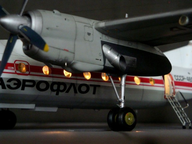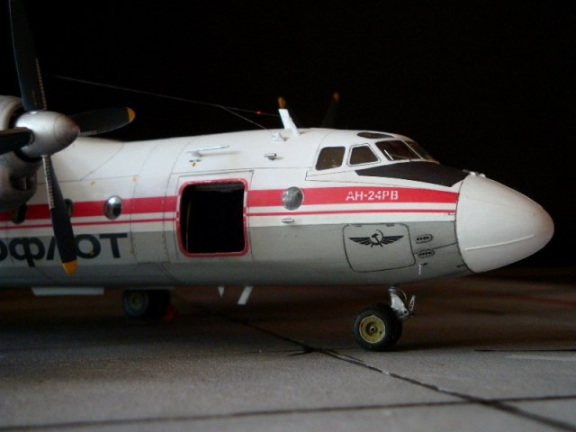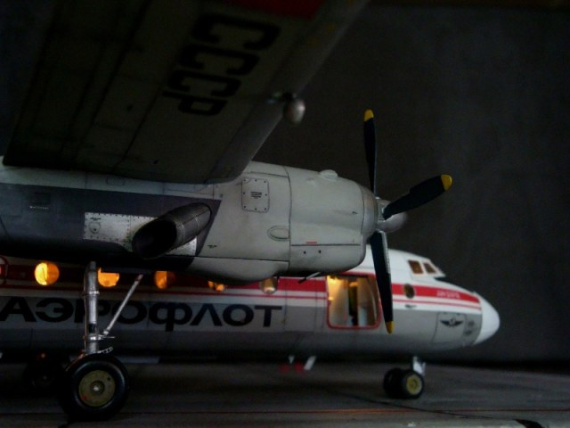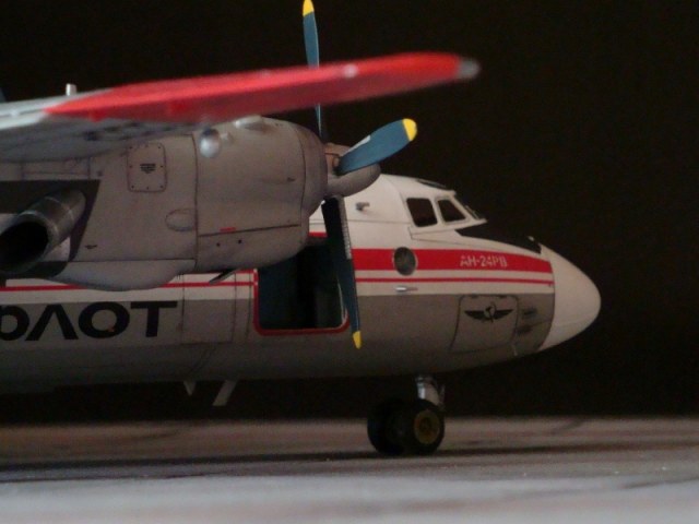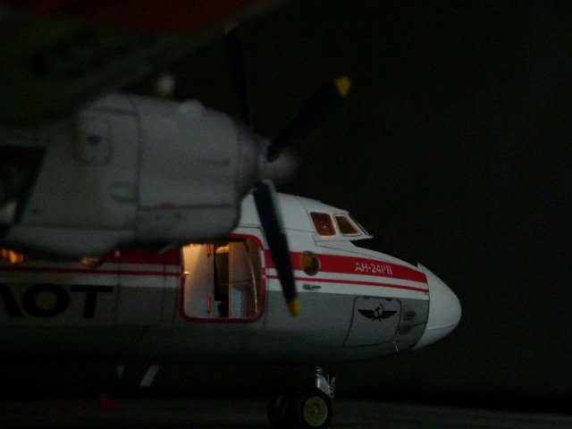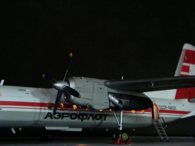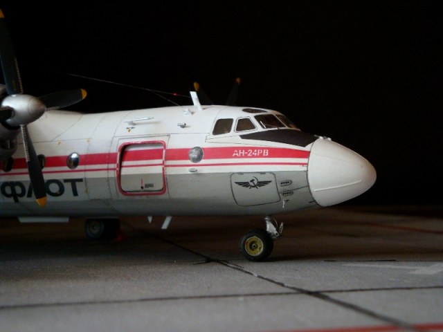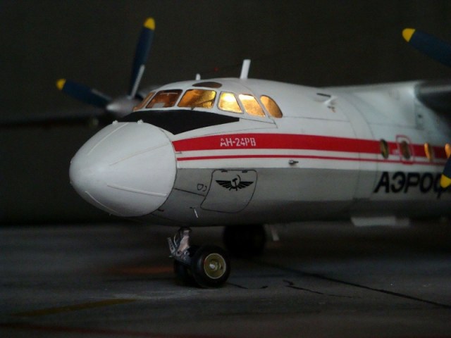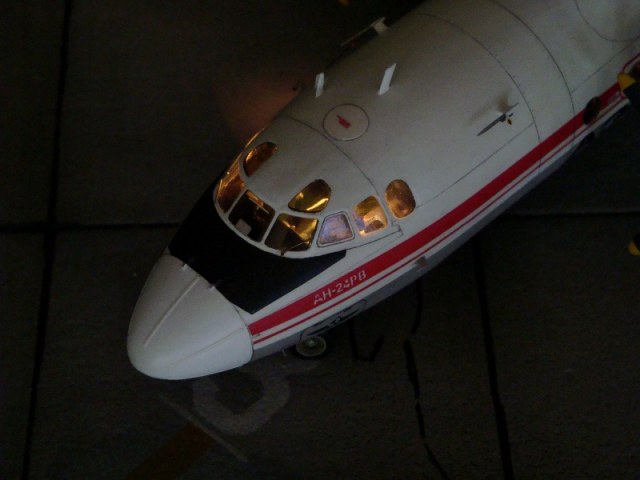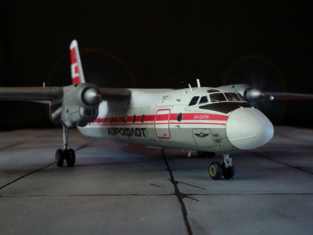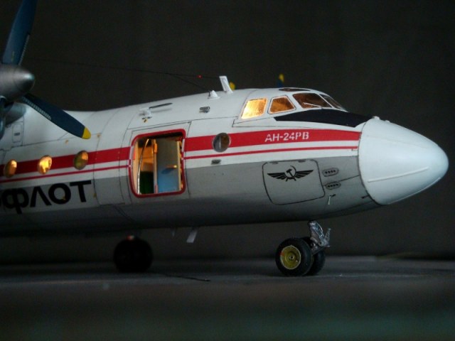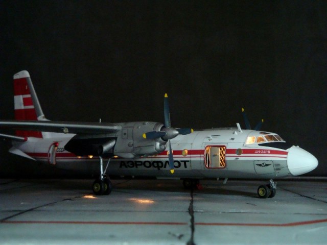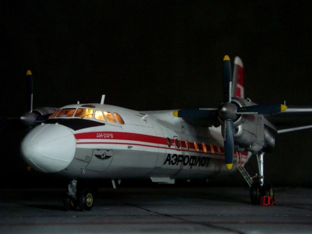 Добрый день всем. Друзья, представляю очередного Антонова. Модель сделана на заказ, а так как заказчик хотел Ан-24РВ, пришлось переделать с базовой модели правую мотогондолу под РУ 19-300. Жаль, но "АМОДЕЛ" этот вариант не делает. В модели доработан салон и подсветка, а также сделана механизация.