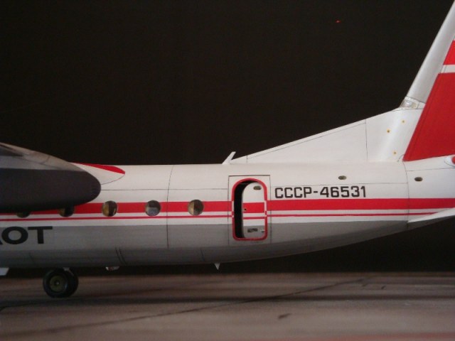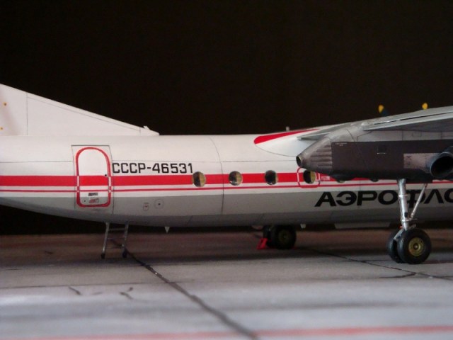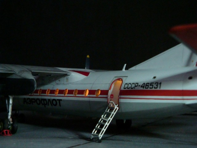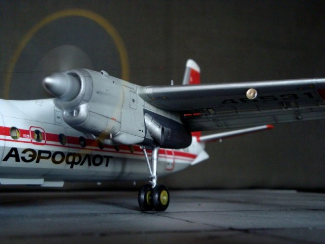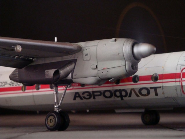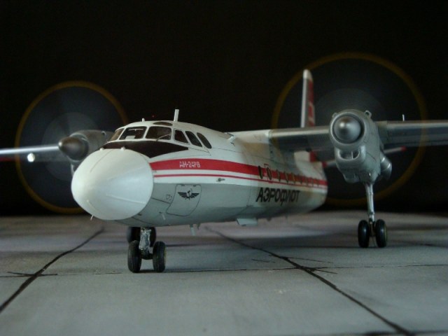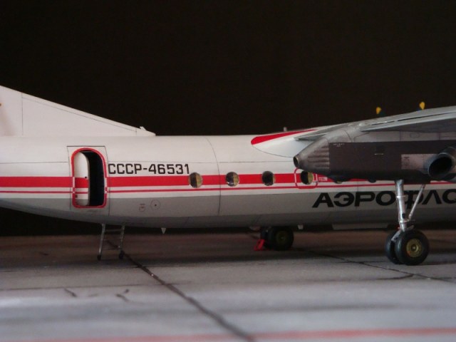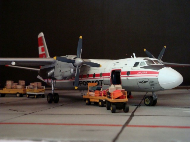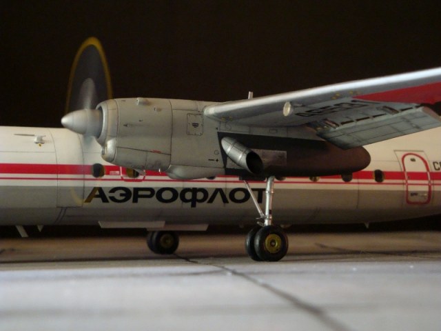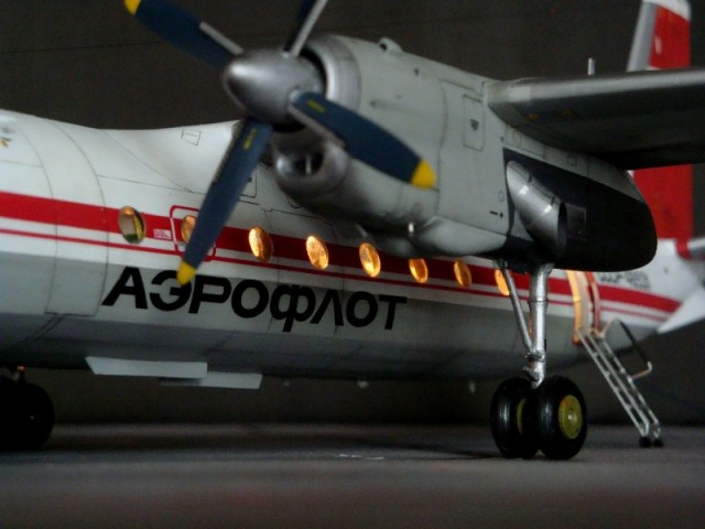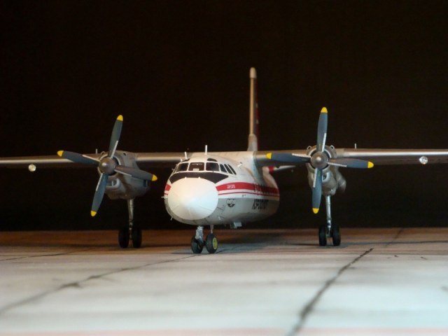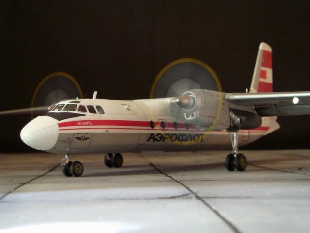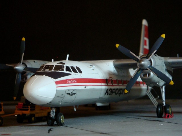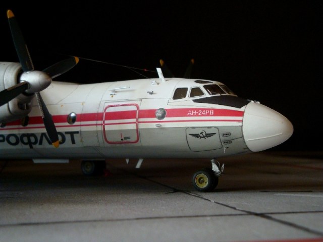 Добрый день всем. Друзья, представляю очередного Антонова. Модель сделана на заказ, а так как заказчик хотел Ан-24РВ, пришлось переделать с базовой модели правую мотогондолу под РУ 19-300. Жаль, но "АМОДЕЛ" этот вариант не делает. В модели доработан салон и подсветка, а также сделана механизация.
