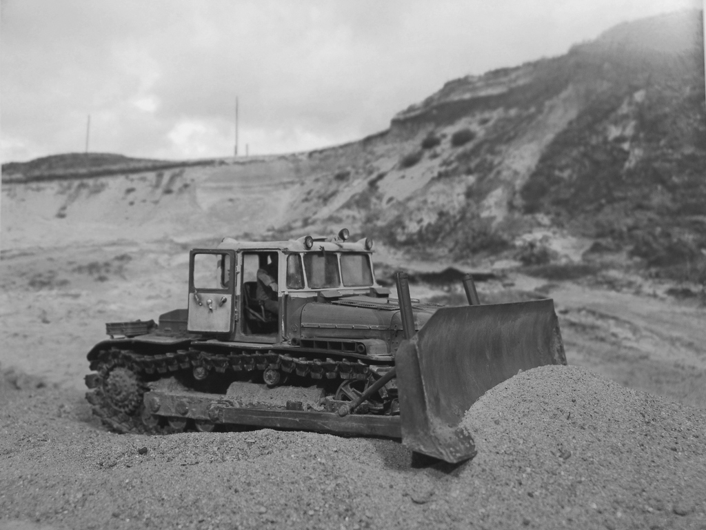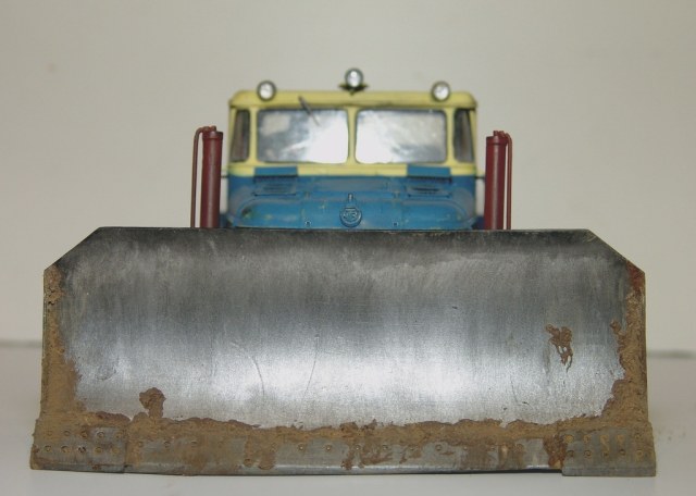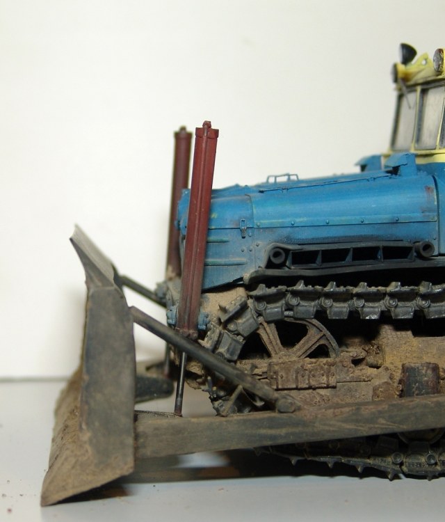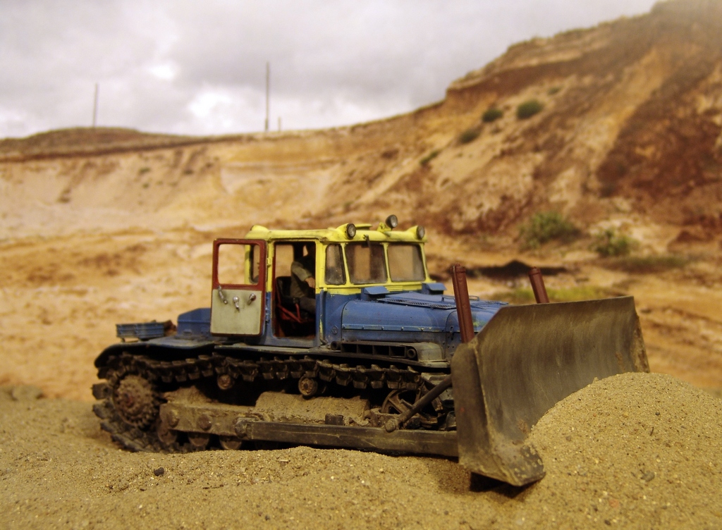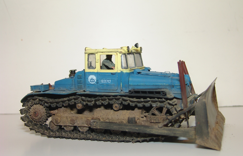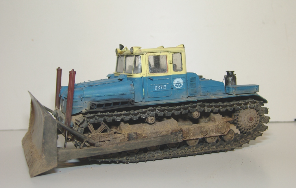 Закончил модель бульдозера ДЭТ-250. В своем роде легендарная машина, первый в мире тяжелый бульдозер построенный по дизель-генераторный схеме (практически Фердинанд-Элефант доктора Проше:) ) Такие машины были на всех великих стройках социализма, на строительстве ГРЭС, БАМе, крупнейших карьерах, ставился на восстановительные поезда. При этом, по словам эксплуатационщиков, машина была капризная и сложная по ремонту. Двигатель ходил до 1000 моточасов, масло жрал тонами, обладал повышенной пожароопасностью.. Но тем не менее выпускался ДЕТ-250 в различных модификациях с конца 50-х по настоящее время. И сейчас такую машину можно встретить в работе.