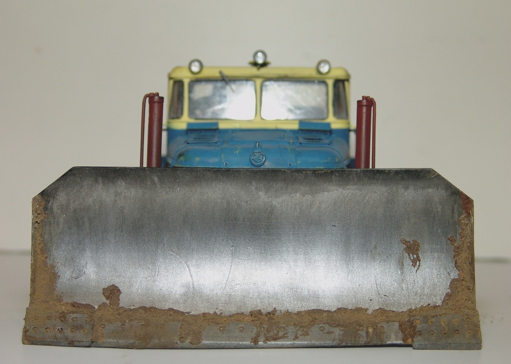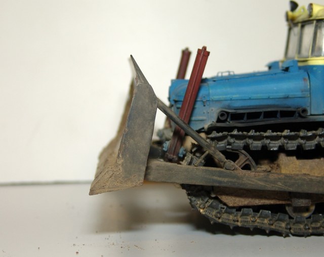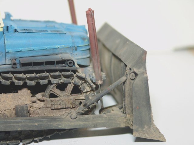 Антон все просто, во время съемки выскочило крепление штока гидроцилиндра к отвалу (не приклеил). Хорошо сразу заметил. Такая маленькая фигулька типа пальца, причем сразу потерялась (( Пришлось оперативно новую сделать и посадить на клей. Но первую фотку уже переснимать не стал.