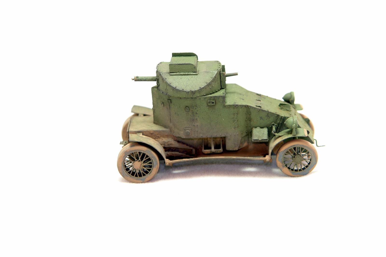Представляю вашему вниманию смоляную модель бронеавтомобиля Ланчестер в окрасе на 1917 год Российской армии. БА перевооружен пушкой Гочкиса, добавлен вентиляционный люк и прочие мелочи. По названию понятно, что броневик английский. Это второй тип пушечного БА в России на то время после Гарфорда.