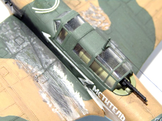 При этом, кроме дорожек - ни одного скола. Лючки не вскрываются ? Передние кромки крыльев не подвергаются внешним воздействиям ( снег, лёд, техсостав , их удаляющий при подготовке к вылету ), кабина пилотов не имеет сколов ни на переплётах фонаря, ни на бортах . То есть - самолёт весь грязный , будто пролетал года два, закоптился ( это при средней продолжительности карьеры на фронте в 25 вылетов). При этом персонал только бегал по крылу вдоль борта и ничего другого не делал. Логика... По технике же исполнения - неплохо. Разве что швы нужно заделывать, да передние кромки воздухозаборника облагородить. Пулемёт тоже на себя не похож - газоотводная трубка длинная или ствол короткий...