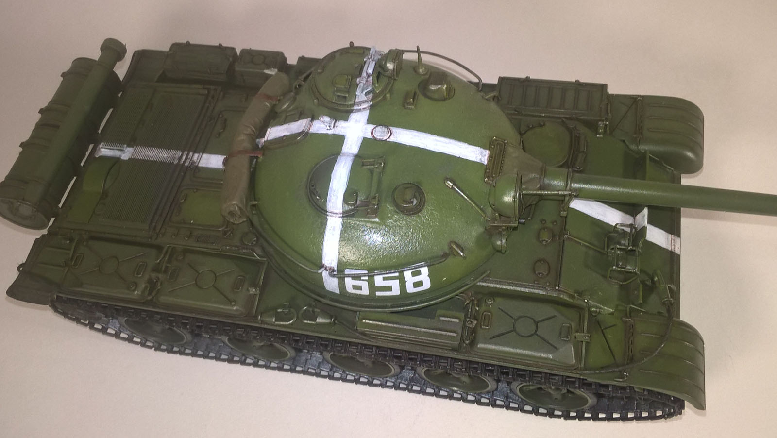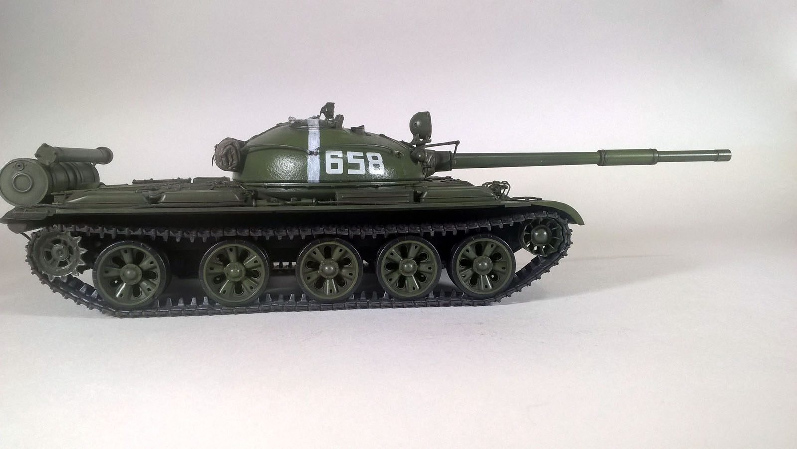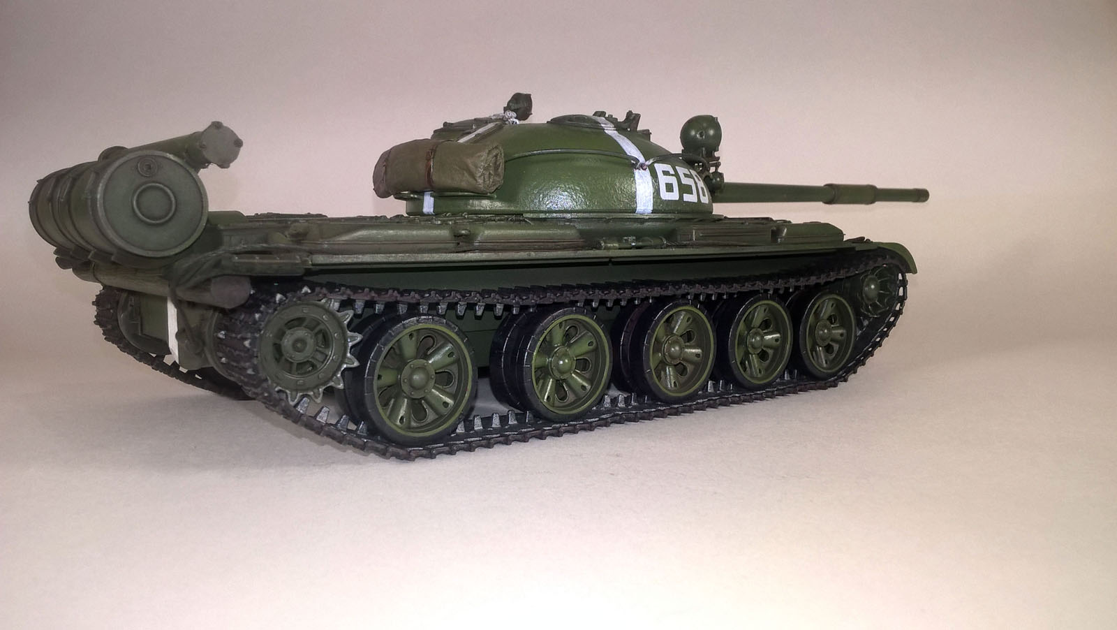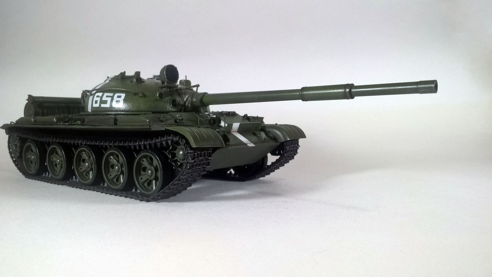 модель изображает танк участвовавший в операции *Дунай* по подавлению мятежа в ЧССР 21 августа 1968 года..по качеству модели сказать особо нечего..отлито аккуратно особых проблем со сборкой не было..пришлось удалить немного лишних деталей..добавить недостающие ..с матчастью в этом наборе у трубачей всё очень сложно..при постройке модели консультировался с участником событий с его слов матчасть вызывает некоторые вопросы но учитывая преклонный возраст возможно что то подзабылось хотя возможно и то что машины отличались в разных подразделениях в результате модернизации ..при постройке была использована авто шпатлевка и грунт ..плюс некоторое количество проволоки из компьютерных шлейфов и различные детали от наборов производителей SKIF и ZVEZDA