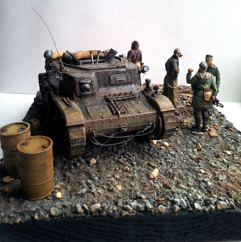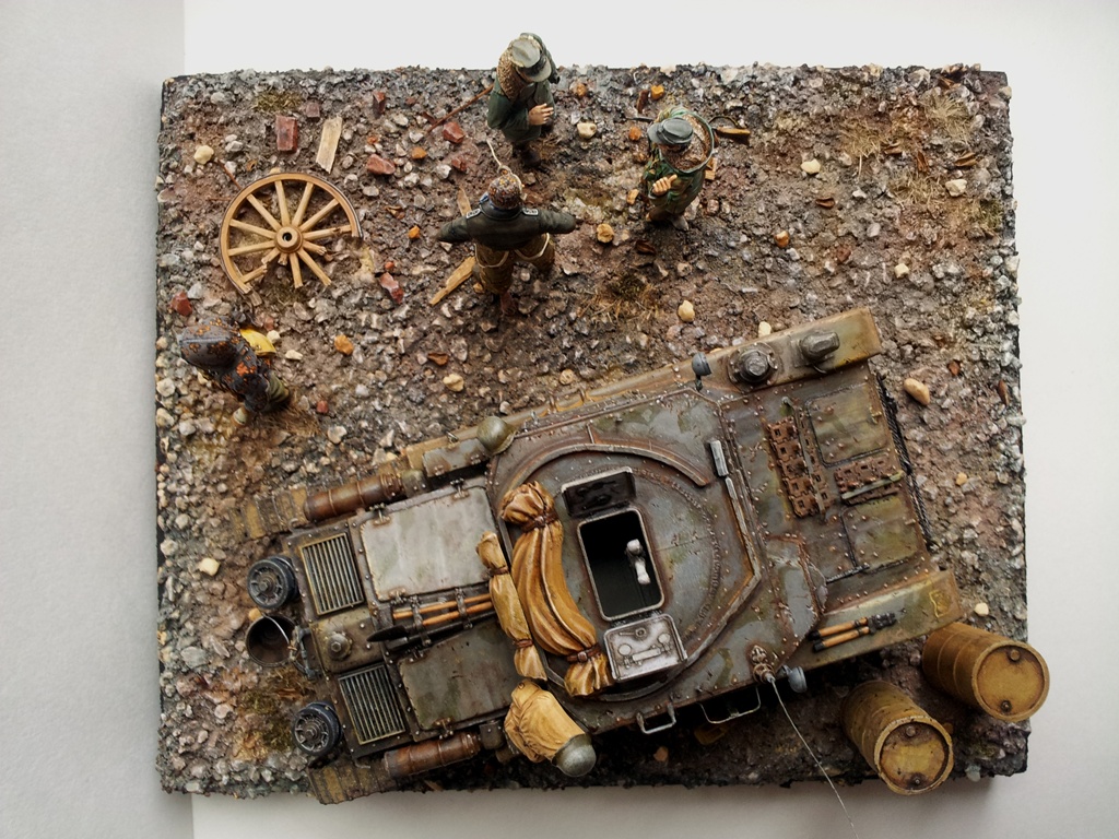 Используемые краски : Танк база - Мастер акрил, масло, пигменты. Фигурки - Темпера, акрил, эмаль, масло. Подставка - Акрил Звезда, масло, пигменты.