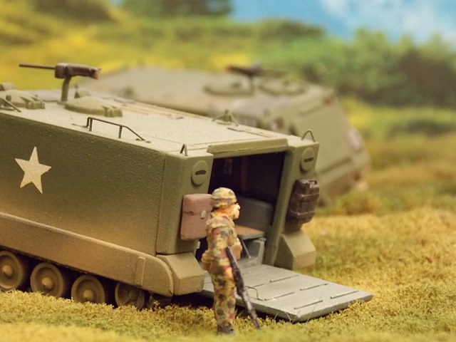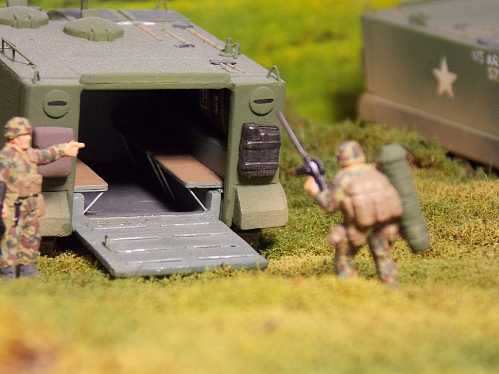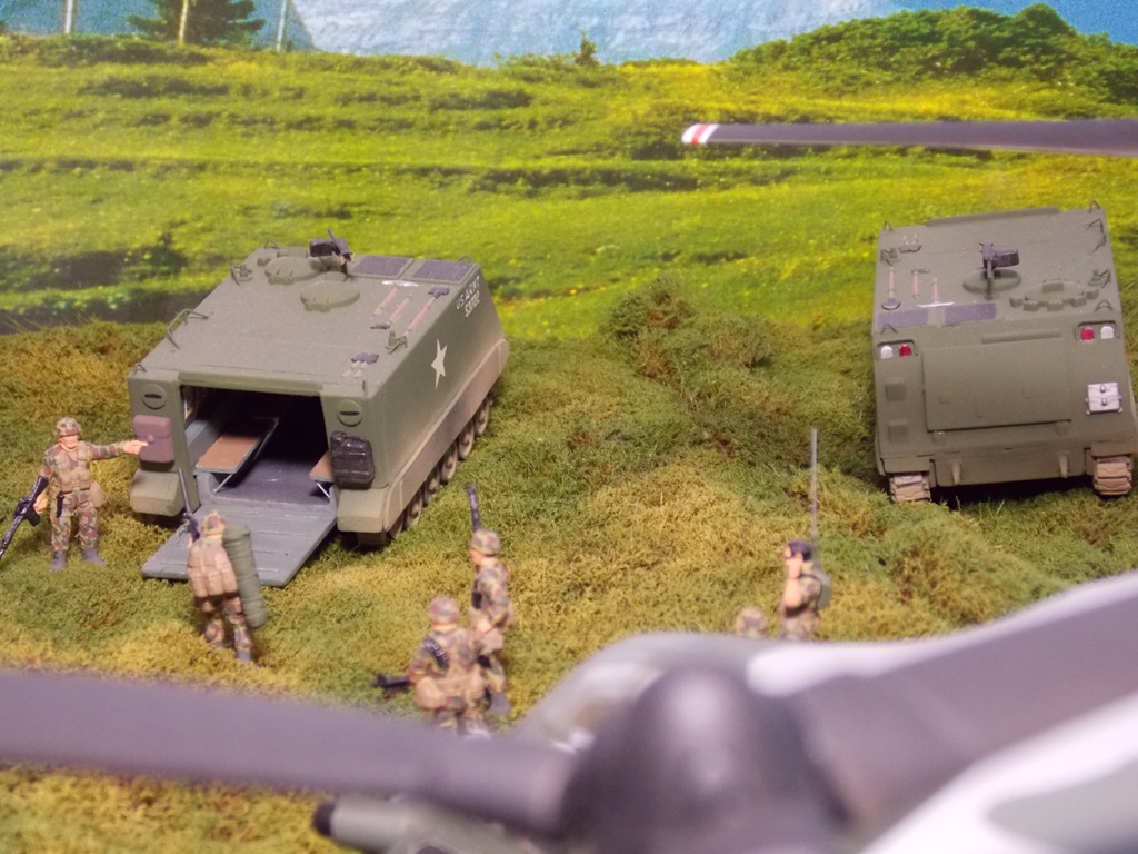 Хочу показать Вам одну из своих старых работ. Лет 20 назад, прогуливаясь в парке, обратил внимание на ровный участок мха, расположившегося на бетонном основании колеса обозрения. Это же готовый аэродром! Подцепив мох на лист фанеры, принёс домой. Рассмотрев свою находку более внимательно, пришёл к выводу, что в моём любимом 72 масштабе аэродром не получится, рельеф слишком сложный. После полного высыхания мха, мой аэродром повело ещё больше. Вскоре удалось приобрести конвертоплан V-22 Osprey от фирмы ESCI, в одном из магазинов на глаза попался М113 какого-то Самарского кооператива, купил парочку. В Москве на клубе приобрёл фигурки американских десантников, в пакетике с лепестком без названия производителя, но с вариантами пустынного и европейского камуфляжа. И дело пошло. Сначала подобрал задний фон от какого-то плаката календаря и и покрасил из аэрографа нитрокраской нескольких оттенков мох. На основании из ДВП сформировал поляну с задним фоном.