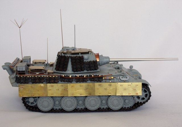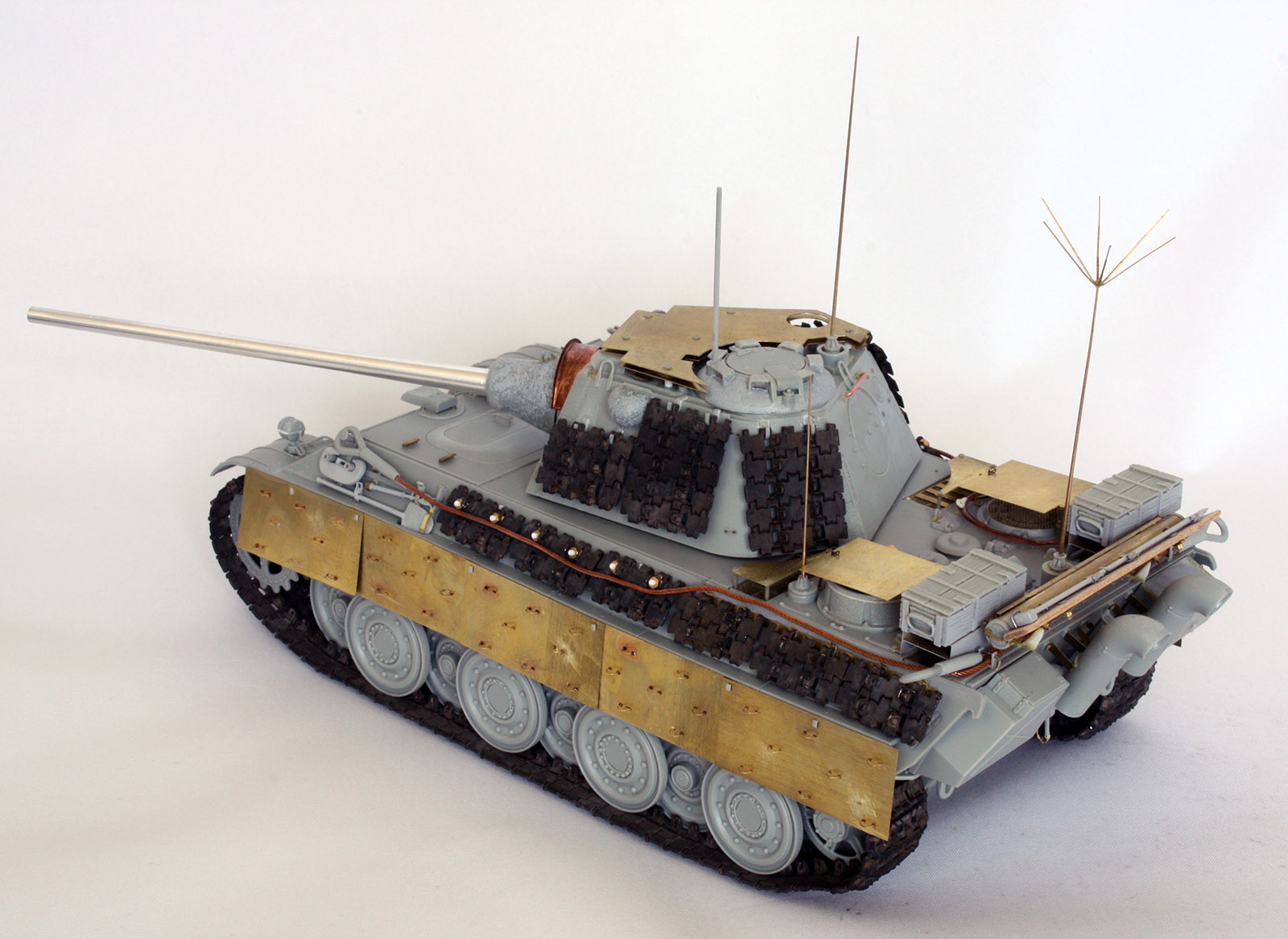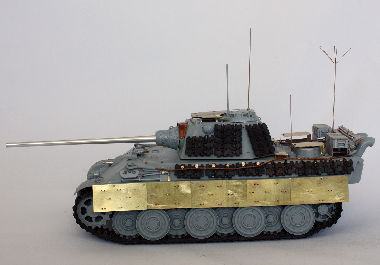 4. VoyagerPEA138 1/35 WWIIGermanPantherG/F/IISideSkirtsLateProduction (ForDRAGONKit) – травлёные бортовые экраны с петлями для растительного камуфляжа. Экраны хорошие, но например штатные кронштейны для их монтажа пришлось немного смещать – не хотели они вставать ровно в ряд;