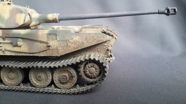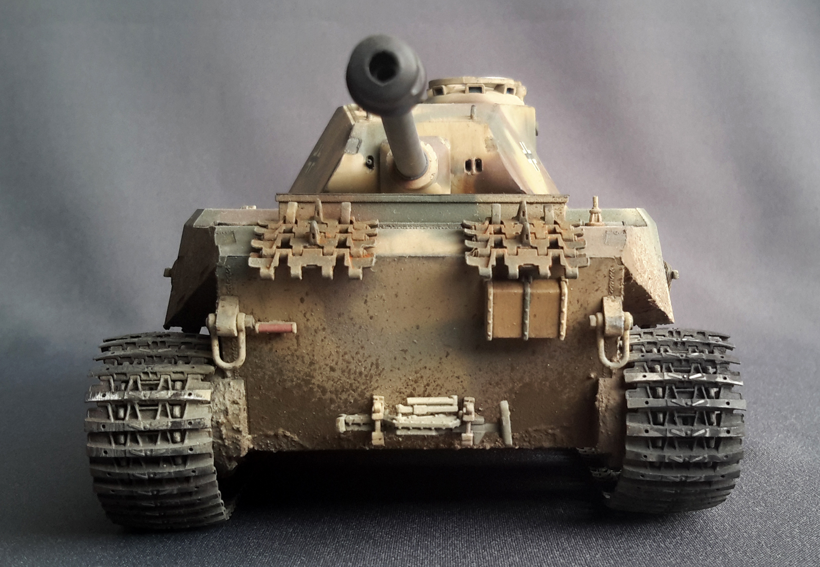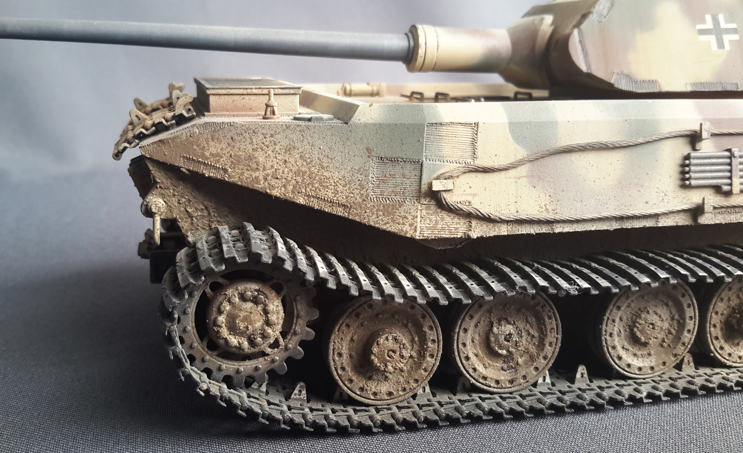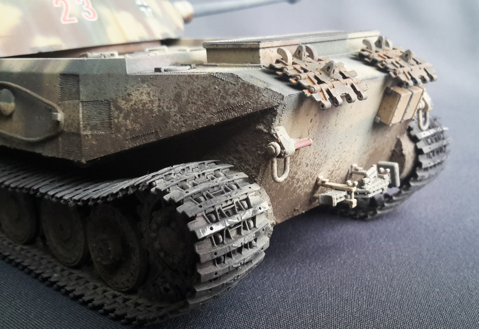 Было бы мне кажется интересней, если чуть разнообразить грязь (ходовка вообще вся слилась в один цвет), гусеницам добавить блеска и всё-же использовать травление или просто тонкий пластик для крепежа навесного и шанца.