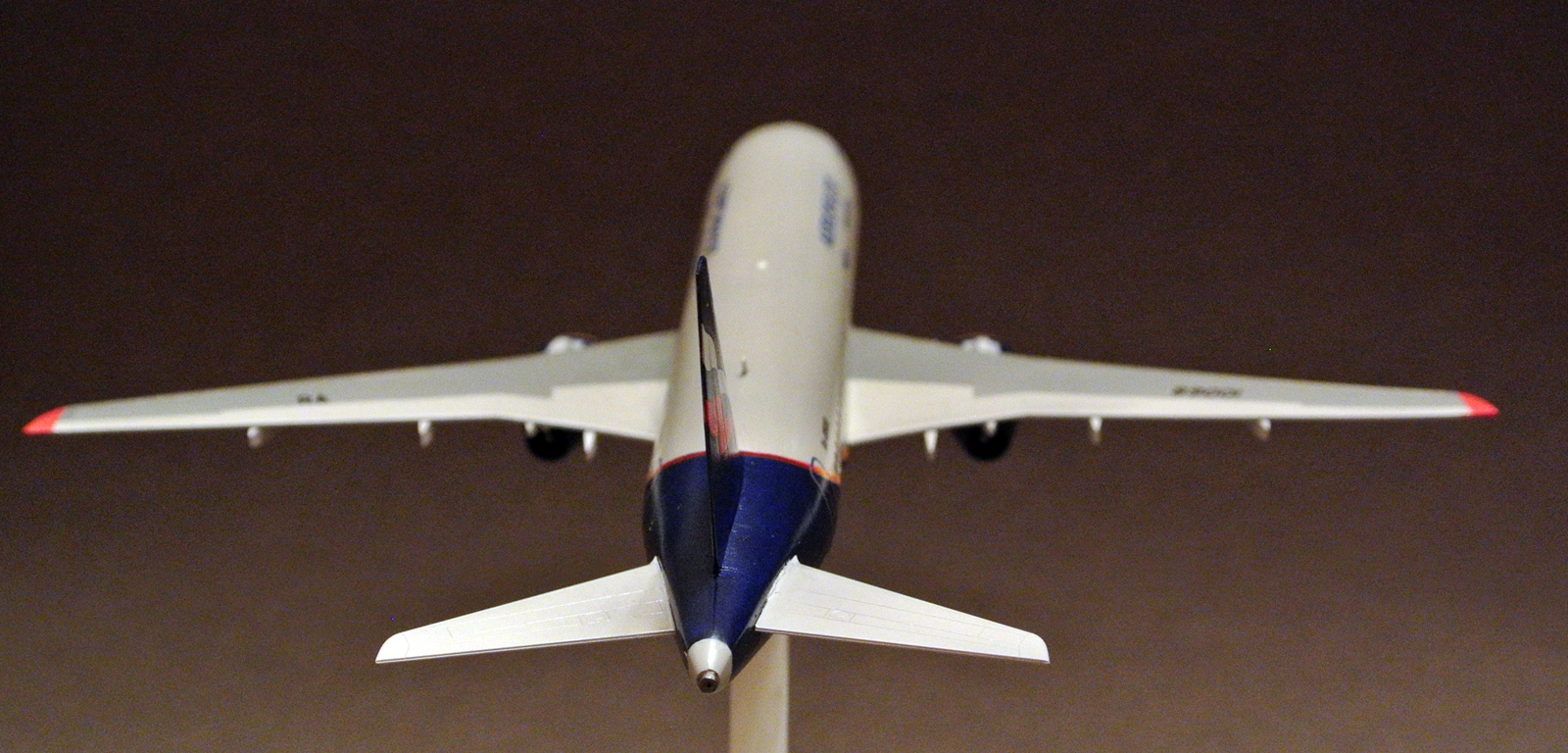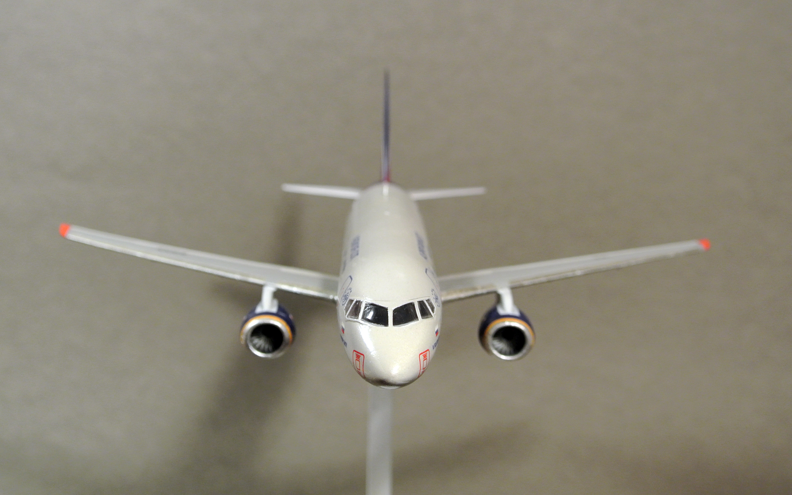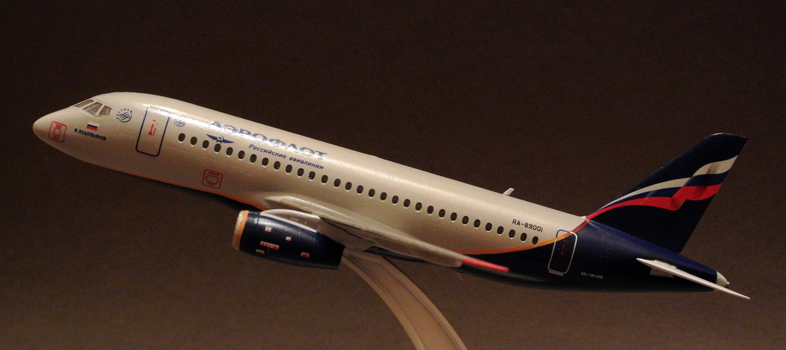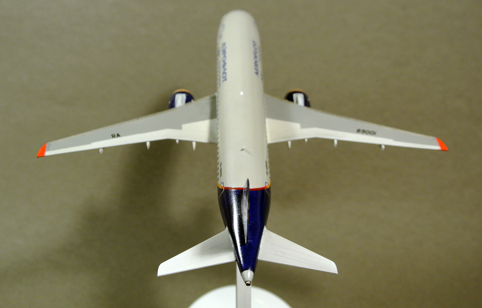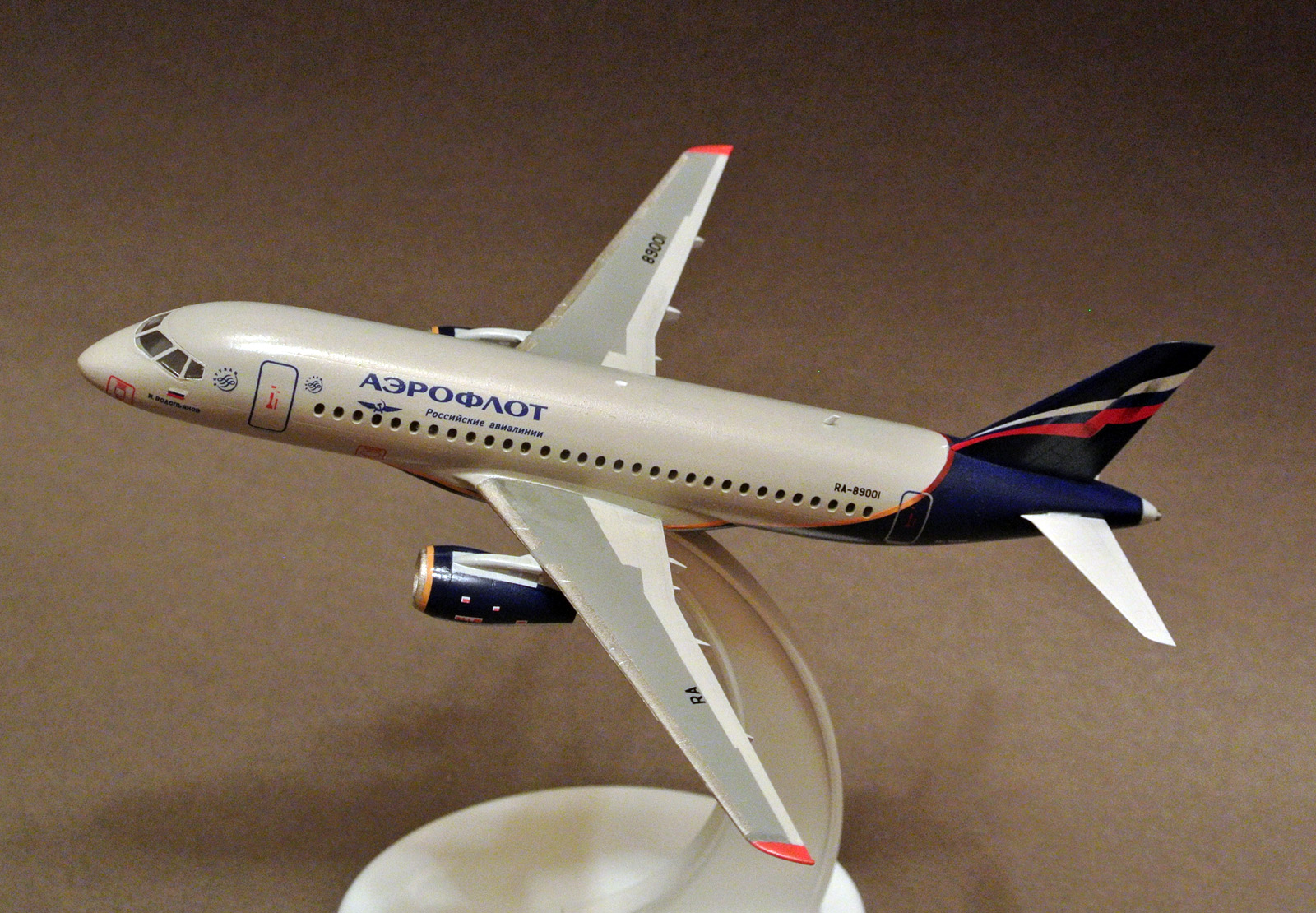 Моя первая попытка собрать что-то из гражданской авиации. Первоначально планировалась как сувенир на работу жене - она работает на предприятии, где производят двигатели для данного самолета, но не срослось. Из доработок - только сопло ВСУ. Иллюминаторы сделаны клеем Акан Аква для прозрачных деталей. Окраска - Мастер Акрил, глянцевый лак от этого же производителя.