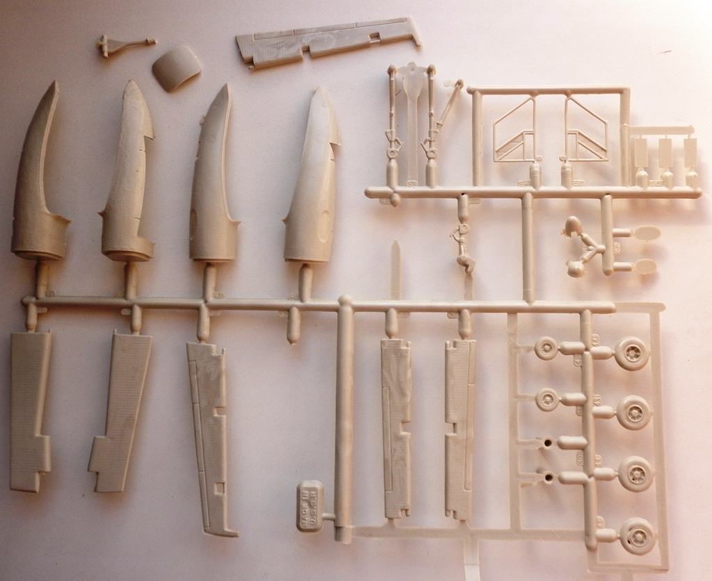 Пластик... Первая моя модель этого самолета почти не имела дефектов литья. Была отлита из "фирменного " кругозоровского белого пластика. Отливка от "Макета" имеет бежевый оттенок, много утяжин и облоя. Местами есть неоднородность материала ( вкрапления темного пластика).