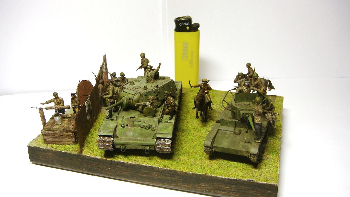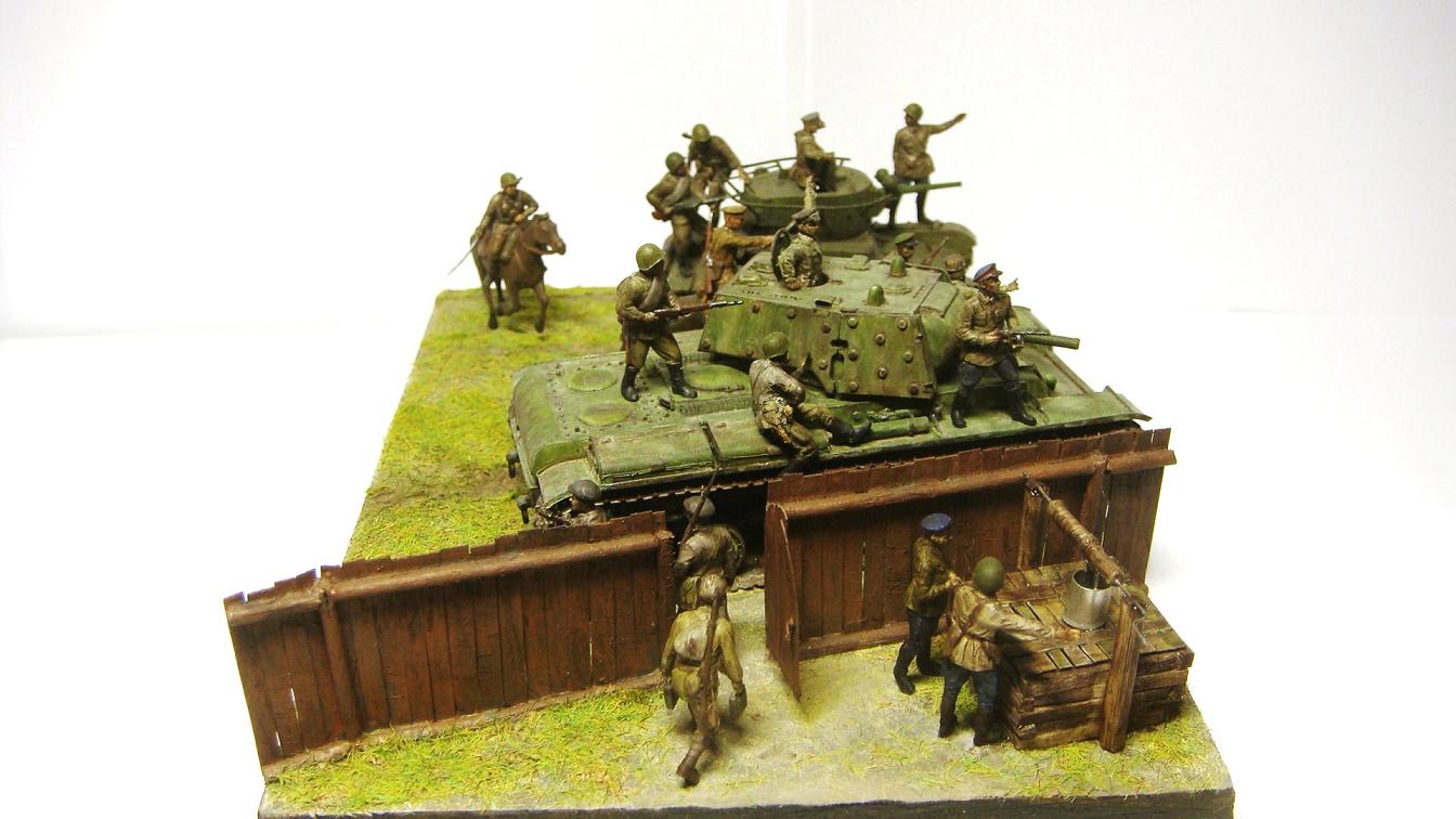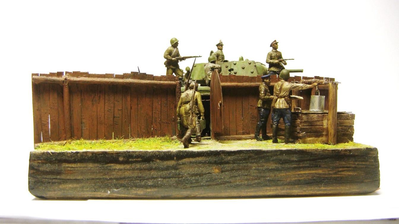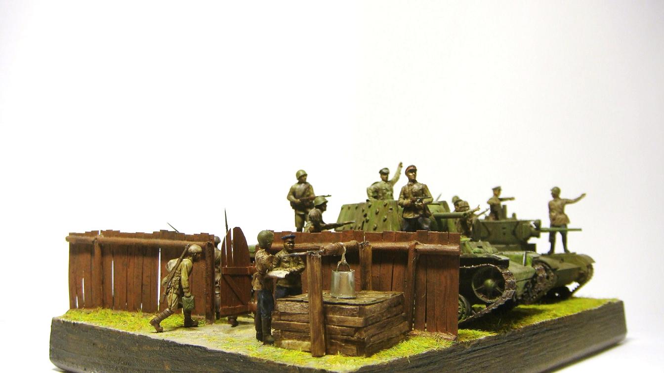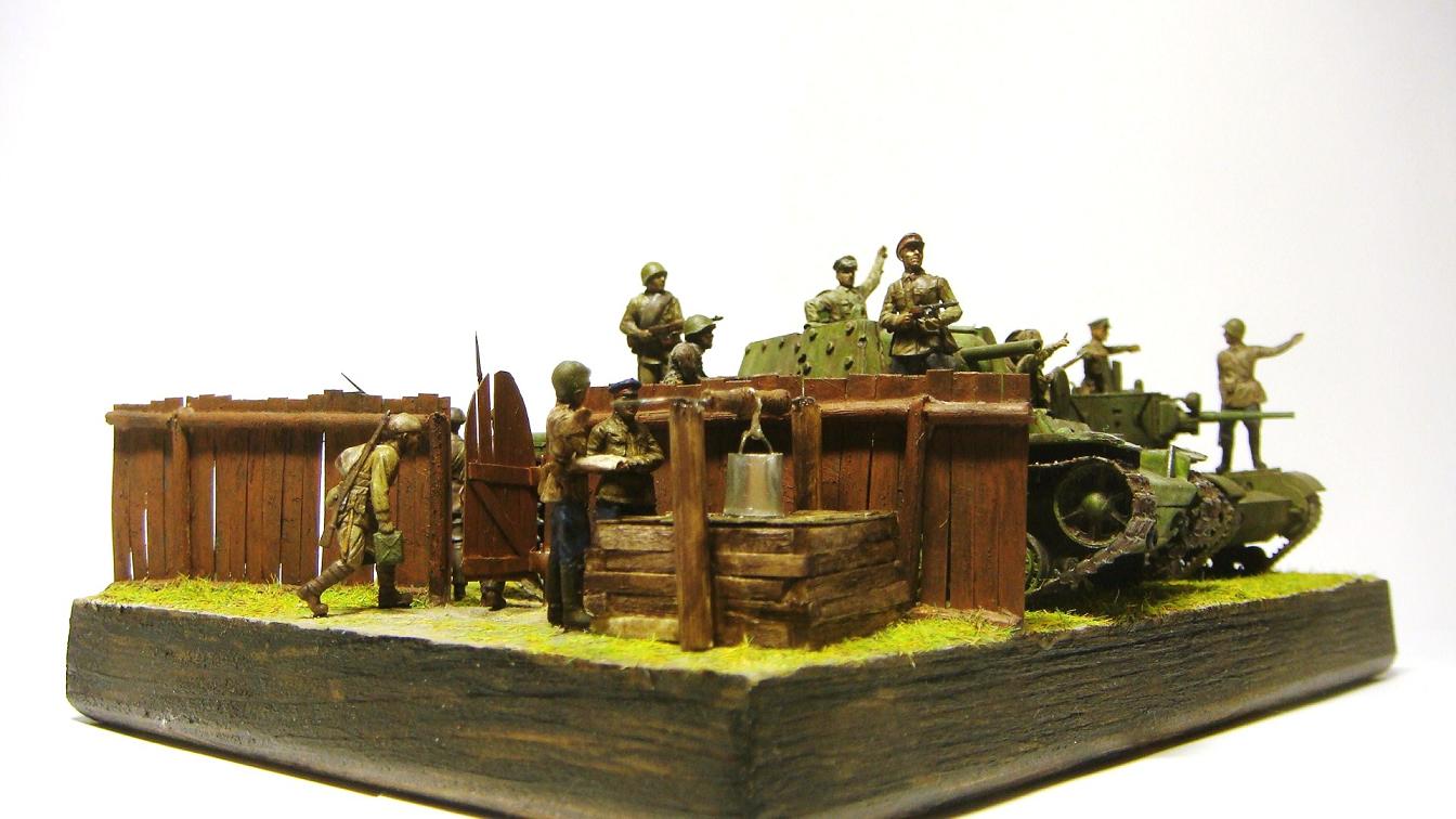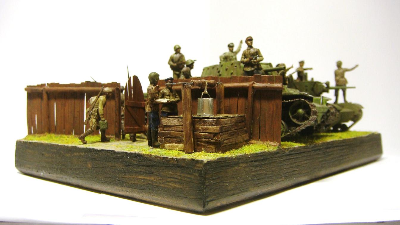 У меня ощущение, что на диораме "тесновато", каваллеристы выглядят там чуждо. Понятно, что лето 41 хаос и все такое, но у танкистов должны быть шлемофоны. Получилось, как то не очень удачно, по сравнению с предыдущими работами. Ведро у колодца очень большое, сруб колодца из бруса, обычно все таки на колодцы кругляк идет, фигурки поблескивают. Вроде бы и ругать не за что, все аккуратно, но что то не то.