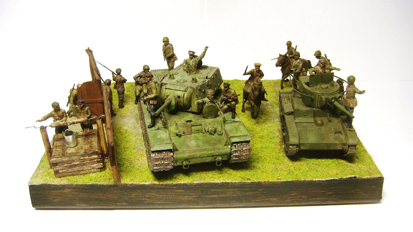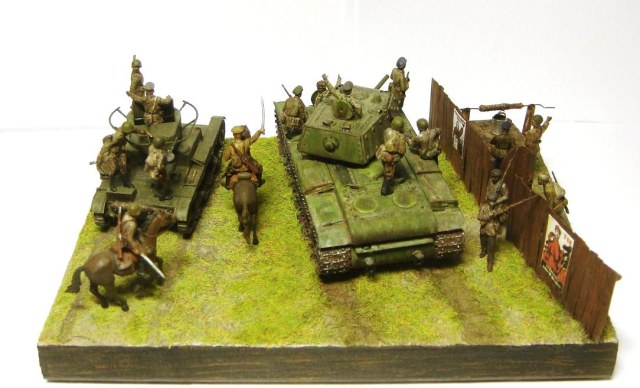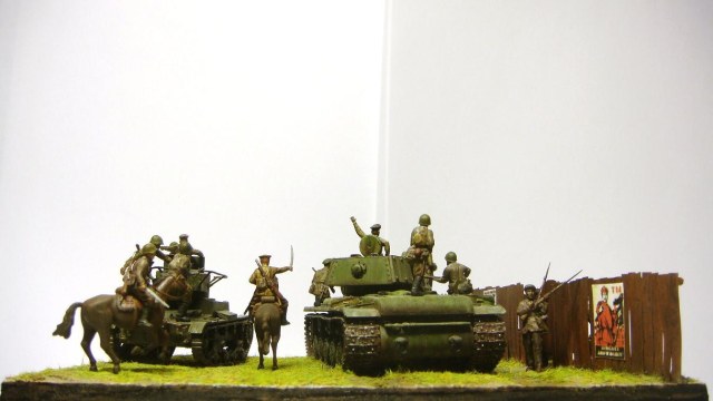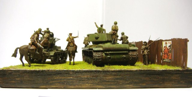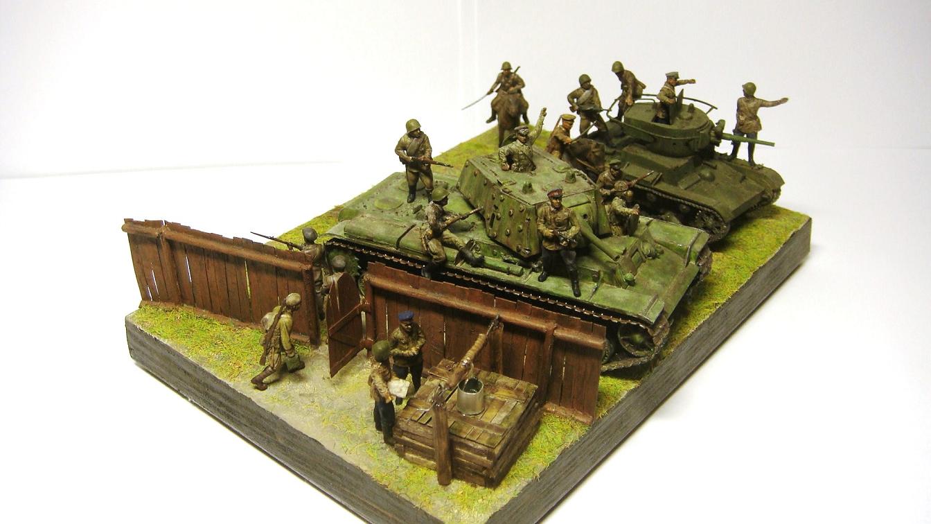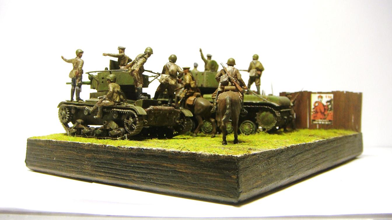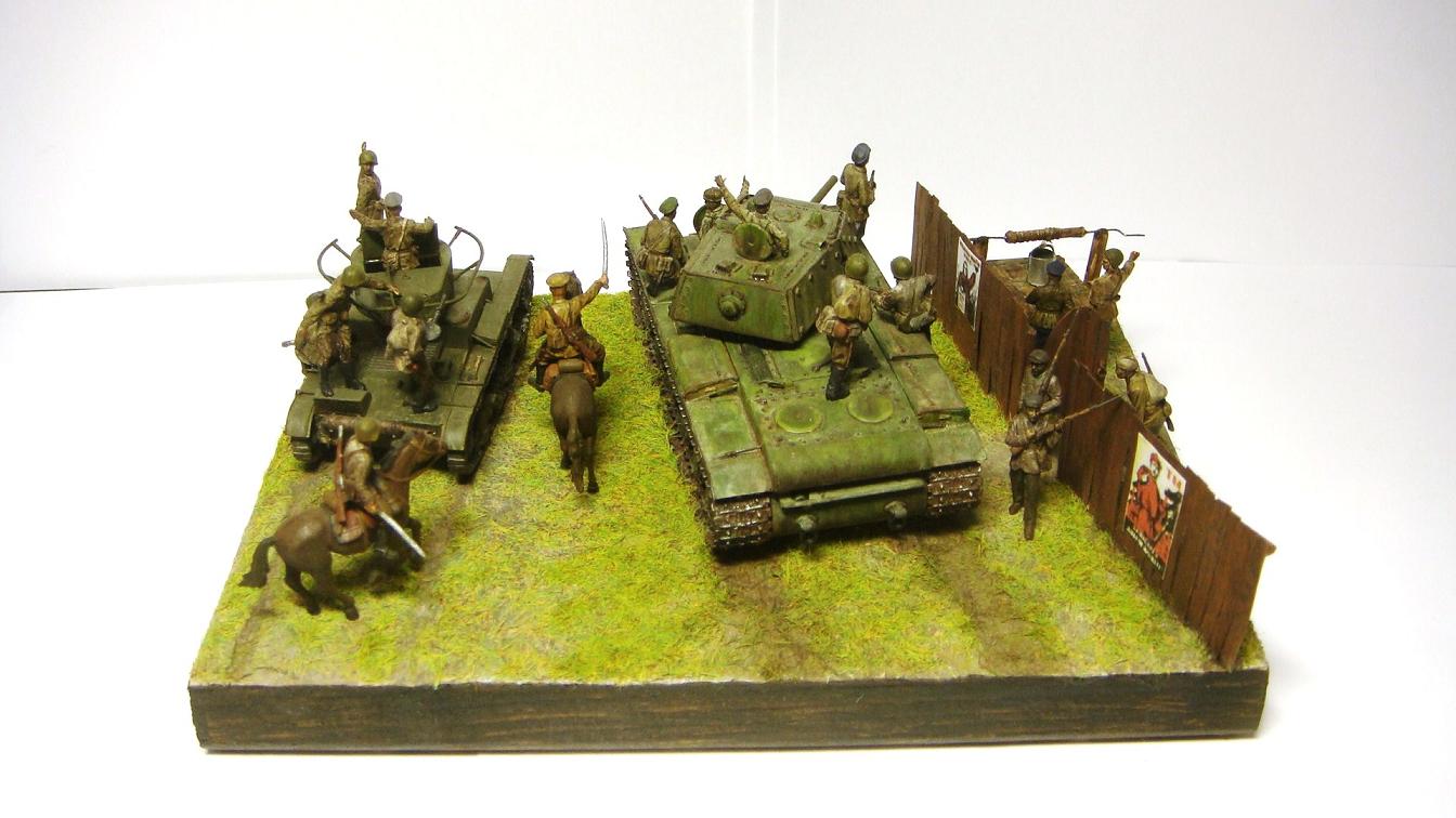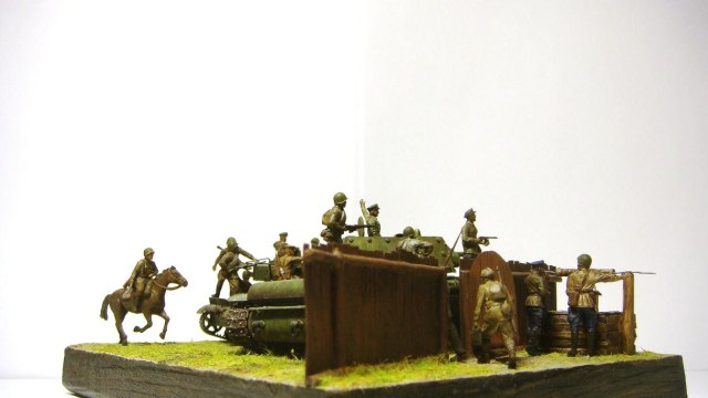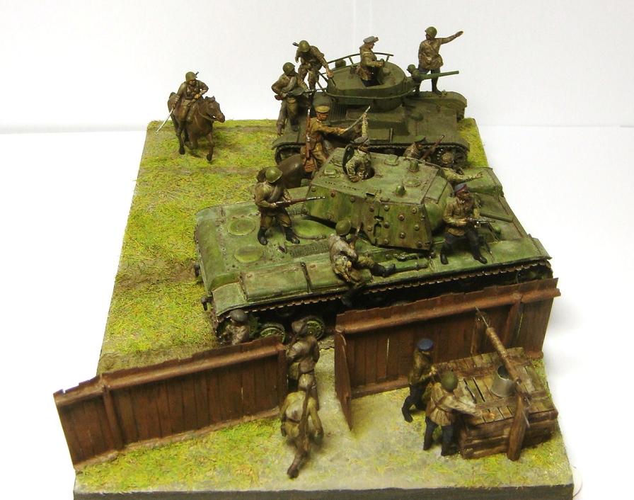 У меня ощущение, что на диораме "тесновато", каваллеристы выглядят там чуждо. Понятно, что лето 41 хаос и все такое, но у танкистов должны быть шлемофоны. Получилось, как то не очень удачно, по сравнению с предыдущими работами. Ведро у колодца очень большое, сруб колодца из бруса, обычно все таки на колодцы кругляк идет, фигурки поблескивают. Вроде бы и ругать не за что, все аккуратно, но что то не то.