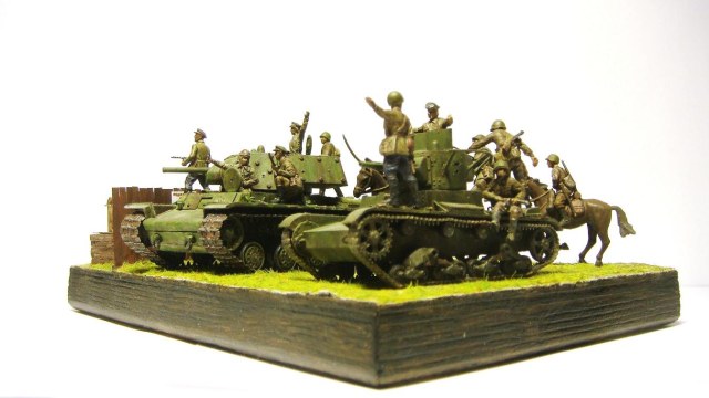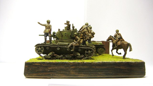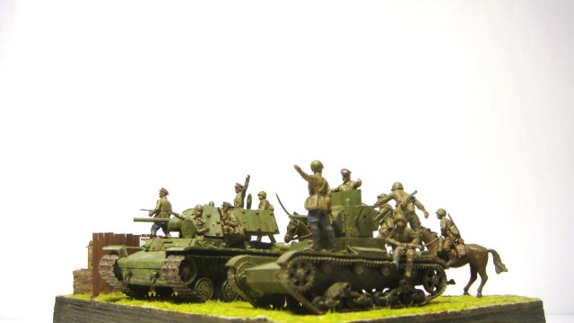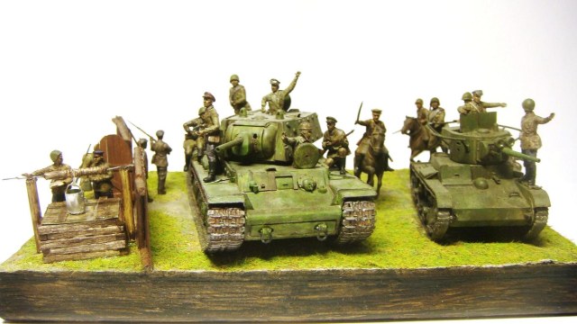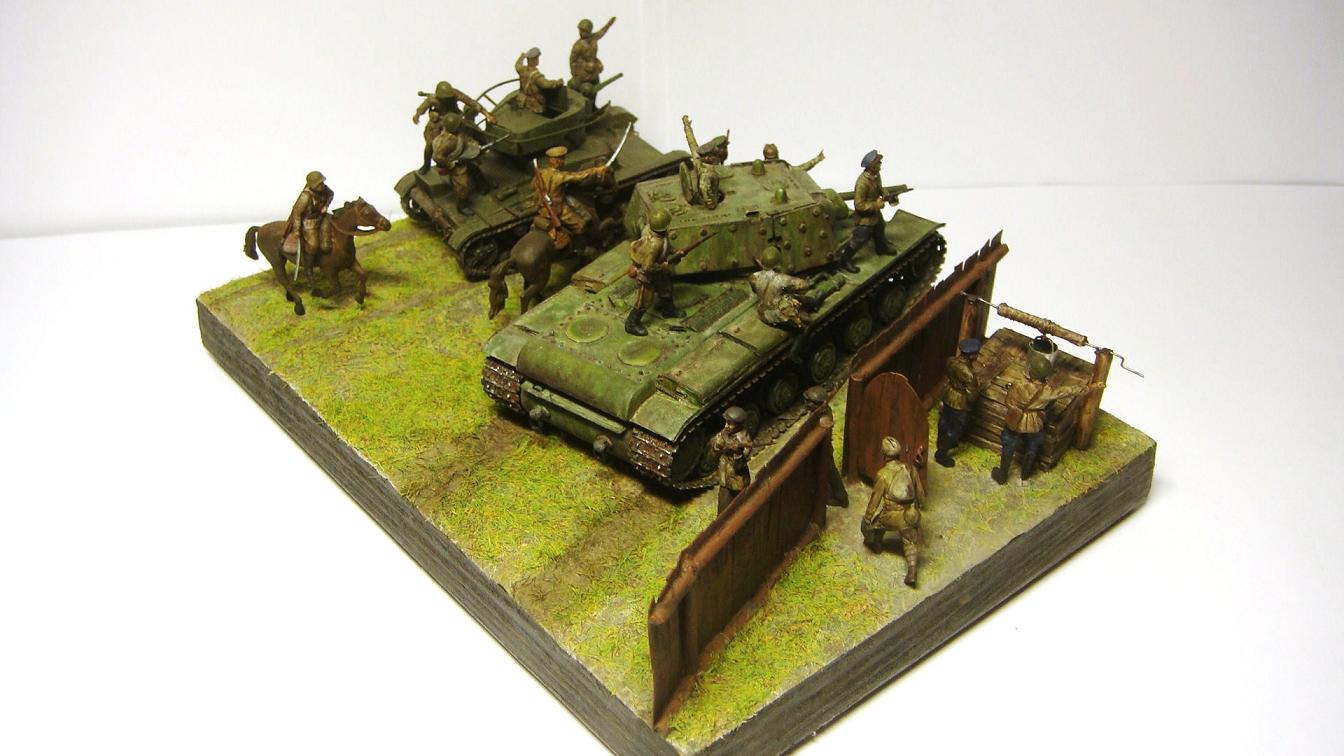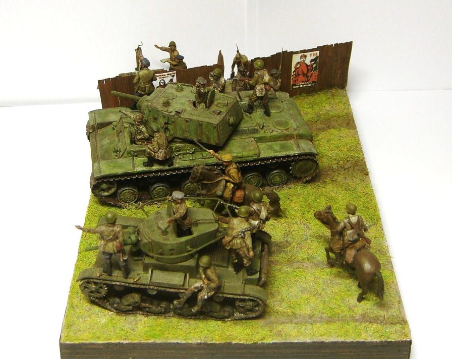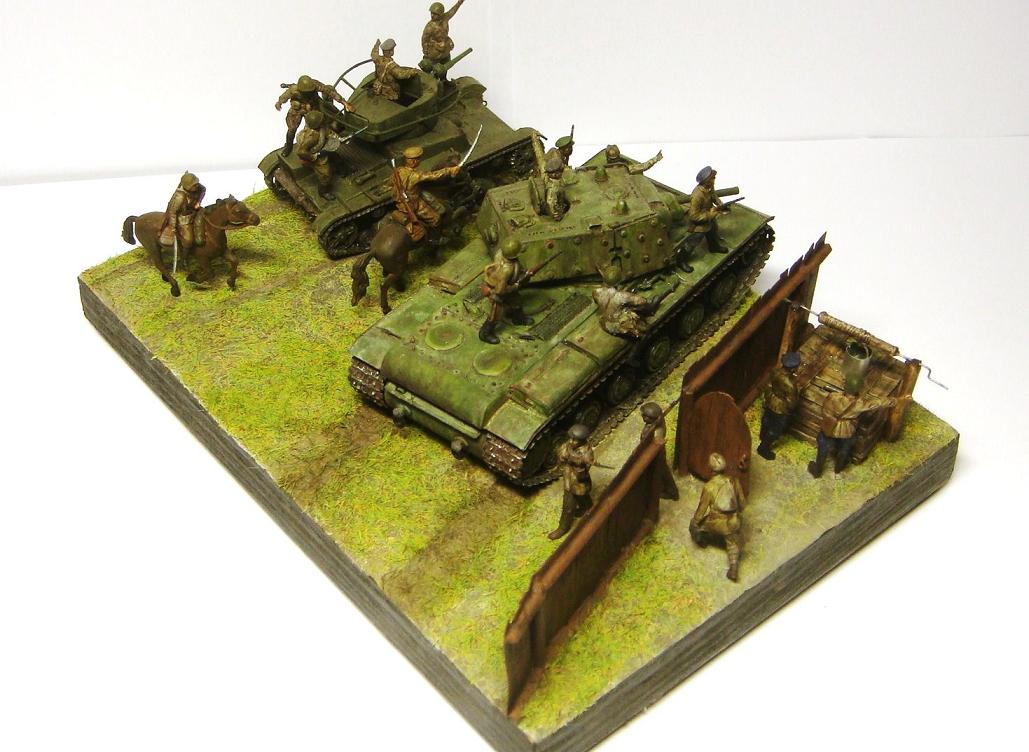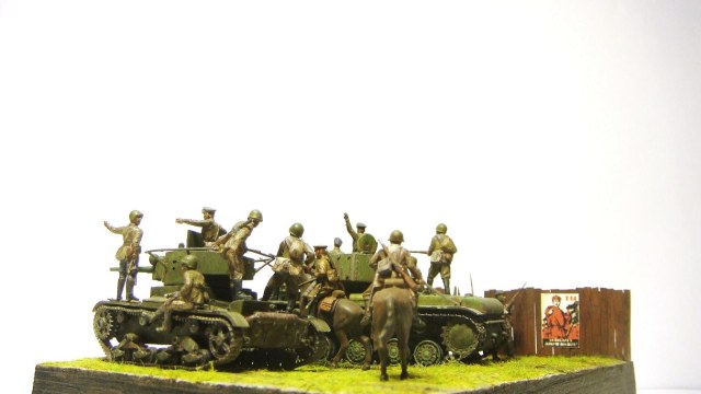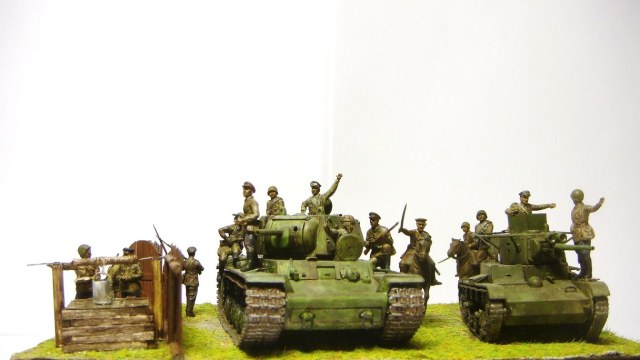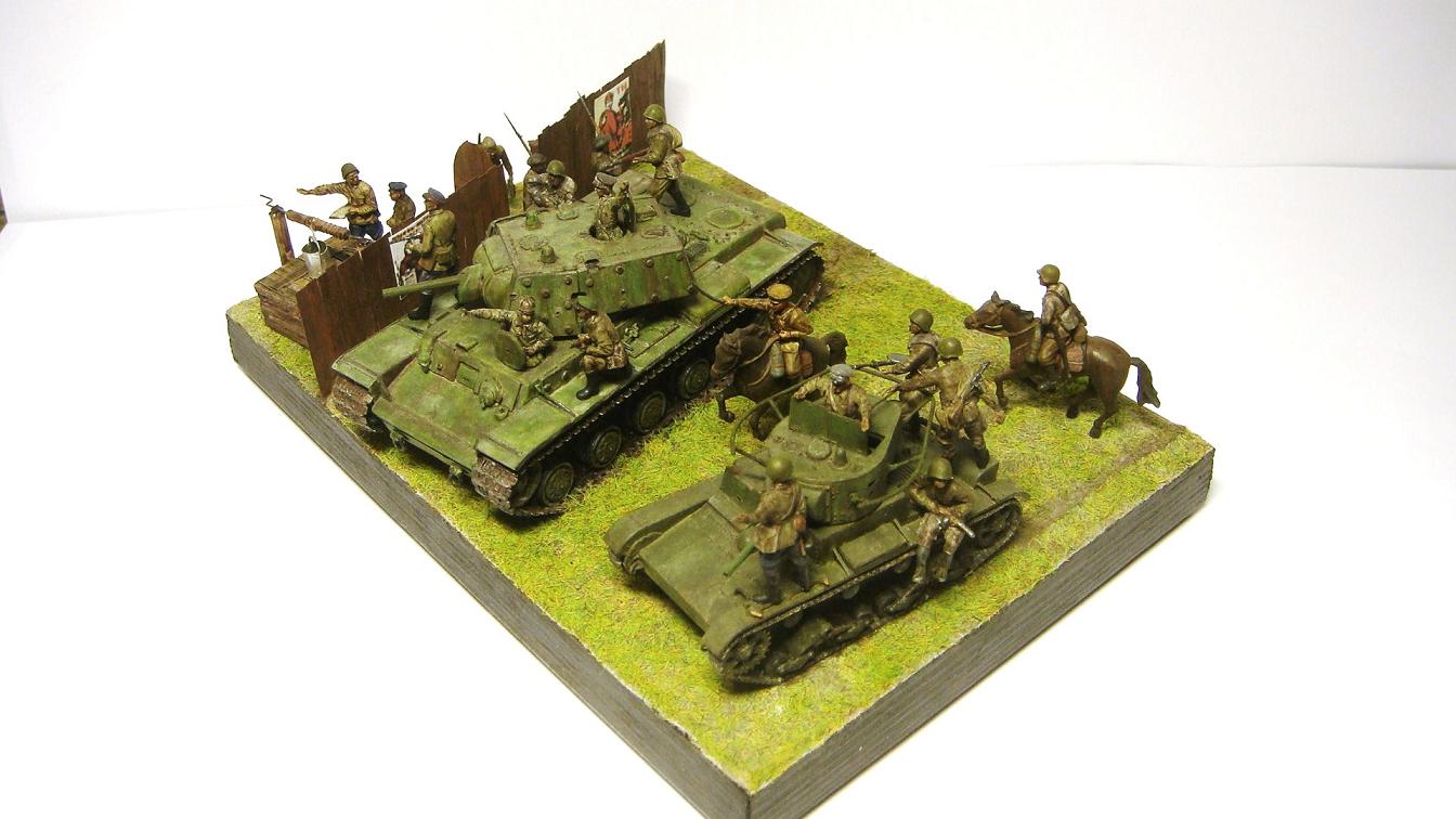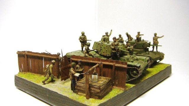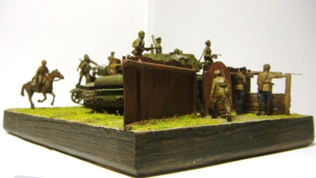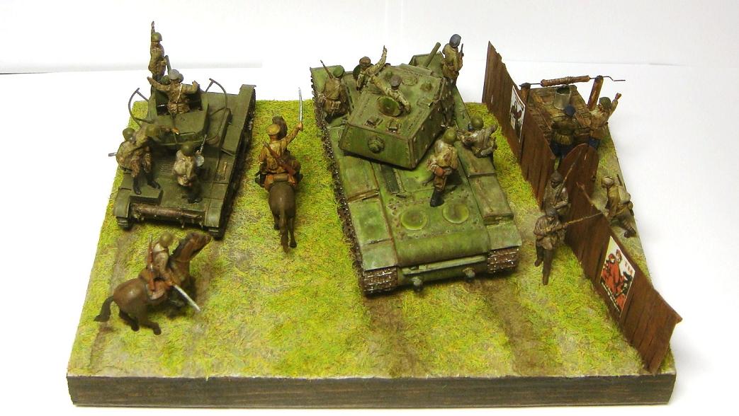 У меня ощущение, что на диораме "тесновато", каваллеристы выглядят там чуждо. Понятно, что лето 41 хаос и все такое, но у танкистов должны быть шлемофоны. Получилось, как то не очень удачно, по сравнению с предыдущими работами. Ведро у колодца очень большое, сруб колодца из бруса, обычно все таки на колодцы кругляк идет, фигурки поблескивают. Вроде бы и ругать не за что, все аккуратно, но что то не то.
