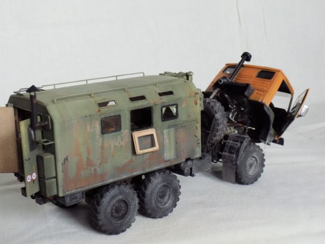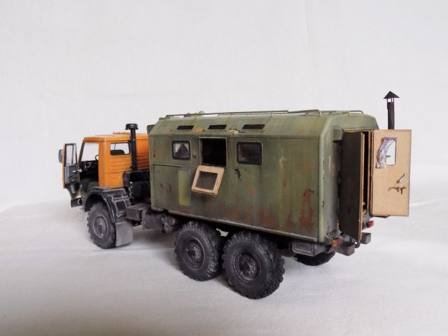 Однако, такая конструкция - скорее выход из безысходного положения, т.к. в следствие каких-то непреодолимых причин на КАМАЗ поставили кунг от ЗиЛ-131. Я, конечно же понимаю, что такие случаи в жизни случались ( да и в комментарии Игоря (Panzer 72) это упомянуто ), но, на мой взгляд, самодельный штатный кунг смотрелся бы куда интересней.