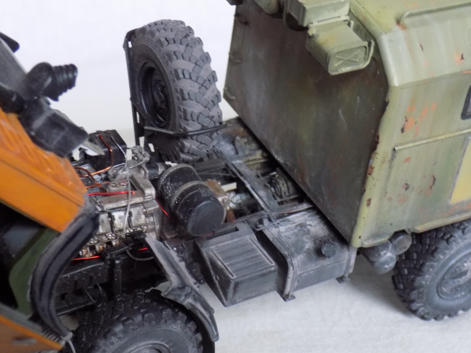 Простите, но мне работа не понравилась - слабоватая работа с пигментами, кабина выглядит как у игрушки. колеса неубедительно запачканы, да и вообще окраске и тонировке уделено гораздо меньше внимания чем сборке, и это все портит. Извините, если обидел
