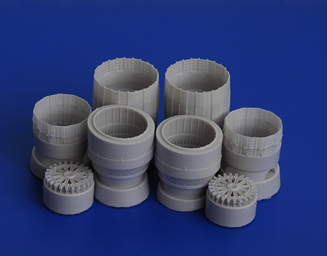 Итак, набор AMG 48011 - сопла реактивного двигателя РД-33 самолета МиГ-29. В комплекте поставляется восемь отливок из светло-серой полиуретановой смолы.
