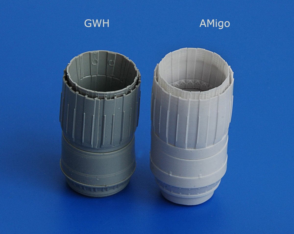 Как мы видим, членение такое же, как и в масштабе 1/72, но проработка мелочевки соответствует 48-му масштабу. Так же, изменен посадочный элемент сопла. На предоставленных снимках видно, что оно прекрасно садится на элемент двигателя из набора от Great Wall Hobby, для которого набор и рекомендован.