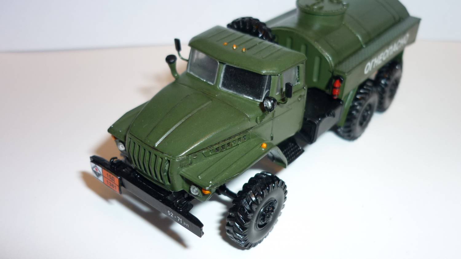 Сразу отмечу свои косяки. Нет перил на цистерне (очень хрупкий пластик сразу сломался в процессе сборки), нет заднего номера на бампере (его честно говоря и в наборе не было, был отломан от литника), ну и по покраске конечно же не все идеально.