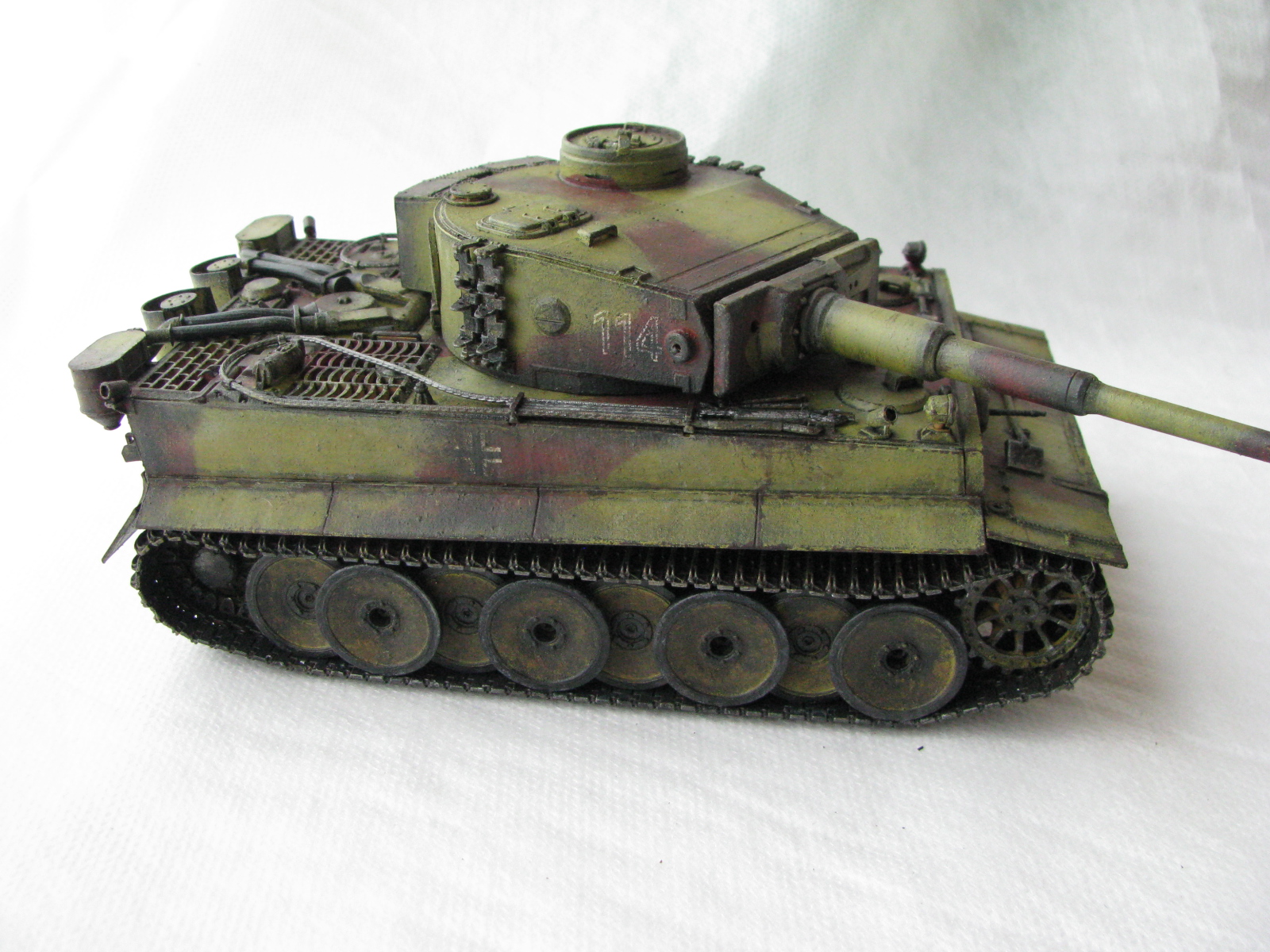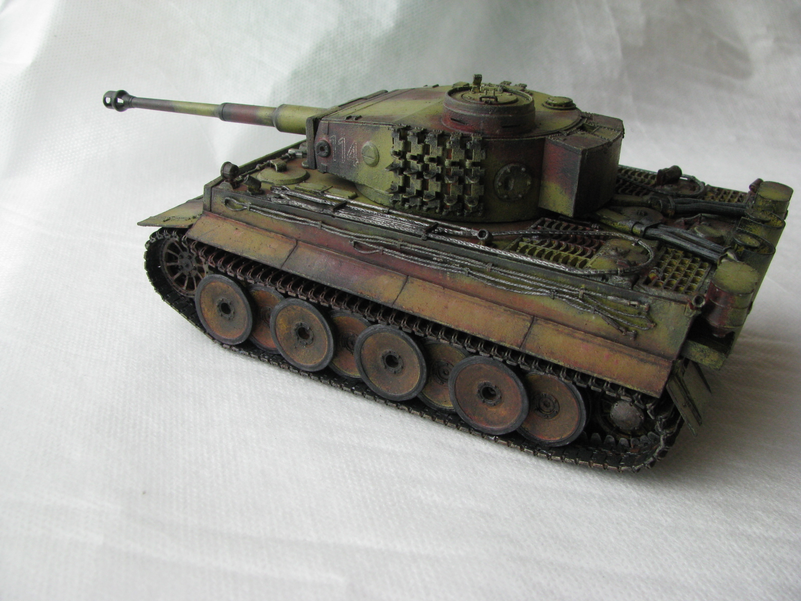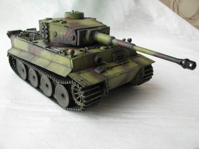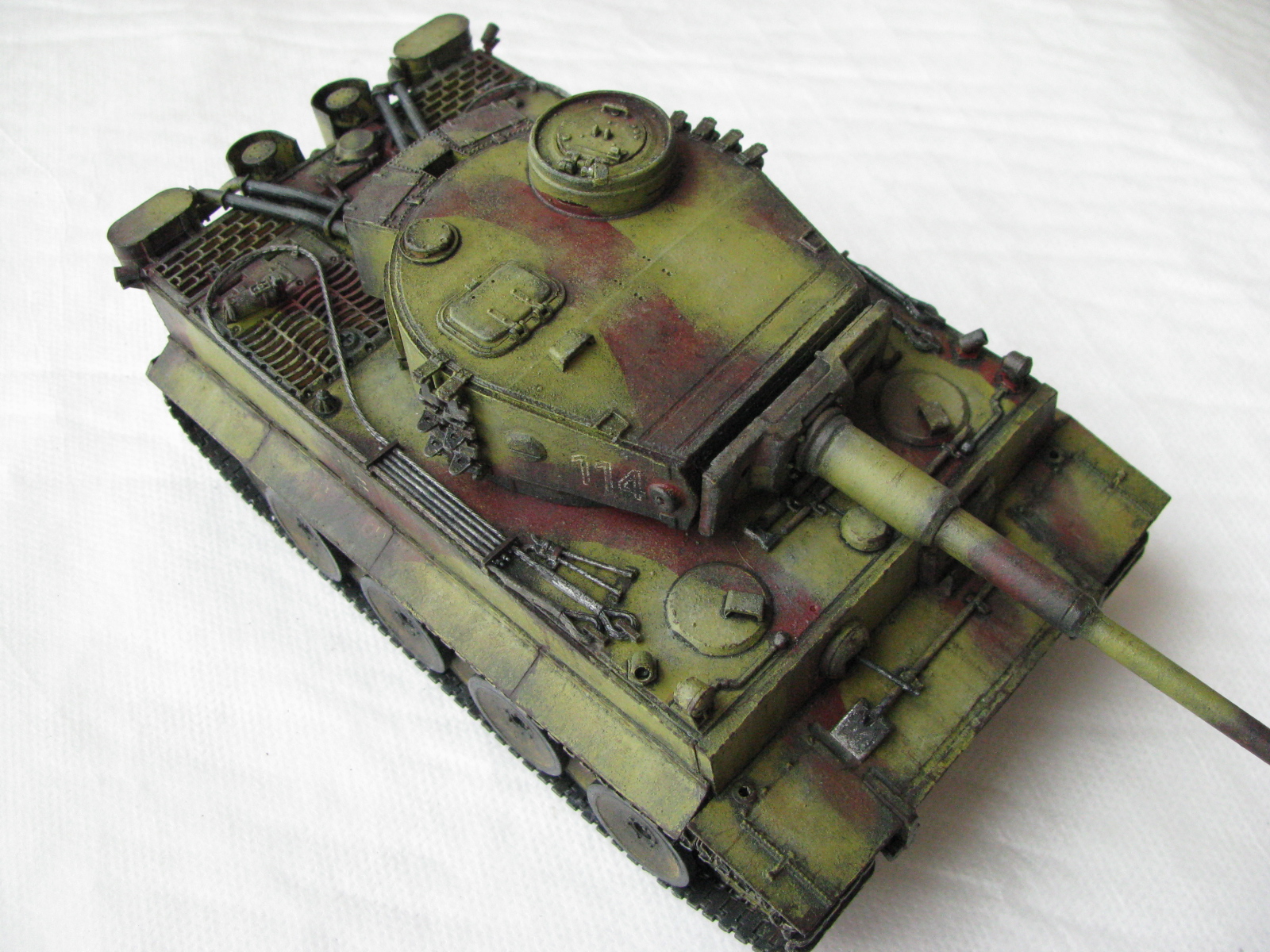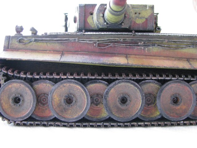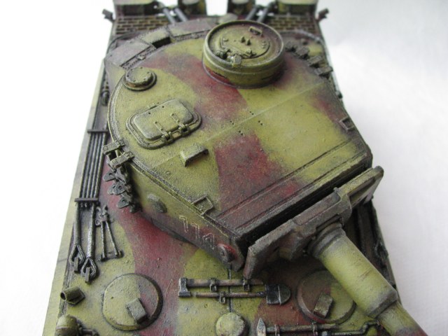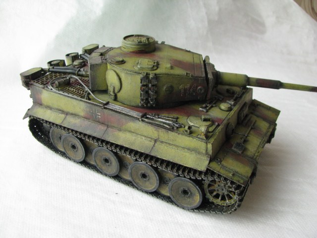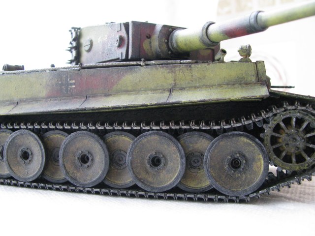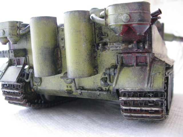 Вот теперь фото гораздо лучше. Предположения про недостающие детали оказались верными. Так же видны щели на стыках бронелистов, там где сварные швы должны быть. Гранатометы можно было высверлить, они немасштабно толстые. Сетки на решетках МТО вещь для Тигров обязательная. Ну и очень грубая покраска, под слоем краски много мусора, комочков и т.д.