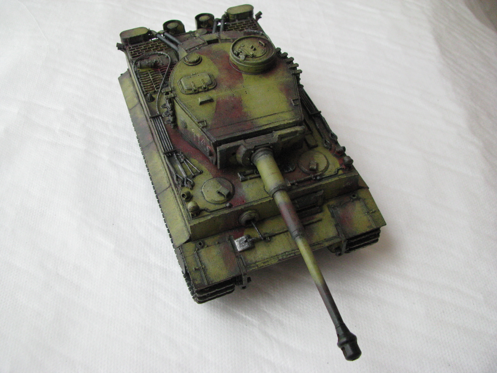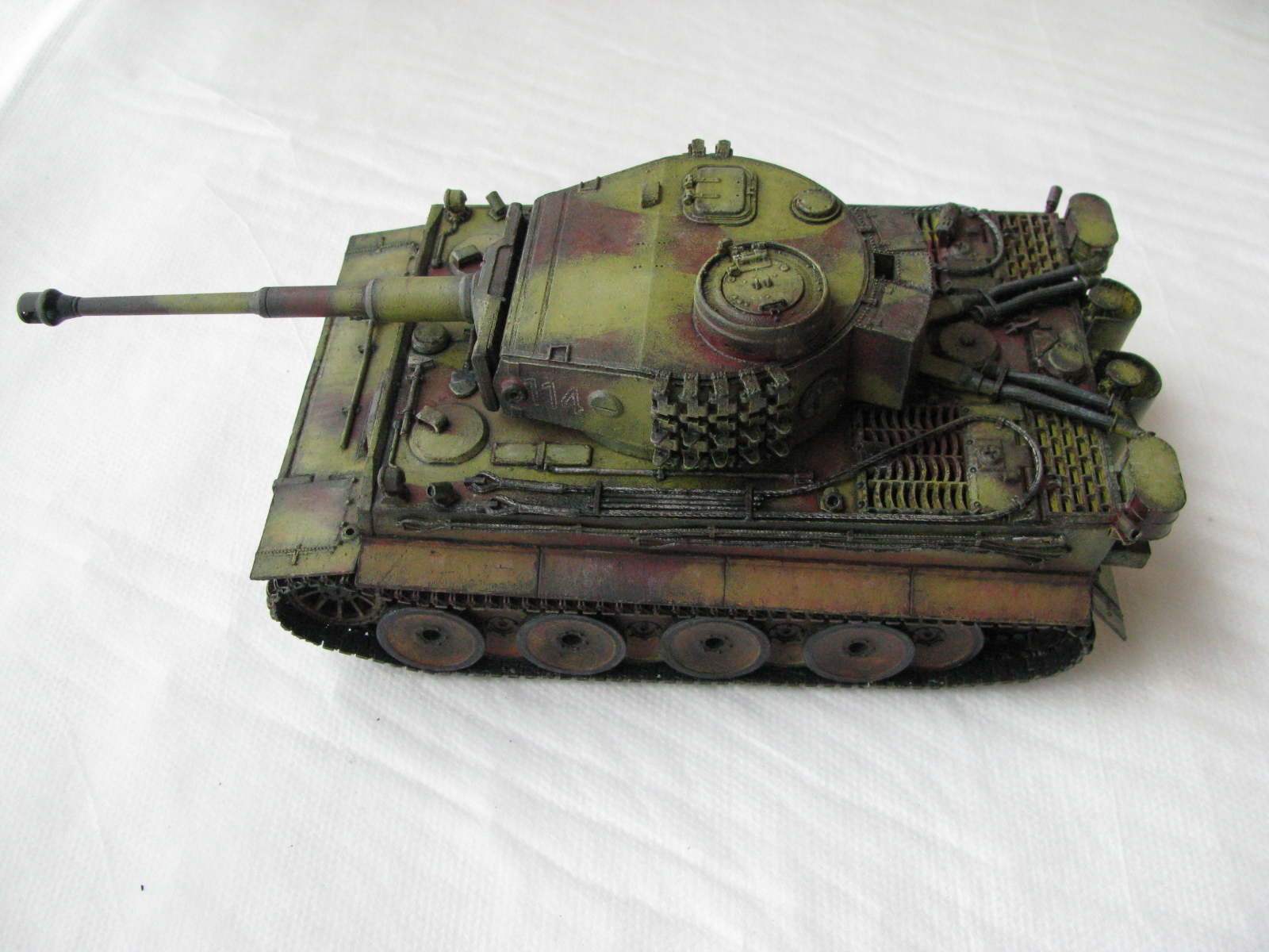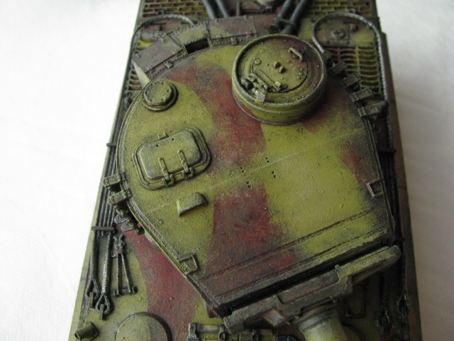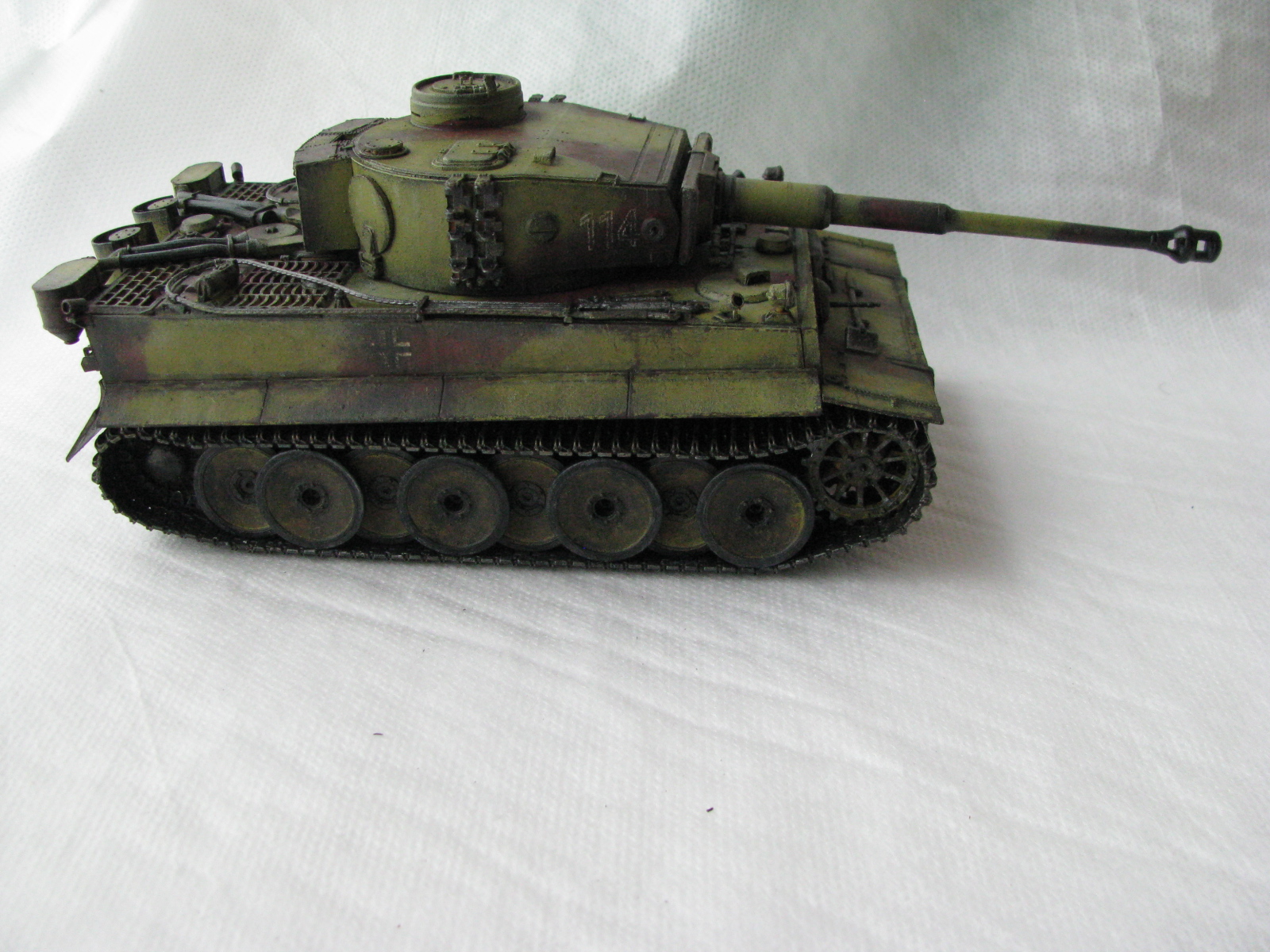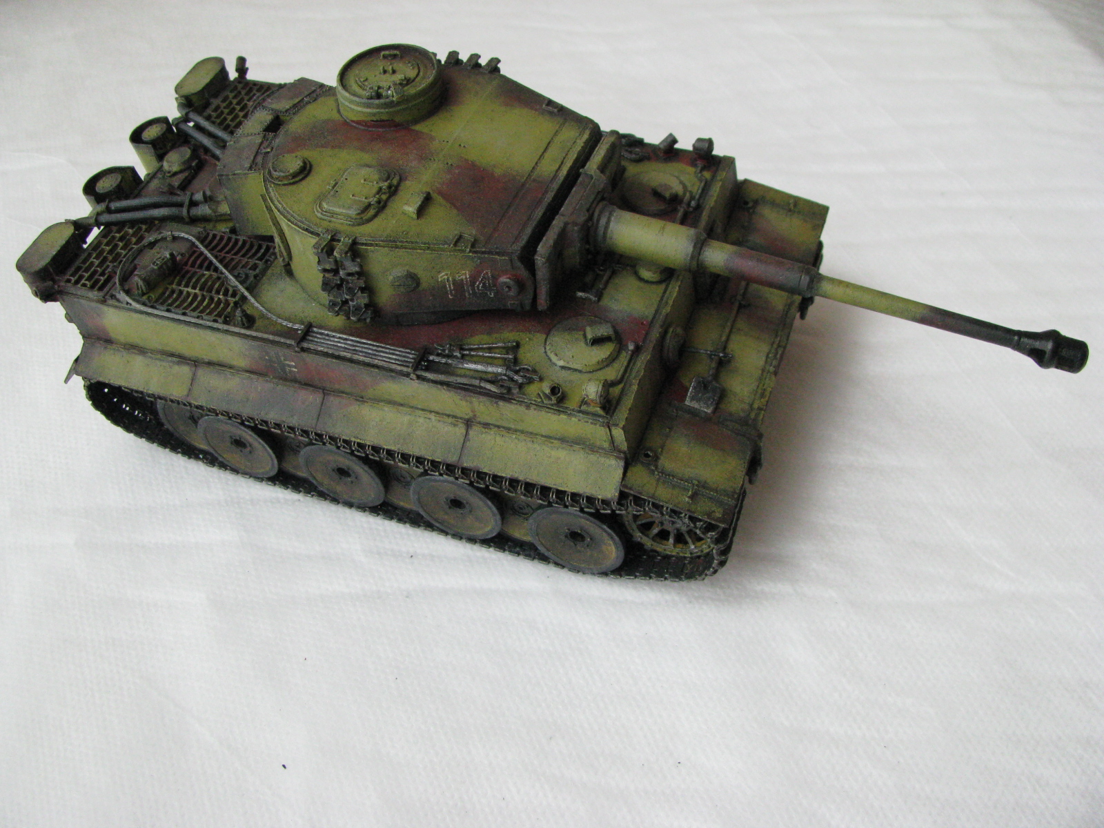 Вот теперь фото гораздо лучше. Предположения про недостающие детали оказались верными. Так же видны щели на стыках бронелистов, там где сварные швы должны быть. Гранатометы можно было высверлить, они немасштабно толстые. Сетки на решетках МТО вещь для Тигров обязательная. Ну и очень грубая покраска, под слоем краски много мусора, комочков и т.д.