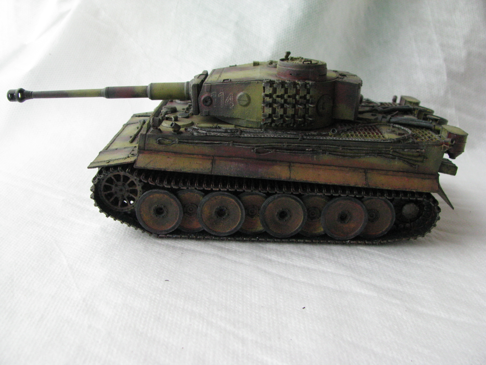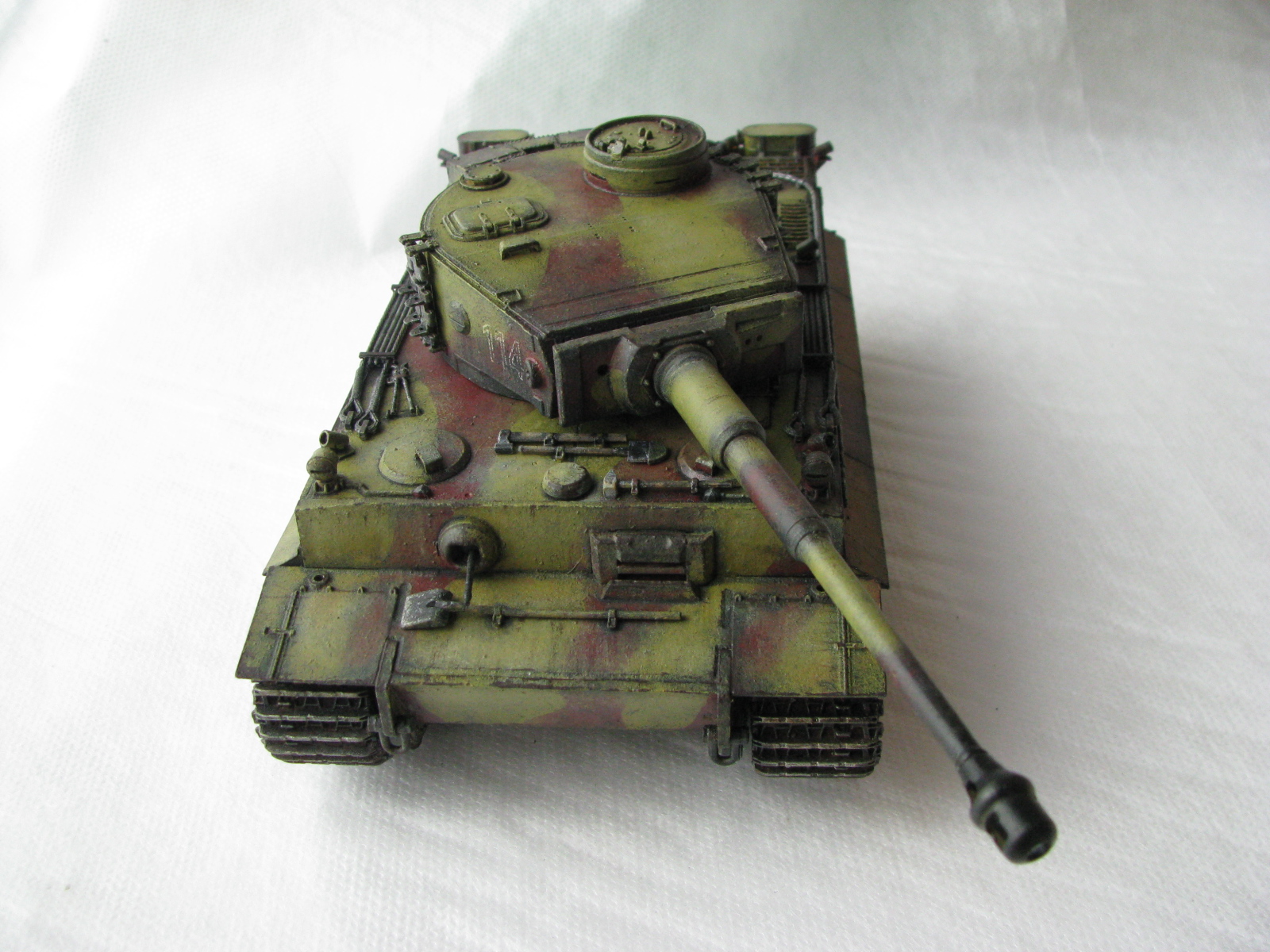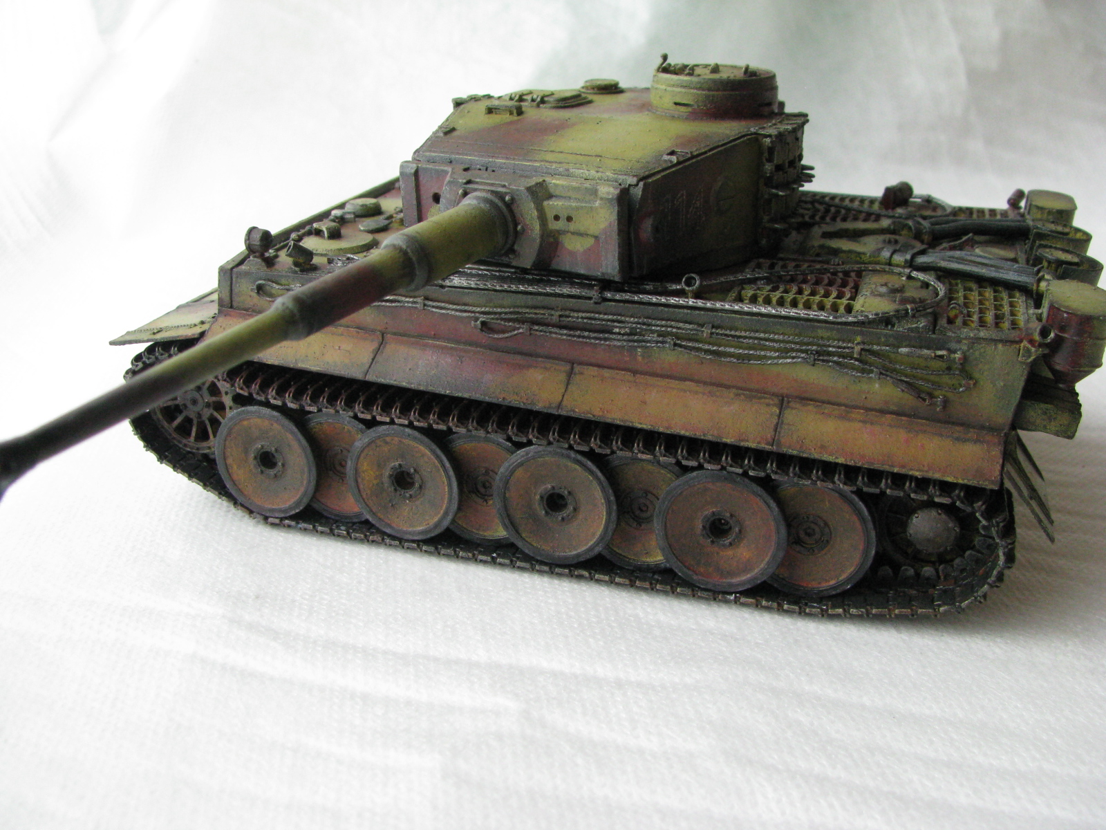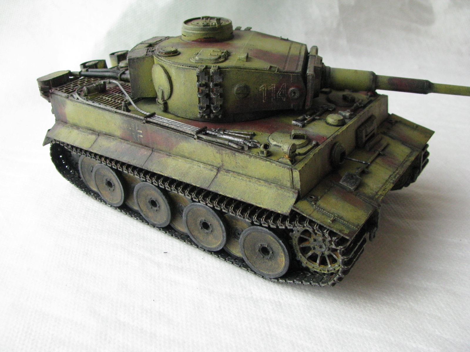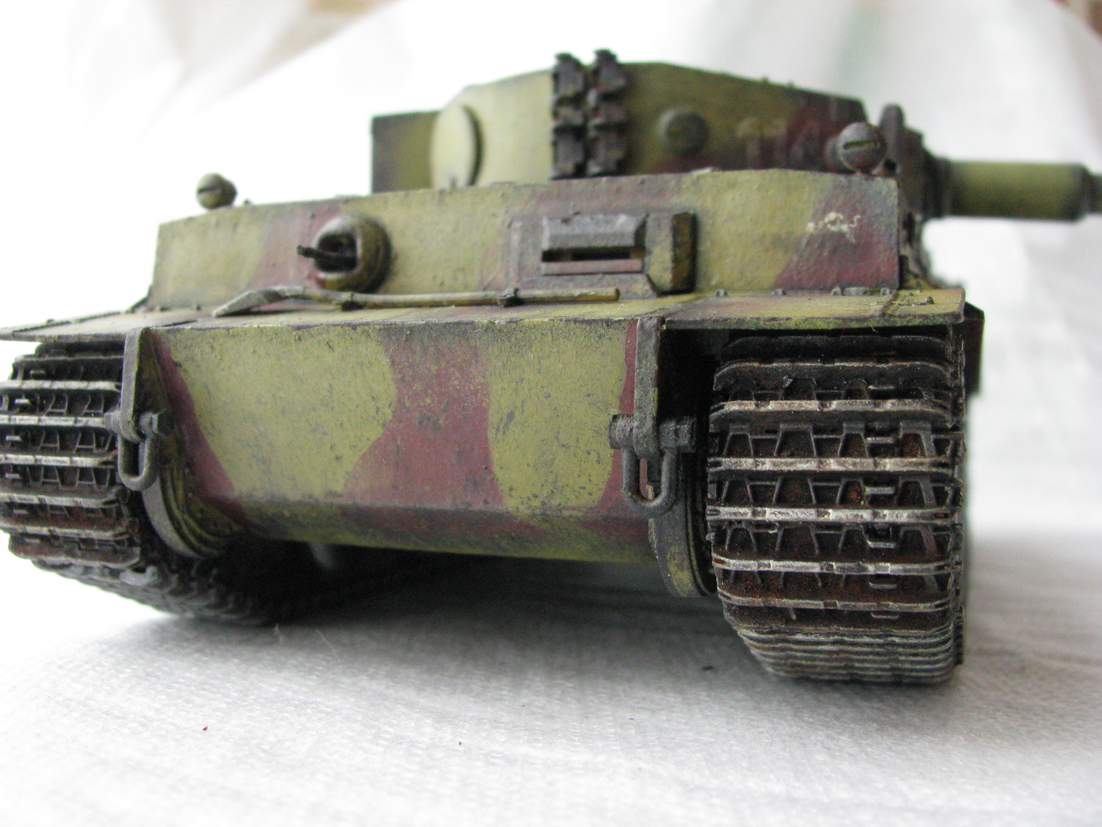 Вот теперь фото гораздо лучше. Предположения про недостающие детали оказались верными. Так же видны щели на стыках бронелистов, там где сварные швы должны быть. Гранатометы можно было высверлить, они немасштабно толстые. Сетки на решетках МТО вещь для Тигров обязательная. Ну и очень грубая покраска, под слоем краски много мусора, комочков и т.д.