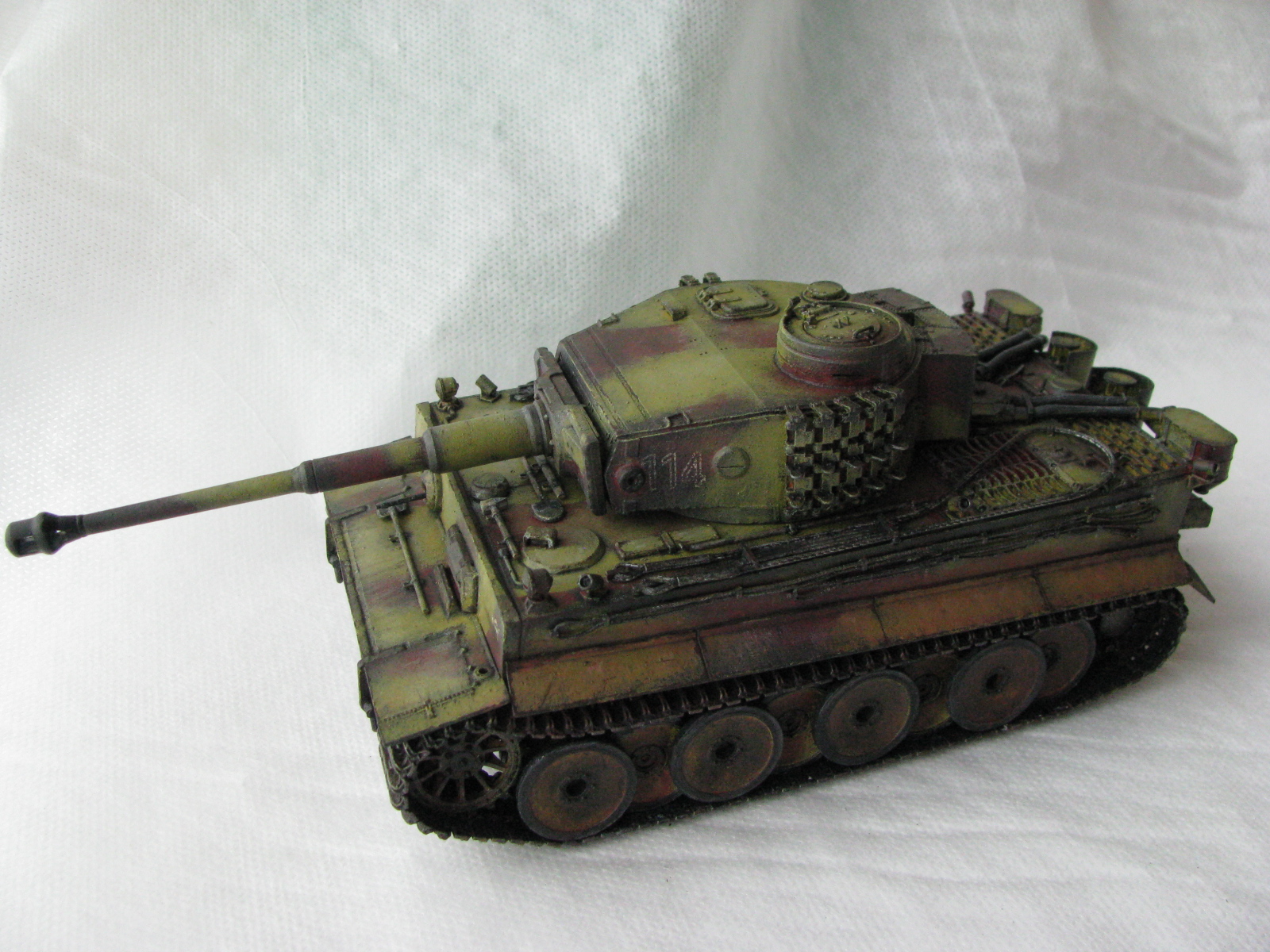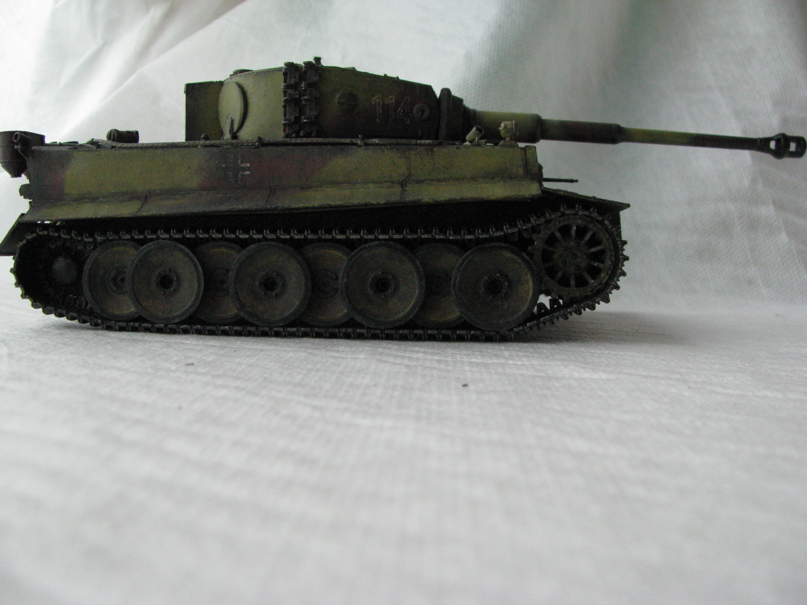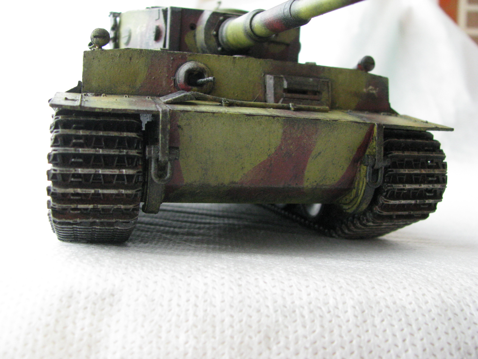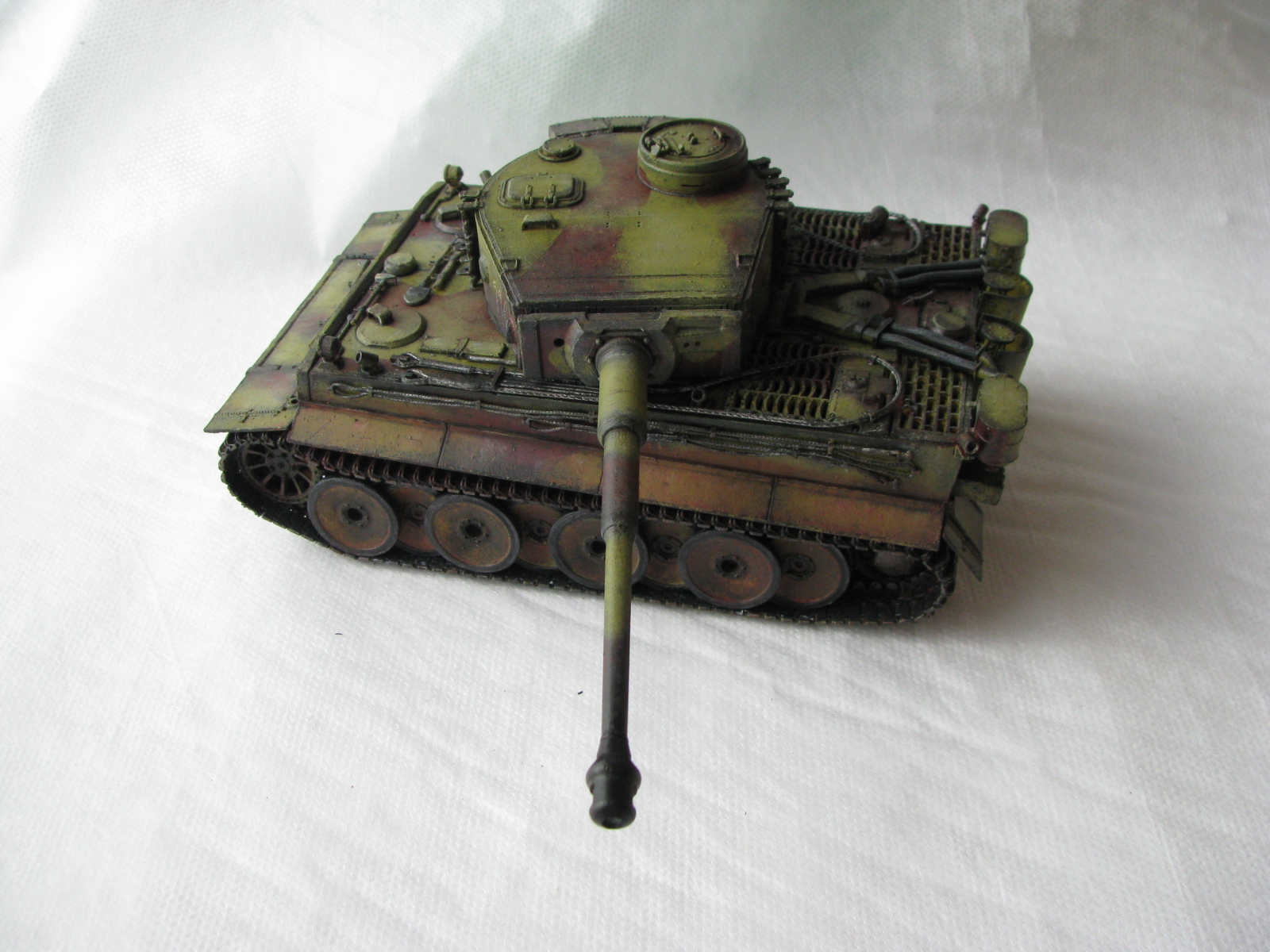 Вот теперь фото гораздо лучше. Предположения про недостающие детали оказались верными. Так же видны щели на стыках бронелистов, там где сварные швы должны быть. Гранатометы можно было высверлить, они немасштабно толстые. Сетки на решетках МТО вещь для Тигров обязательная. Ну и очень грубая покраска, под слоем краски много мусора, комочков и т.д.