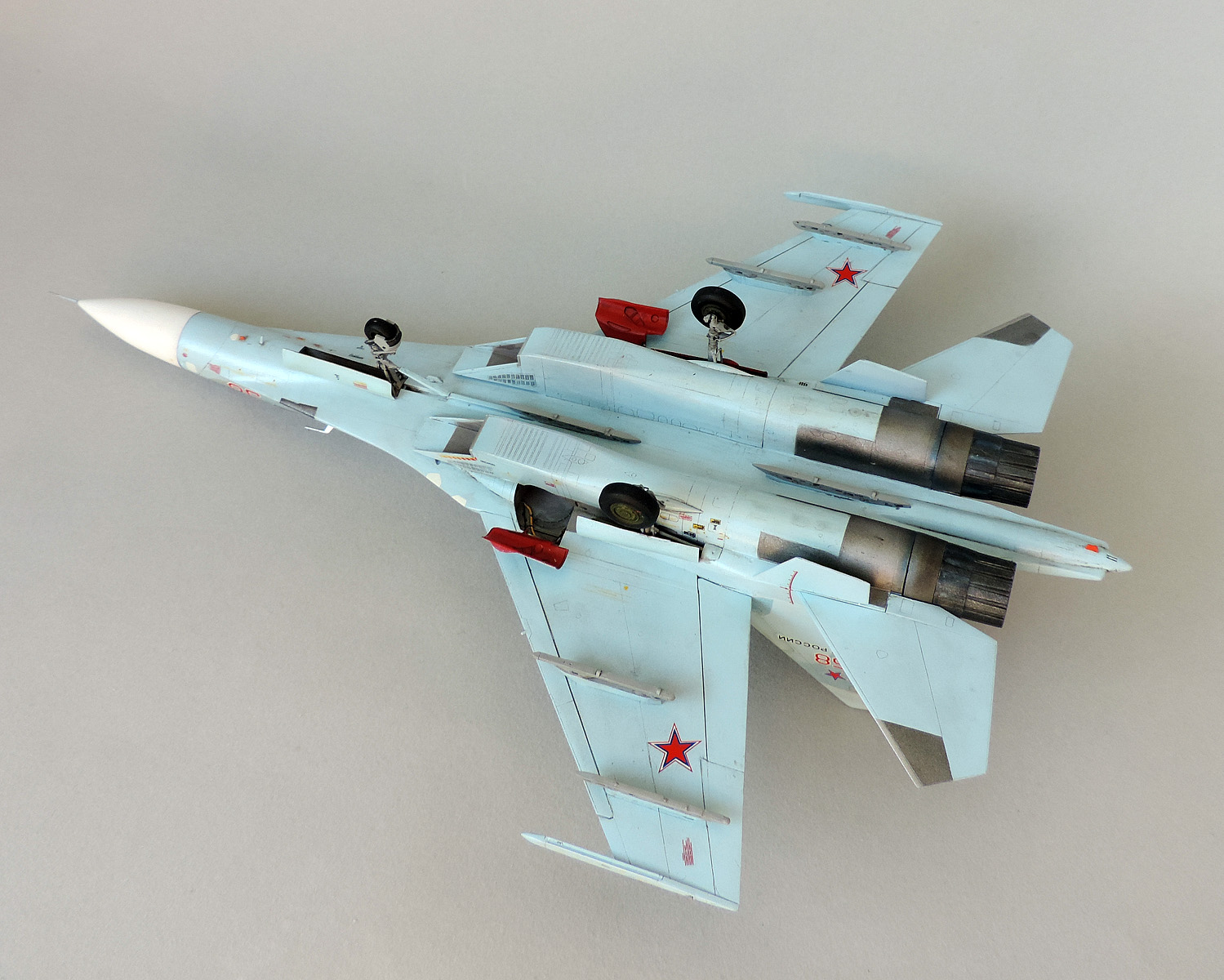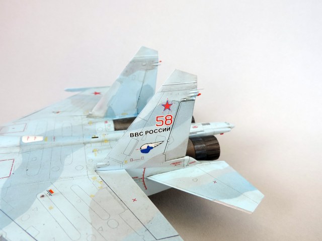 По сборке, как и всегда, особых проблем не было. На предыдущей модели для удобства кили красил отдельно, потом приклеивал к планеру, из-за чего оставались щели, на этот раз сделал наоборот. Добавил гидравлики на стойках и нишах шасси из тянутого литника. На нижних плоскостях крыльев немного шпаклевки и заново нанесена расшивка. Красил Тамией. Прошелся несколько раз МиГовской смывкой, но без энтузиазма, т.к. делать изрядно послужившего трудягу из него не хотел. По той же причине и пачкинга почти нет. Ну и в силу моей одаренности в науке фотографирования, фото получились - как получились! Для уличной фотосессии не лучшее время суток выбрал, но возможность выбраться на воздух для этих целей у меня вообще редко появляется. И погода ту же возможность редко позволяет дать. Потому прошу понять и простить. Не уверен, что просмотр будет приятным, но все равно желаю!