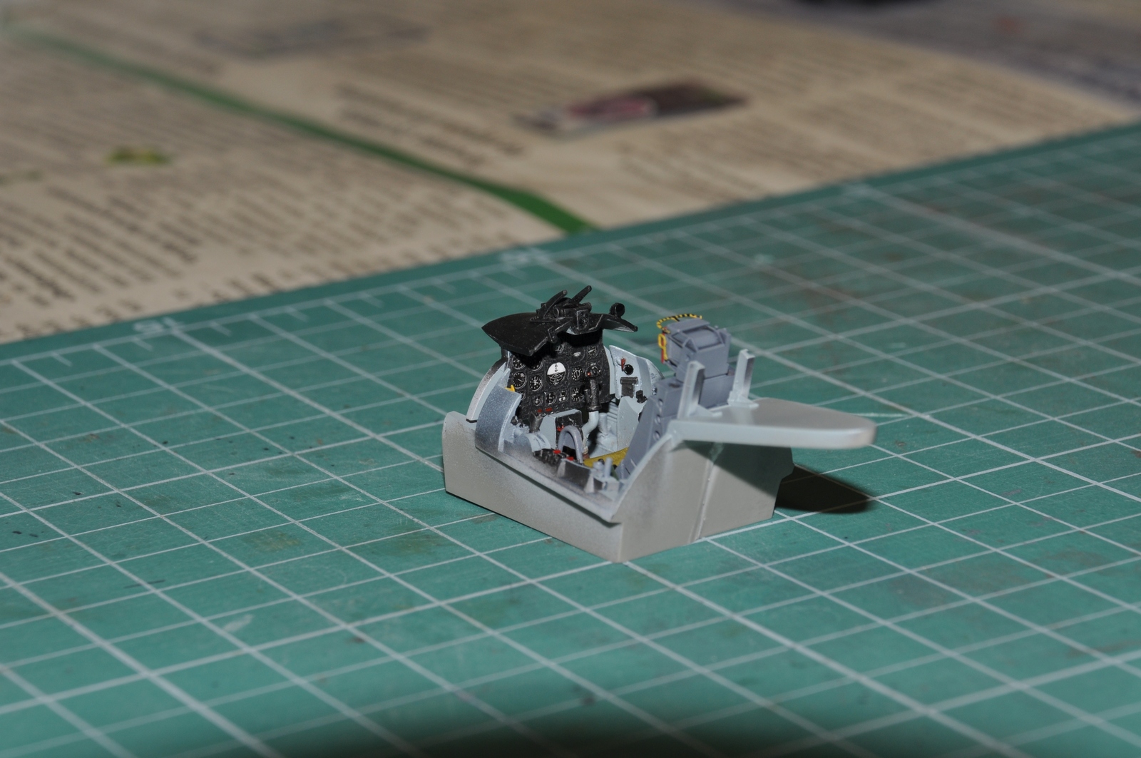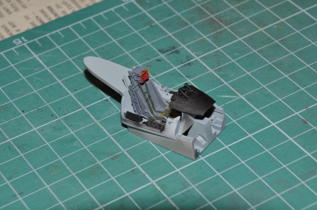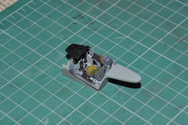 Отдельно опишу процесс монтажа кабины в фюзеляж. Может кому пригодится, а может кто и получше способ придумает. Итак, первым делом размещаем на свои места смоляные боковые стенки кабины пилота. Стачиваем пол кабины как можно тоньше. Уменьшаем высоту креплений передний ниши шасси, которые отлиты вместе с фюзеляжем – все это потребуется для монтажа канала ВЗ двигателя. Грунтуем, красим, тонируем кабину. Затем склеиваем вместе половинки фюзеляжа вместе с передней нишей шасси. Сверху на скотч наживляем приборную панель с козырьком, а снизу, через отверстие от крыльев заводим саму кабину и затем фиксируем ее и приборку на супер-клей. А потом начинается самое сложное – монтаж воздушного канала двигателя. Он существенно толще, чем осталось для него места. Придется основательно сточить его стенки, чтобы влез на свое место.