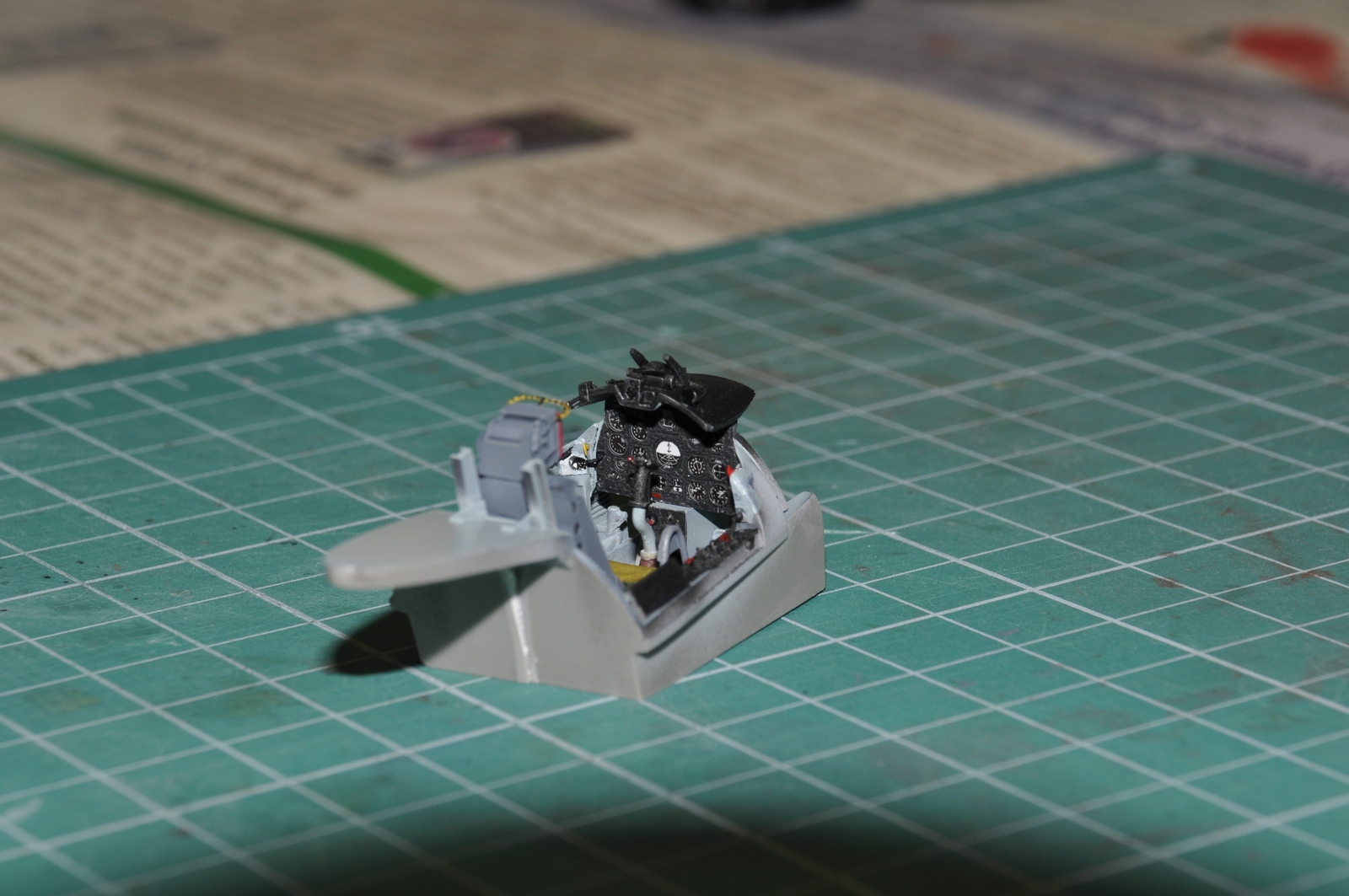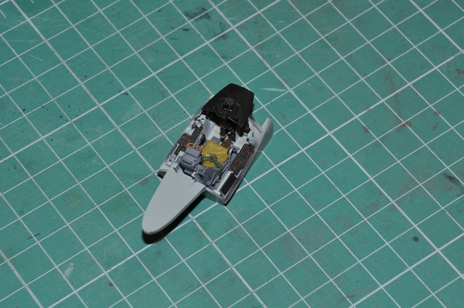 Далее сборка воздушного канала двигателя и подгонка смоляной кабины на свое место. Пришлось подточить стенки фюзеляжа изнутри, чтобы разместить на своем месте смоляную деталь. Доработке подвергся смоляной козырек над приборной панелью. Он оказался на 1 мм уже, чем требуется. По бокам смоляной детали приклеил Евергриновские прутки 0,88 мм и обточил до необходимого состояния.