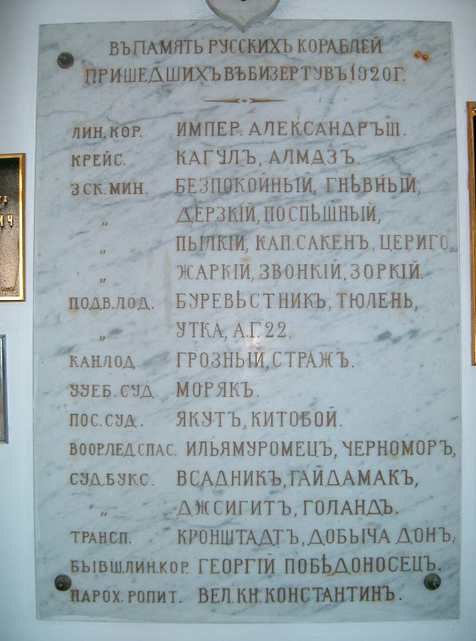 О чём свидетельствует хотя бы памятная мраморная доска на внутренней стене Храма Александра Невского в Бизерте с названиями кораблей, пришедших из Крыма в Бизерту (см. фото в описании). Царские врата Храма завешены Андреевским флагом с корабля «Георгий Победоносец».