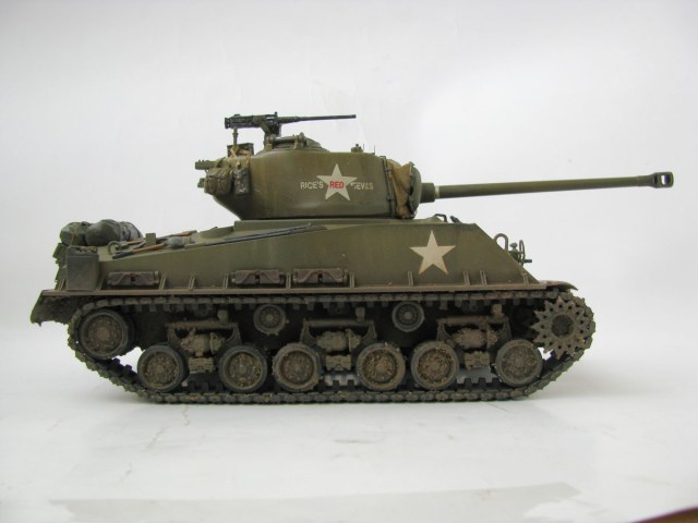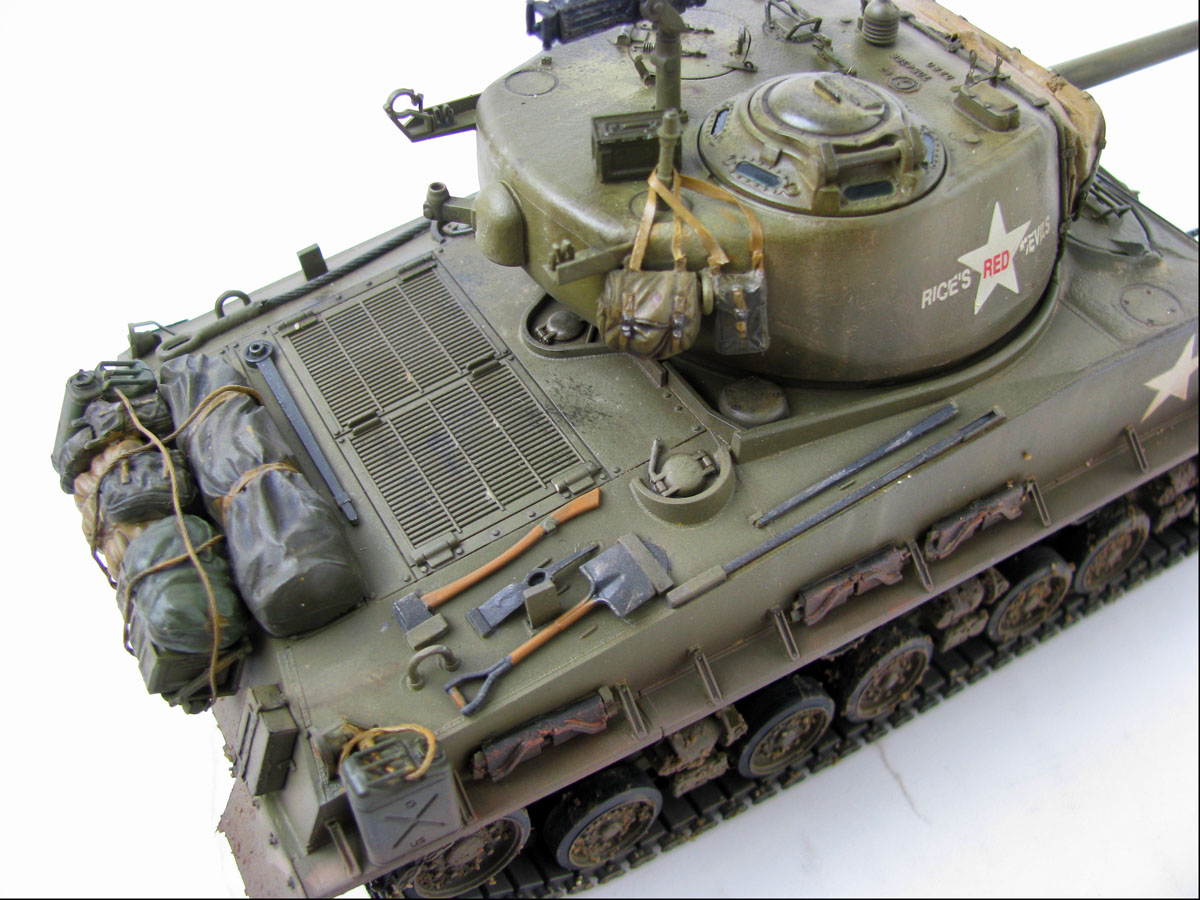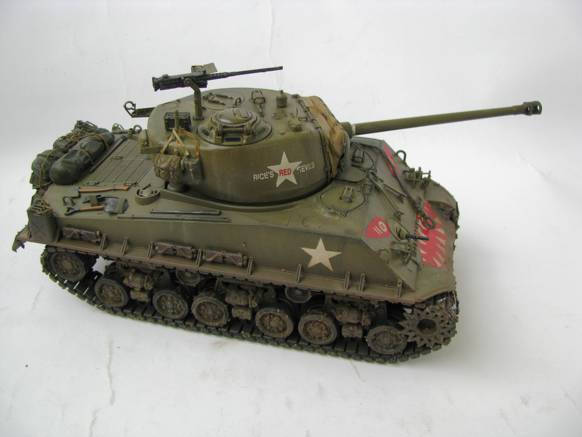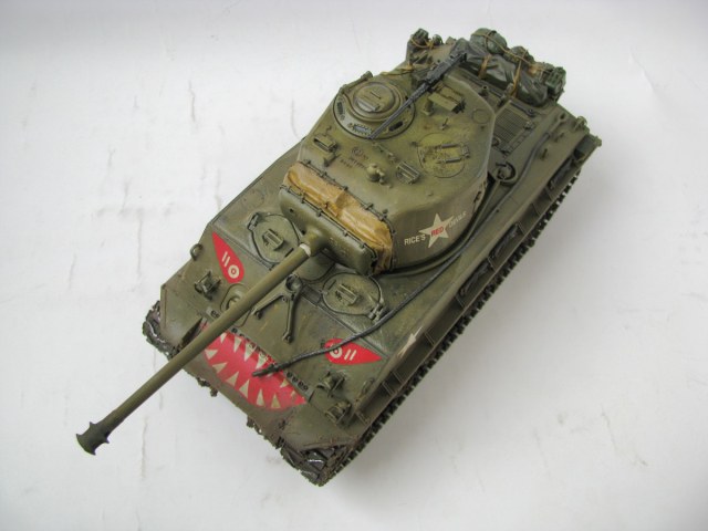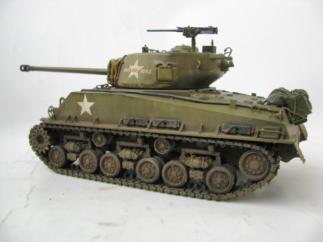 В итоге основой модели стал свежевыпущенный тамиевский кит "М4A3E8 European theater". Сам по себе он неплохой, хотя и неоправданно дорогой. Были добавлены задние брызговики, трос эуреки, дефлектор выхлопа позднего образца(у тамии раннего), заново сделаны оградки фар, чехол маски орудия, траки заменены на тип Т80, коробку телефона для связи с пехотой, обвес.