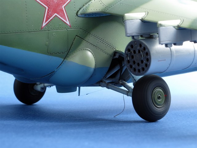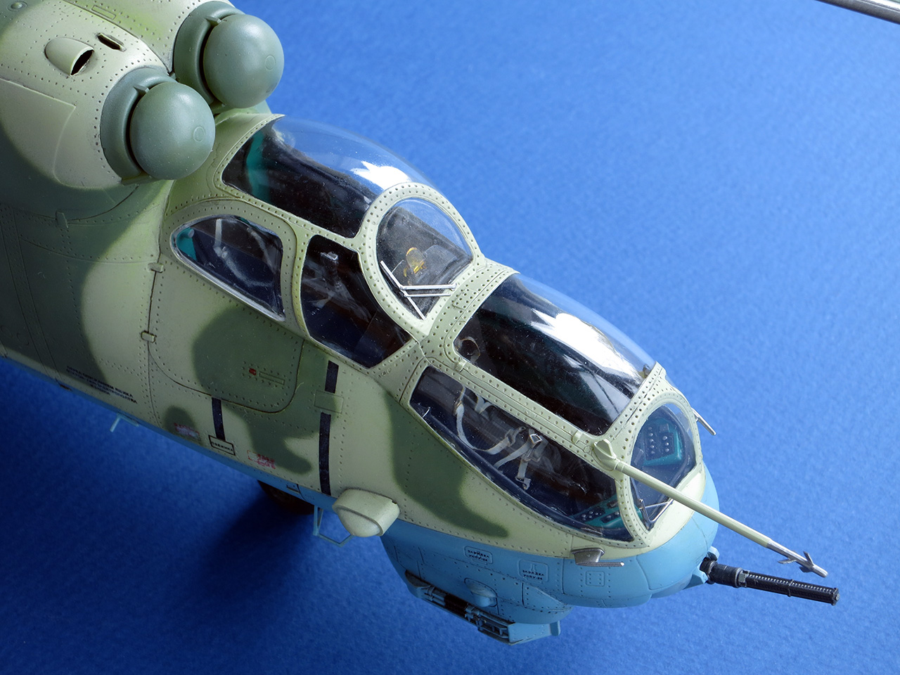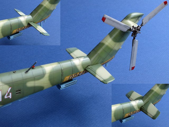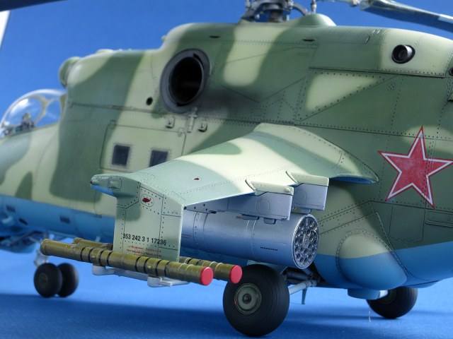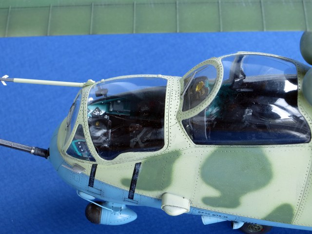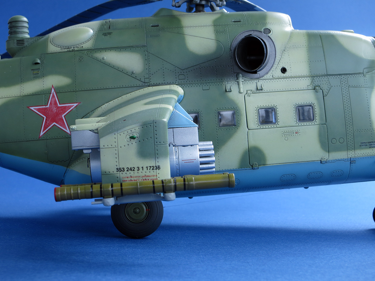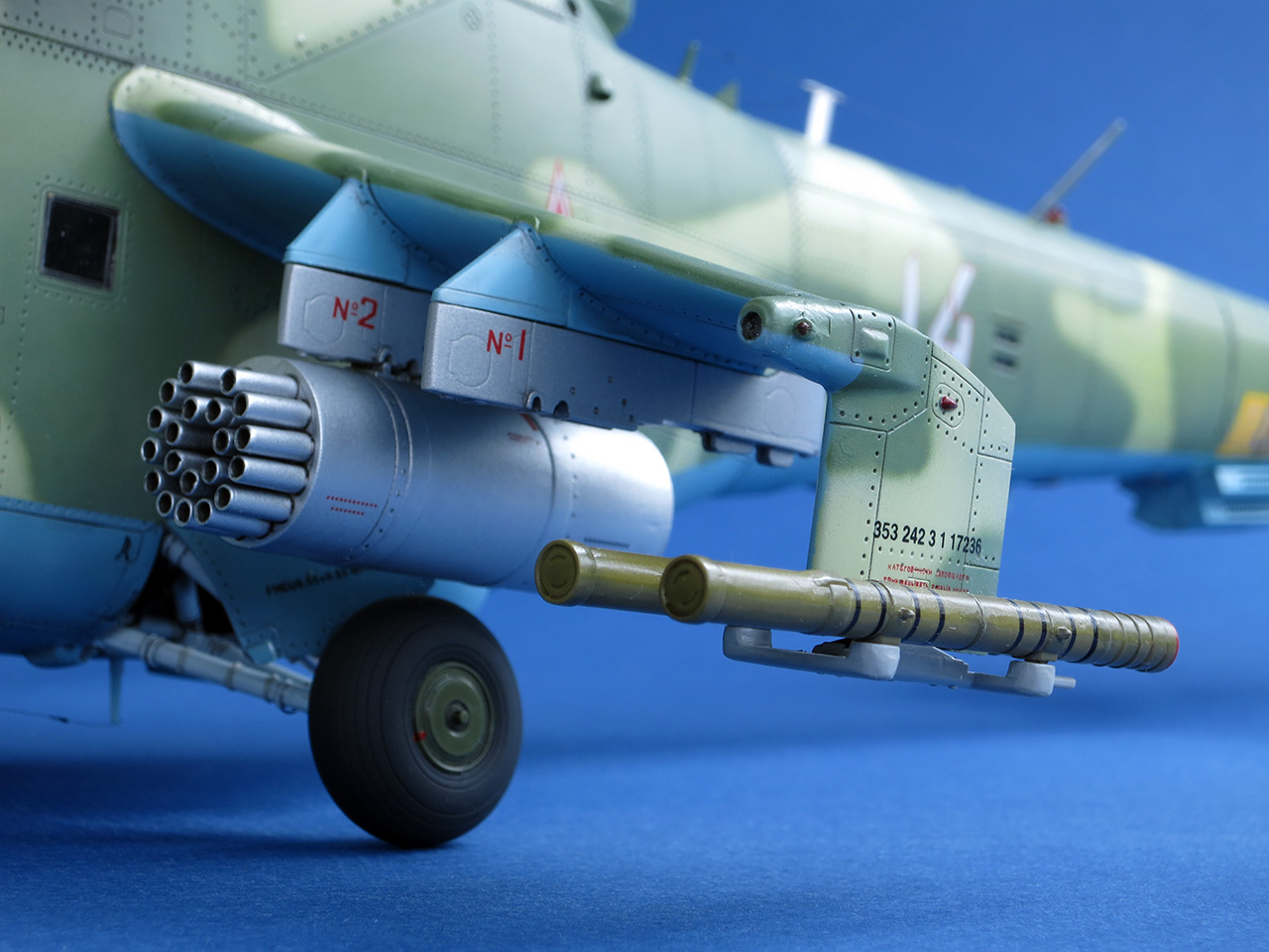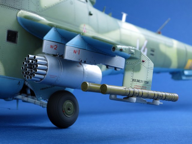 Прототип Ми-24П,совсем другая модификация.Без пулемета,с пушкой по правому борту,блоки отстрела ловушек расположенны совсем в другом месте,антенн в передней части не имеет,бортовой номер другого цвета,надпись DANGER вместо ОПАСНО.