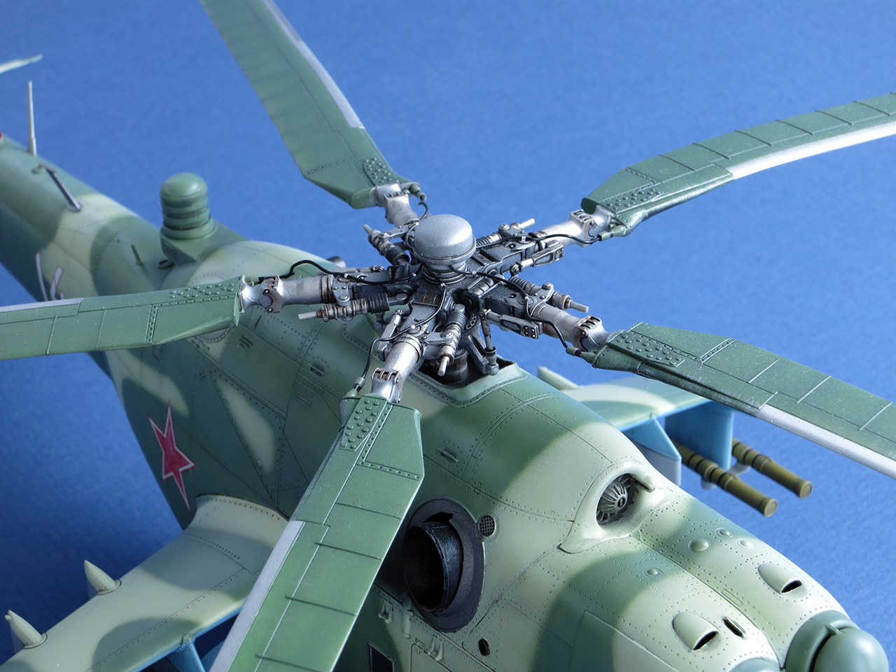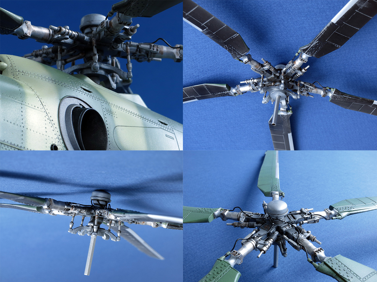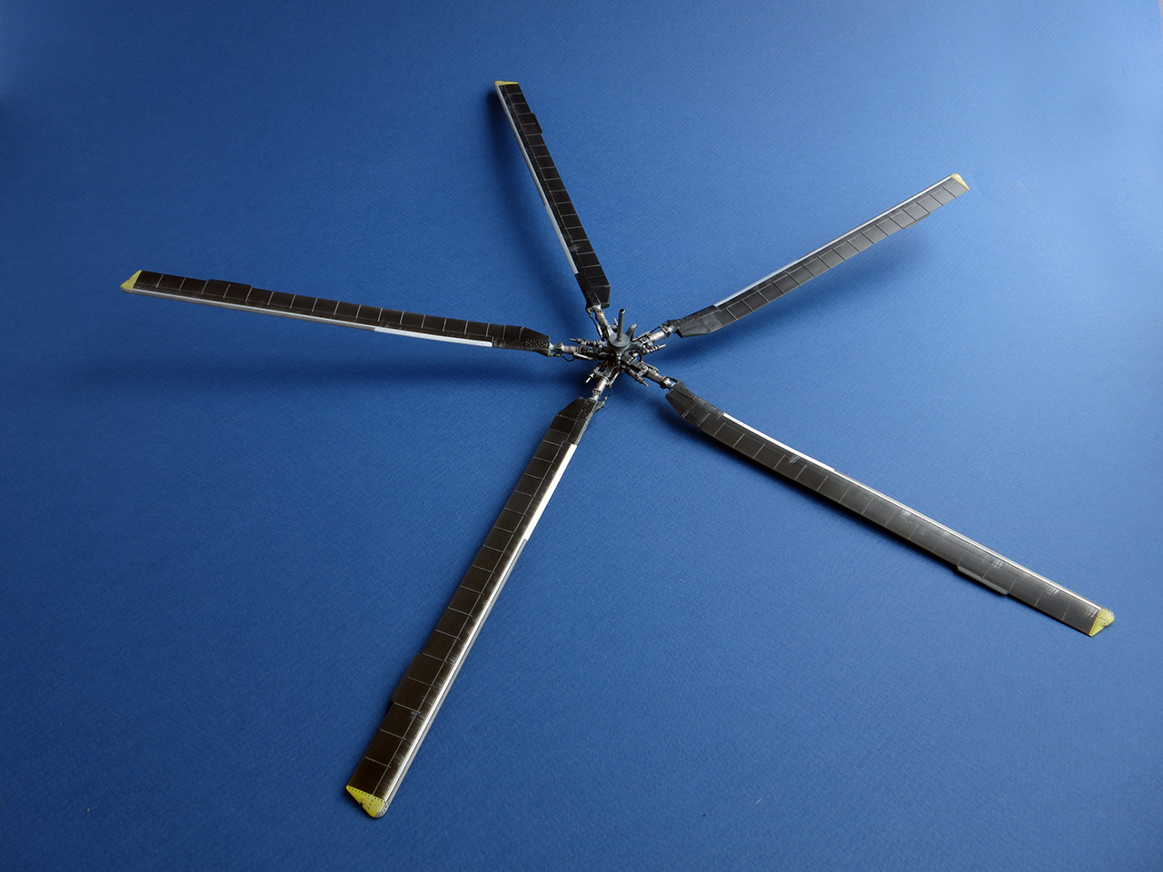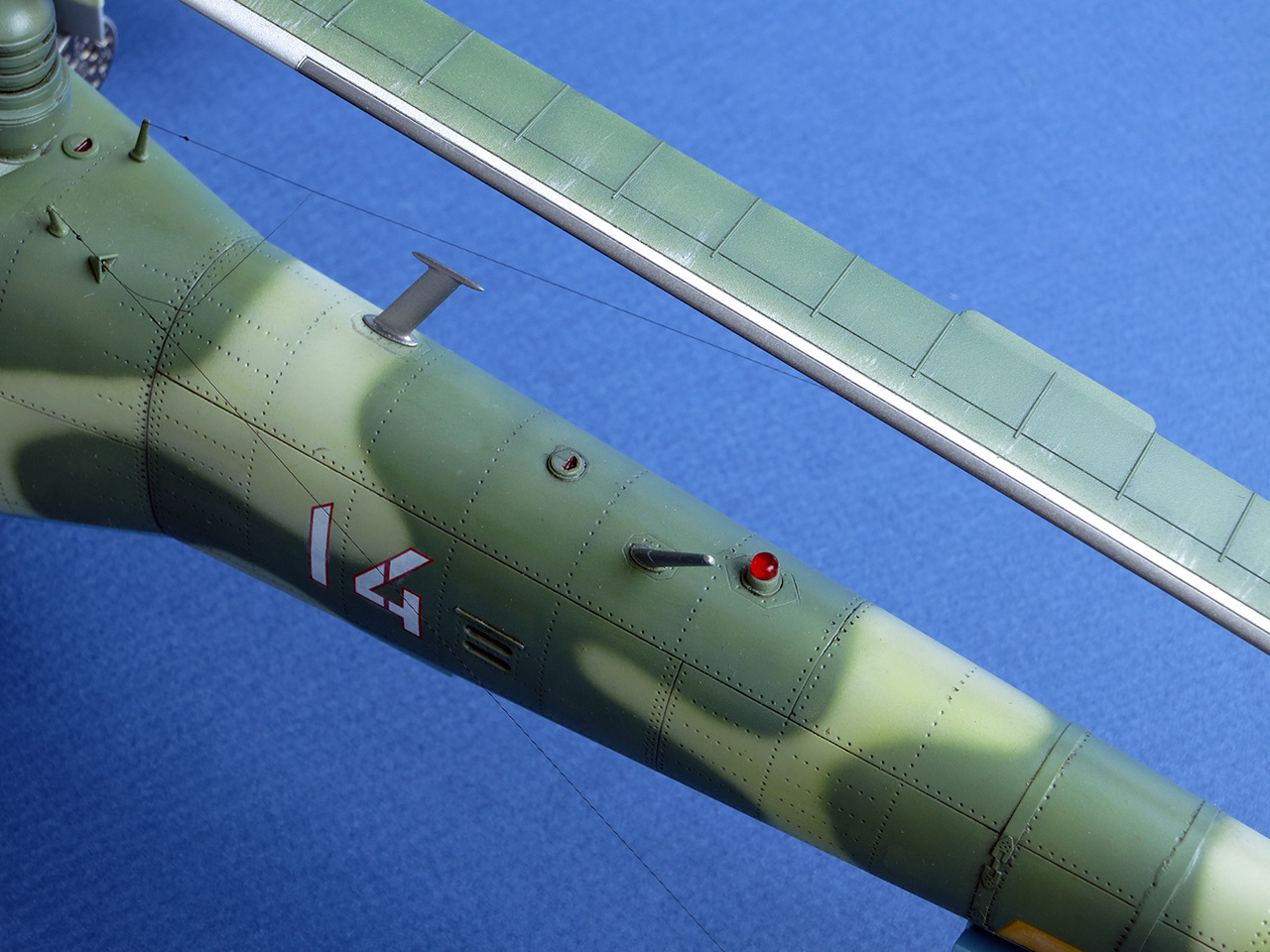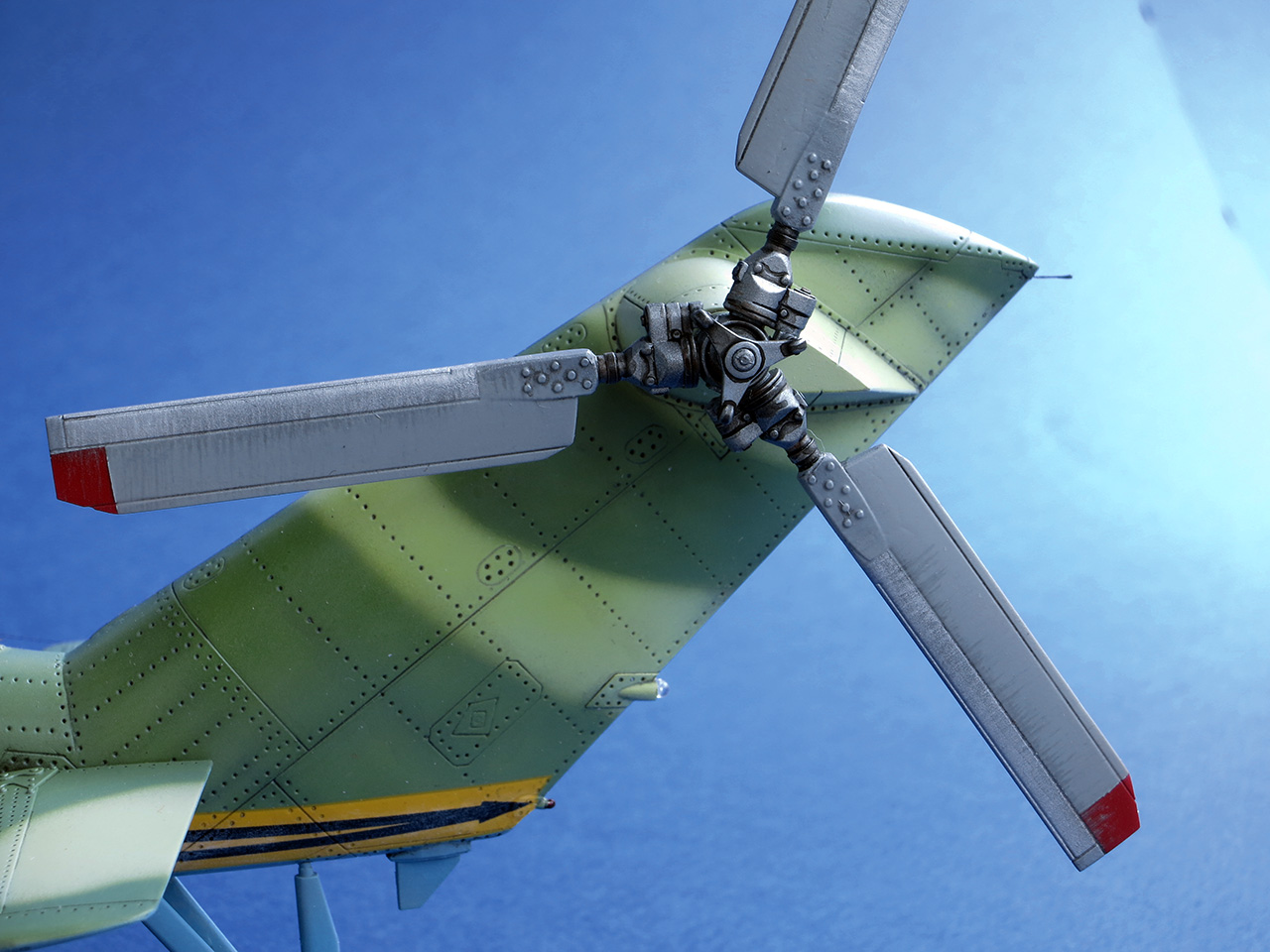 Детализацию механизмов несущего винта дополнил резиновыми шлангами подачи сжатого воздуха из чуть более тонкого припоя. Сам несущий винт сделал съемным. Для этого заменил штатную ось на трубку от антенны радиоприемника.
