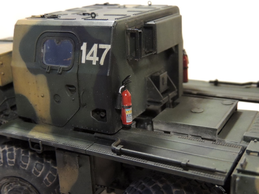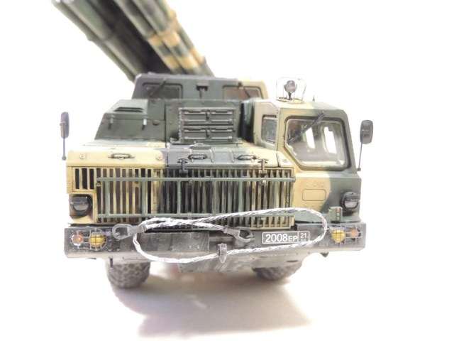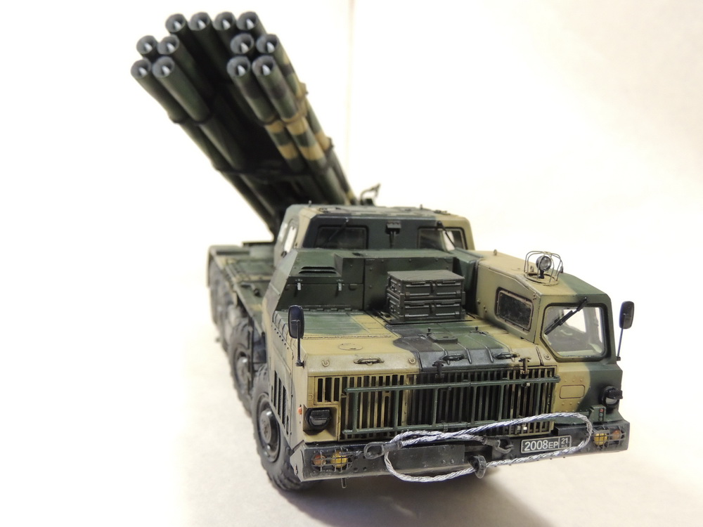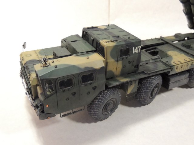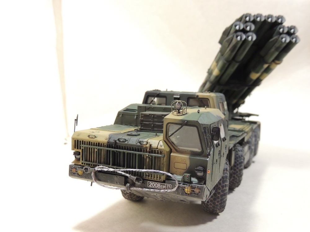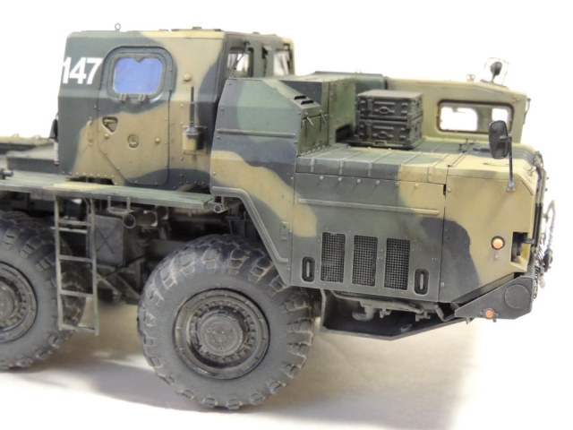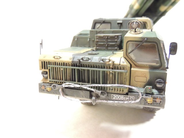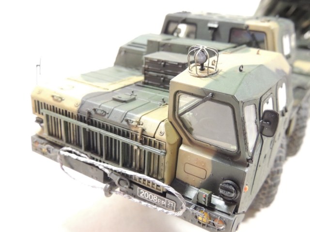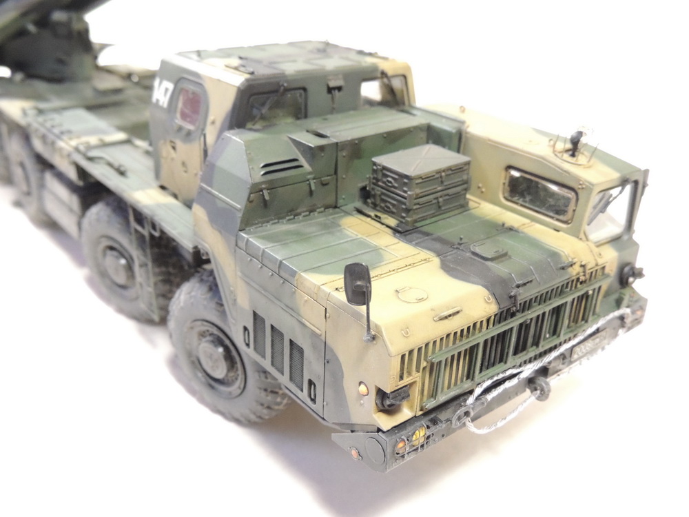 За то, что не сдались и довели дело до конца, вам 5+. Работа проведена большая, сам знаю, ибо собирал, но вам не хватает аккуратности. Основные художественные работы видно только на колёсах (может фото такие). Подложки декалей "торчат". Выхлопные трубы надо было рассверлить и углубить, а то видать стенку внутри. Зеркало кривовасто стоит. Мелочи, а картинку "подтачивают". Почему заклеили кабину? =) Совсем трос не понравился. Может его переделать? Понравились цвета камуфляжа.