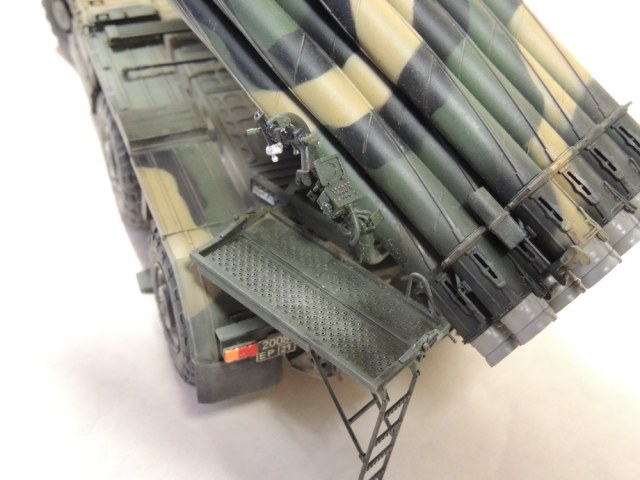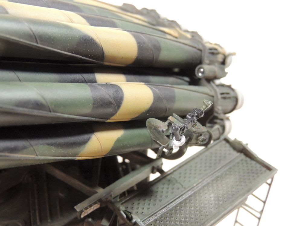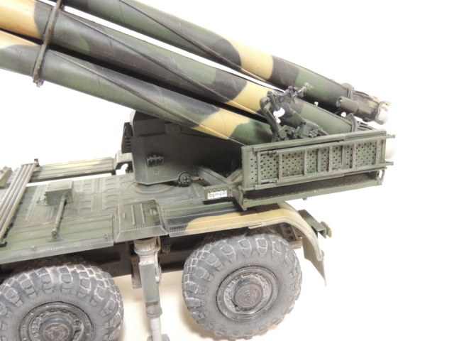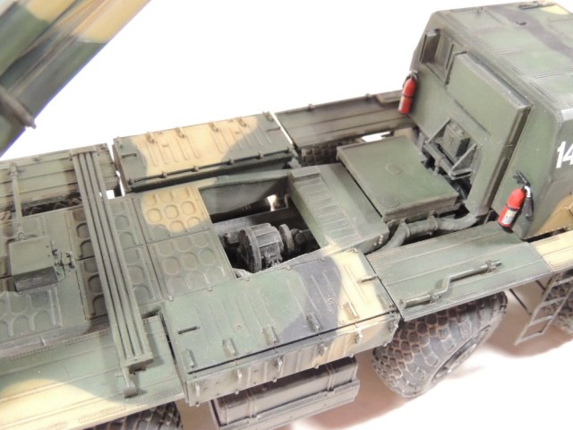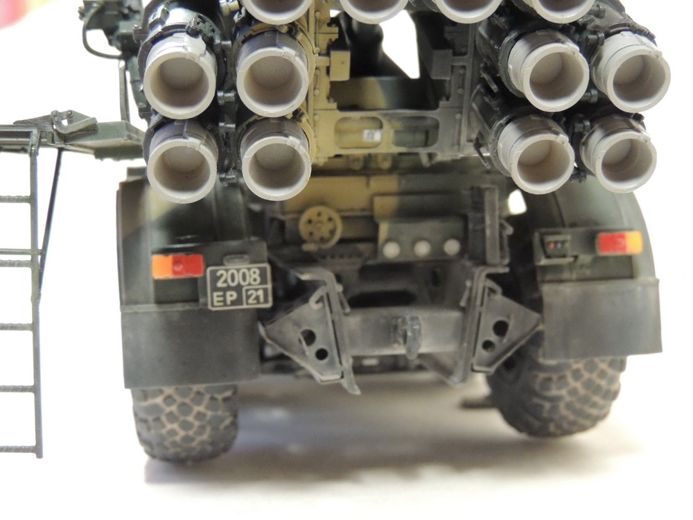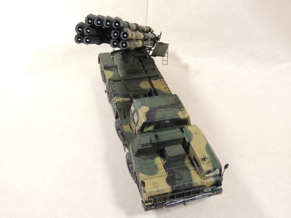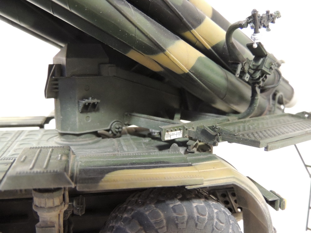 За то, что не сдались и довели дело до конца, вам 5+. Работа проведена большая, сам знаю, ибо собирал, но вам не хватает аккуратности. Основные художественные работы видно только на колёсах (может фото такие). Подложки декалей "торчат". Выхлопные трубы надо было рассверлить и углубить, а то видать стенку внутри. Зеркало кривовасто стоит. Мелочи, а картинку "подтачивают". Почему заклеили кабину? =) Совсем трос не понравился. Может его переделать? Понравились цвета камуфляжа.