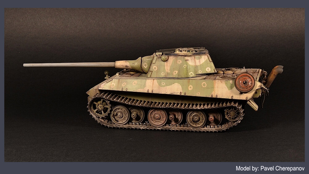 Я использовал акриловые краски АММО для нанесения камуфляжа, с помощью масок от болгарской DN Models. Базовые цвета - Dunkelgelb aus '44 DGIII и Resedagrun B, из набора Late German Camouflages. Оттенки довольно светлые, и сморятся необычно, в отличие от приевшихся темно-желтых и оливково-зеленых тонов, стандартных для германской техники с 1943 года. Некоторые детали - часть катков и некоторые бронеплиты на крыше танка оставлены в грунтовке, а дополнительная флак-броня на башне окрашена в черный цвет. Ствол оставлен в светло-серой заводской термостойкой грунтовке. Везеринг - по моим стандартным технологиям. В самый последний момент, уже при обработке фотографий, я заметил что упустил пару финальных штрихов - забыл установить смотровые прибор мехвода и радиста, а также проводку к фаре. Но это поправимо, тем более что модель готовится к установке на диораму, и кое-что на нее еще будет добавлено.