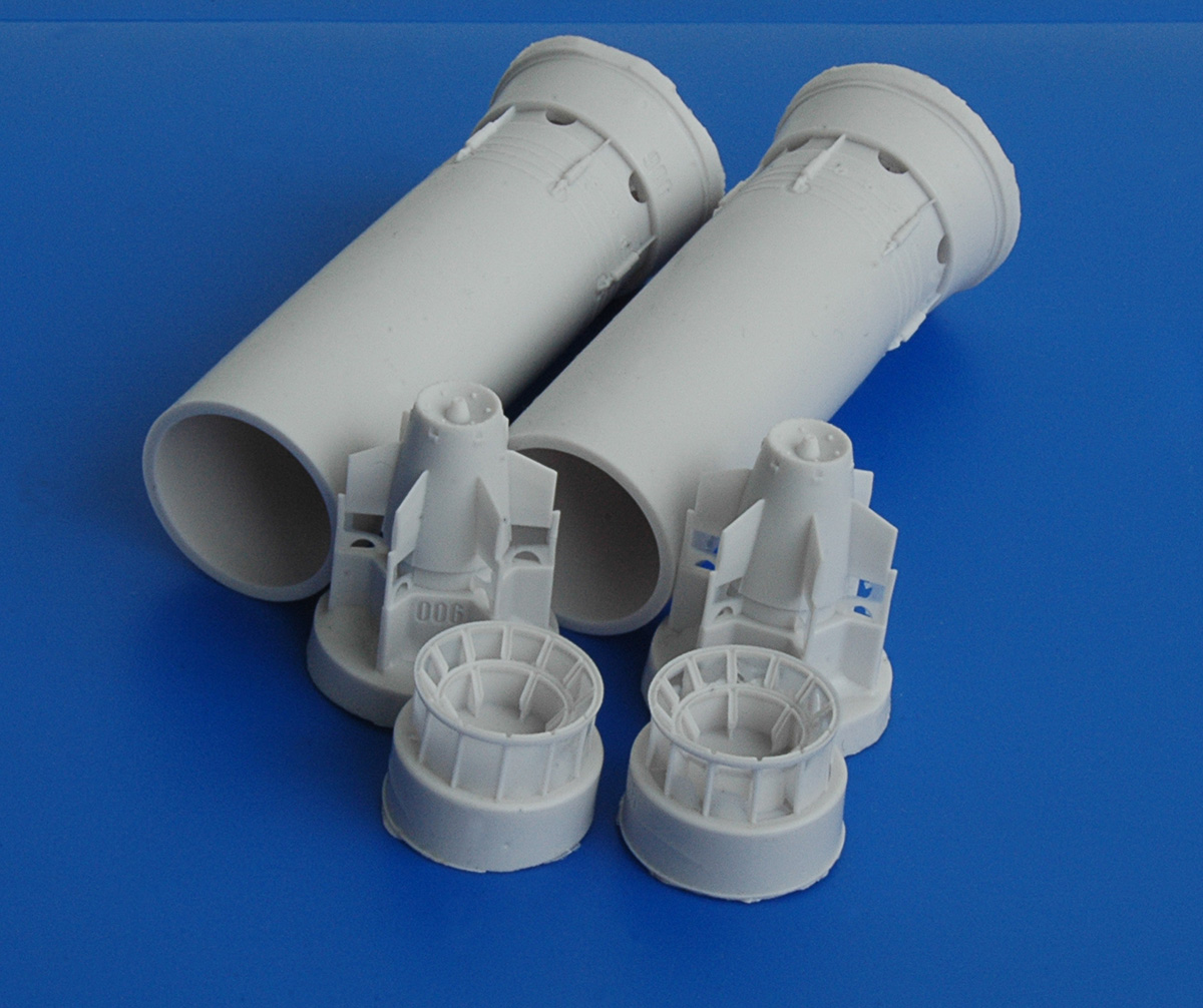 И так, если Вы собираете модель с набором жаровых труб от АМиго, Вам нужно будет подогнать заднюю часть пластиковых капотов под смоляные трубы. Если же ставите сопло от Амиго на трубы из набора, то просто вклеиваете трубы широким кольцом наружу, а затем просто монтируете сопло на это кольцо. Надеюсь, с этим разобрались.