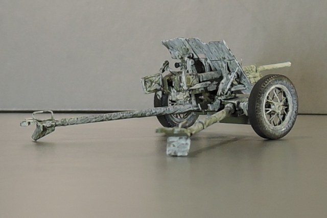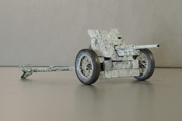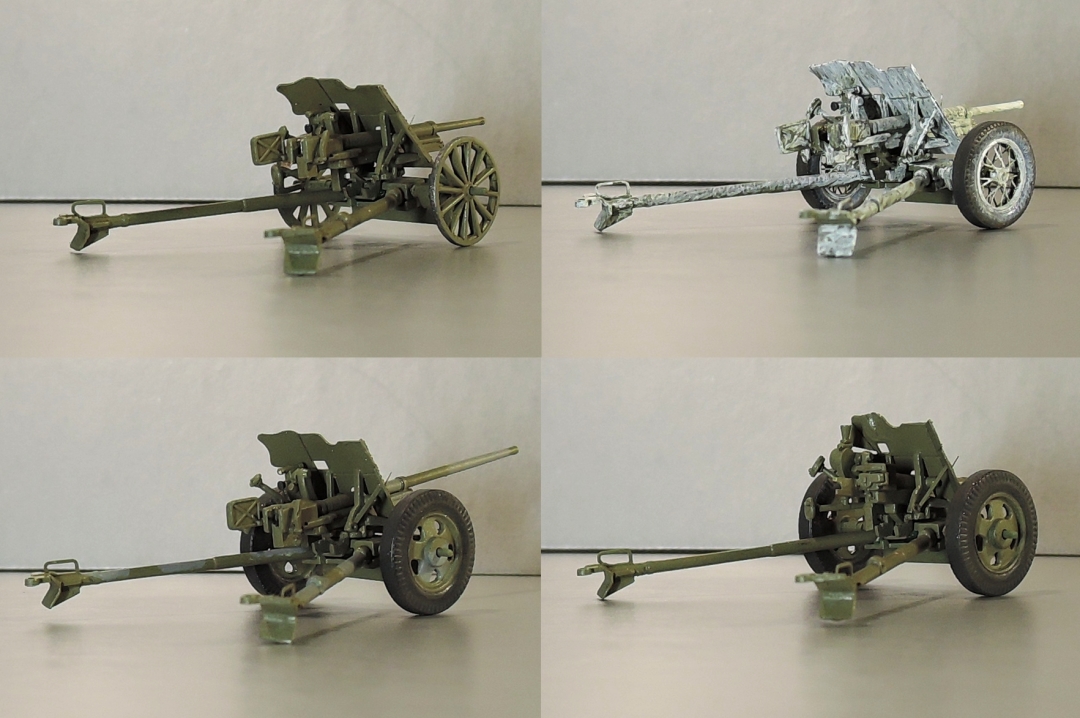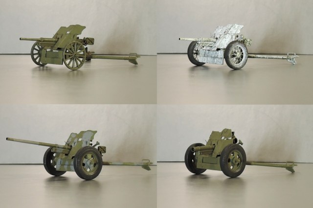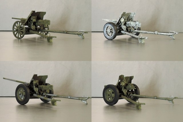 Наборы UM отличаются лучшей деталировкой от Звезды и АСЕ. Пластиковые стволы 45мм заменены на латунные точёные. Изготовлены спицованные колёса. Решил попробовать изобразить зимний камуфляж.
