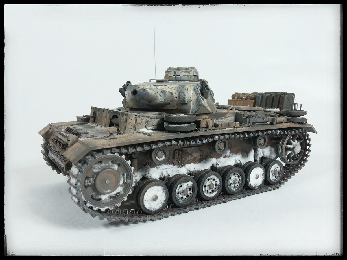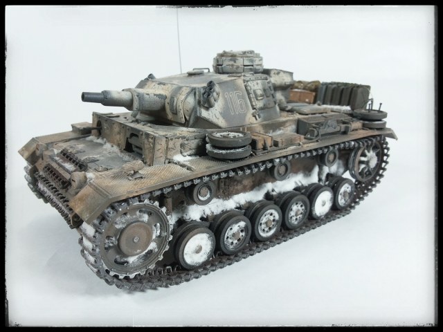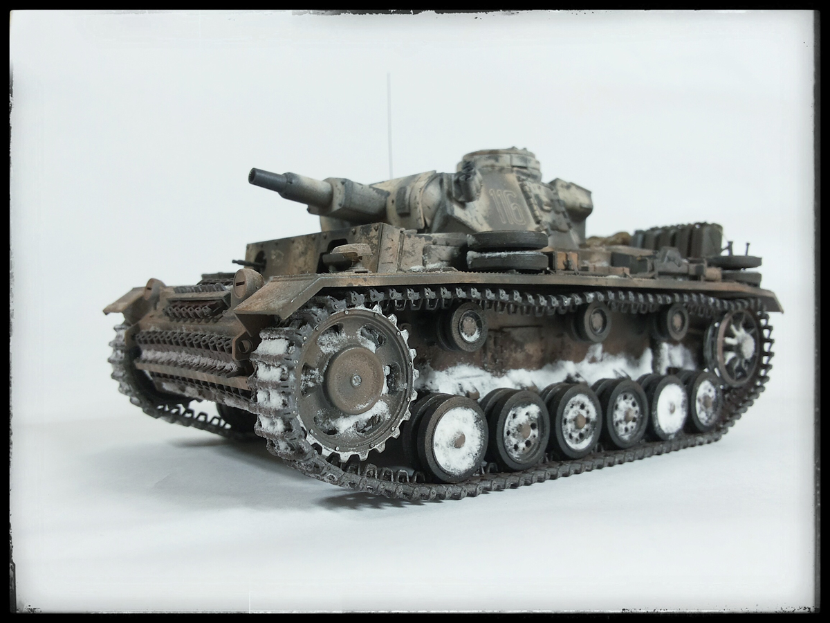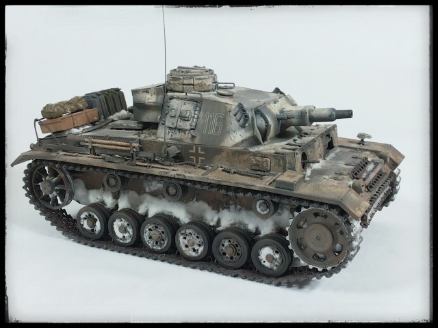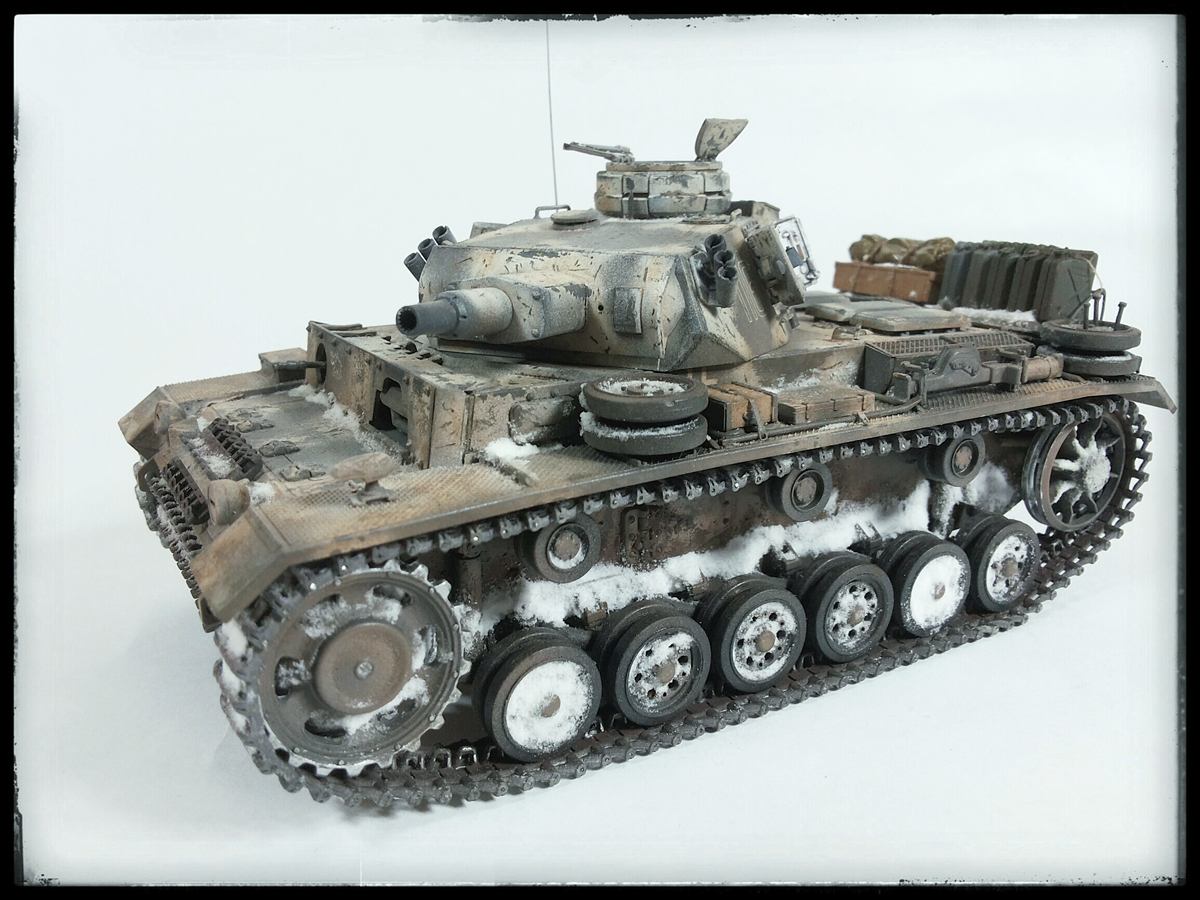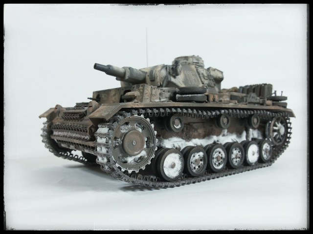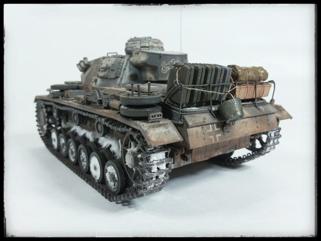Не размещал свои модели больше года, т.к. было много работы. Вот наконец-то время появилось и вот собственно: Pz.Kpfw III Ausf. N Sd.Kfz.141/2 от Тамии. Сей кит всем известен и описывать я его не буду. Скажу, что модель в сборке отличная!!! Собрал практически из коробки, добавил от себя решётки МТО на Stug III от Тамии, сделав из проволоки усиление на них по середине (см. оригинальное фото), поставил алюминиевые "гусли" от Spade Ace Models. Кстати весьма клёвая альтернатива Фриулу, дешевле и по качеству не уступают!!! Вставил плёнку от DVD во все смотровые отверстия, доработал крепление бруса под домкрат, антенна из литника. Боковые и командирский люки открываются, рассверлил выхлопные трубы, сымитировал сварные швы на башне, седлал из проволоки багажник, как на оригинальном фото, поклажа от Tamiya и Academy вперемешку, ведро из Доширак, провёл проводку к фарам, декали "приварил" Тамиевским Mark Fit-ом... Снег сода+ПВА.