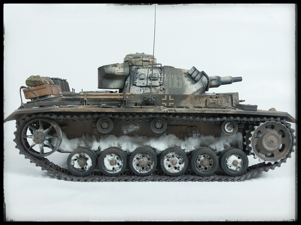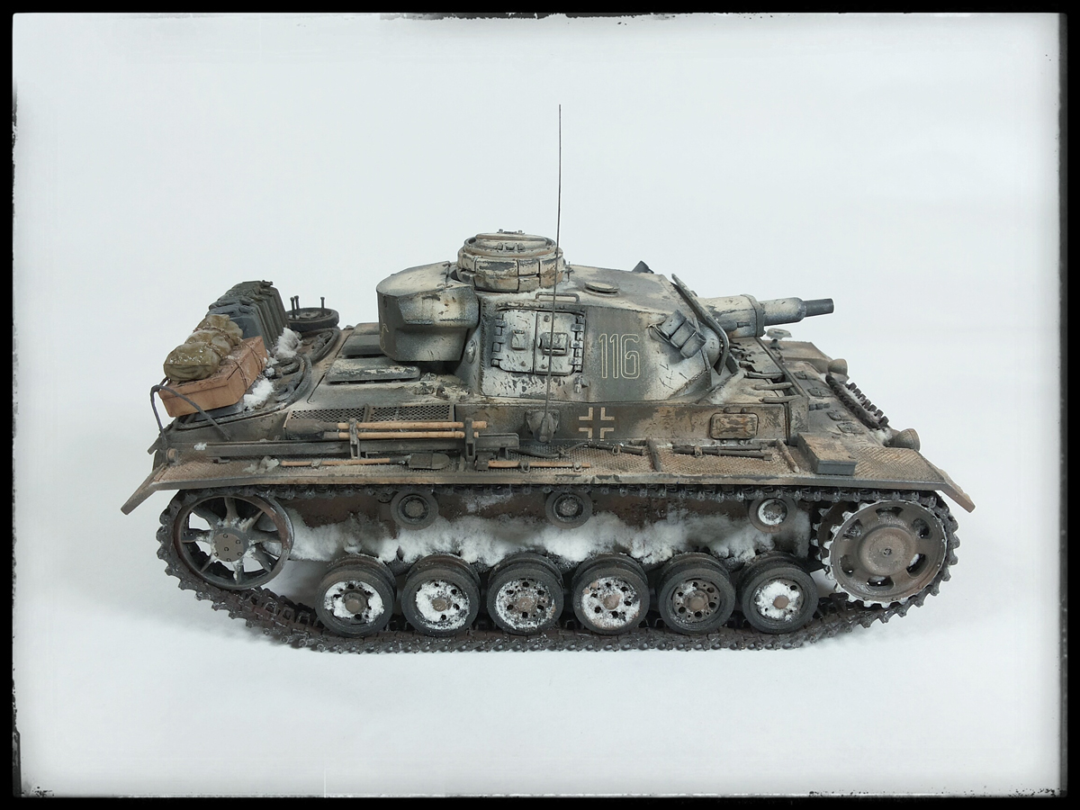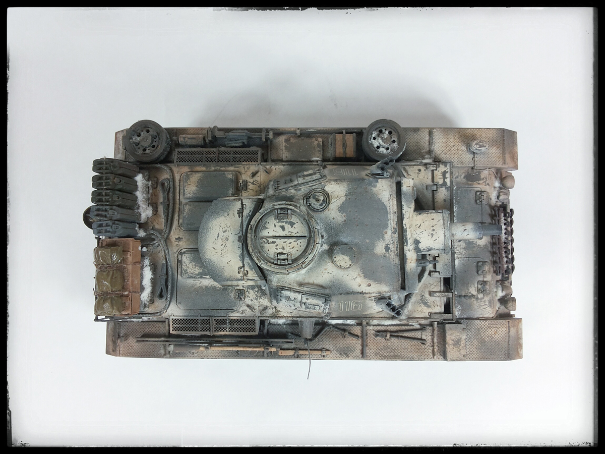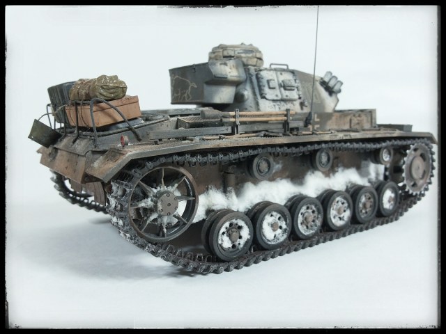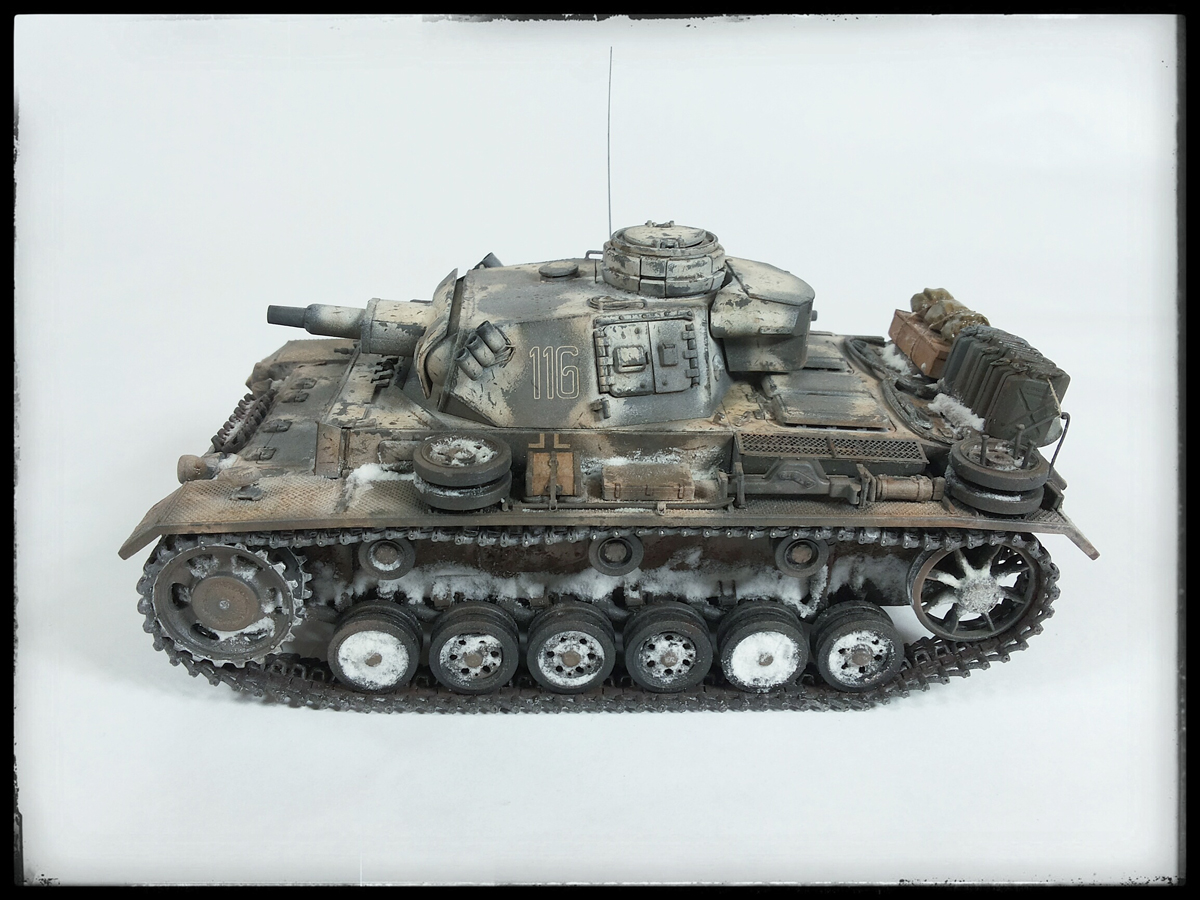 Не размещал свои модели больше года, т.к. было много работы. Вот наконец-то время появилось и вот собственно: Pz.Kpfw III Ausf. N Sd.Kfz.141/2 от Тамии. Сей кит всем известен и описывать я его не буду. Скажу, что модель в сборке отличная!!! Собрал практически из коробки, добавил от себя решётки МТО на Stug III от Тамии, сделав из проволоки усиление на них по середине (см. оригинальное фото), поставил алюминиевые "гусли" от Spade Ace Models. Кстати весьма клёвая альтернатива Фриулу, дешевле и по качеству не уступают!!! Вставил плёнку от DVD во все смотровые отверстия, доработал крепление бруса под домкрат, антенна из литника. Боковые и командирский люки открываются, рассверлил выхлопные трубы, сымитировал сварные швы на башне, седлал из проволоки багажник, как на оригинальном фото, поклажа от Tamiya и Academy вперемешку, ведро из Доширак, провёл проводку к фарам, декали "приварил" Тамиевским Mark Fit-ом... Снег сода+ПВА.