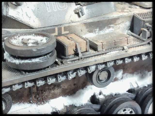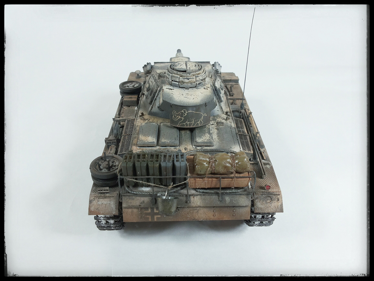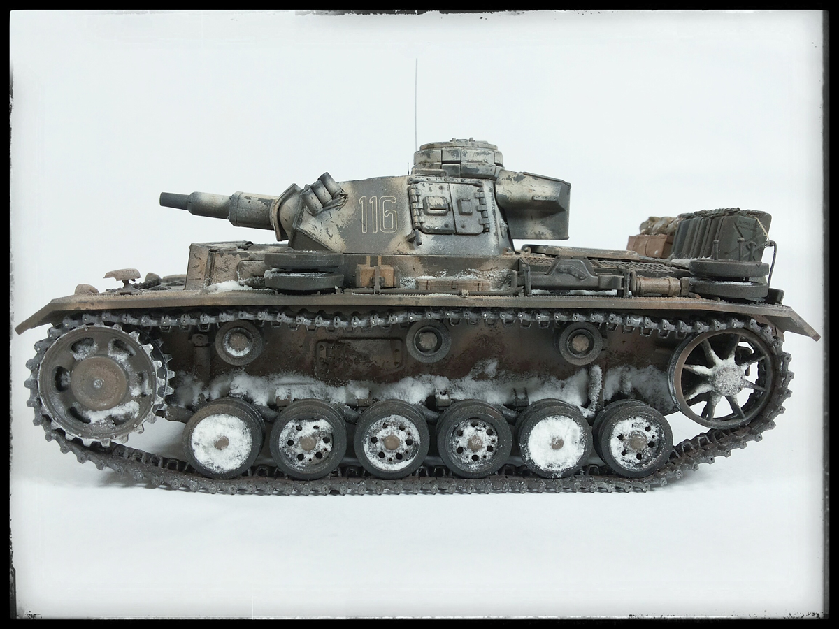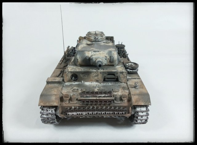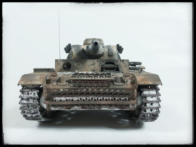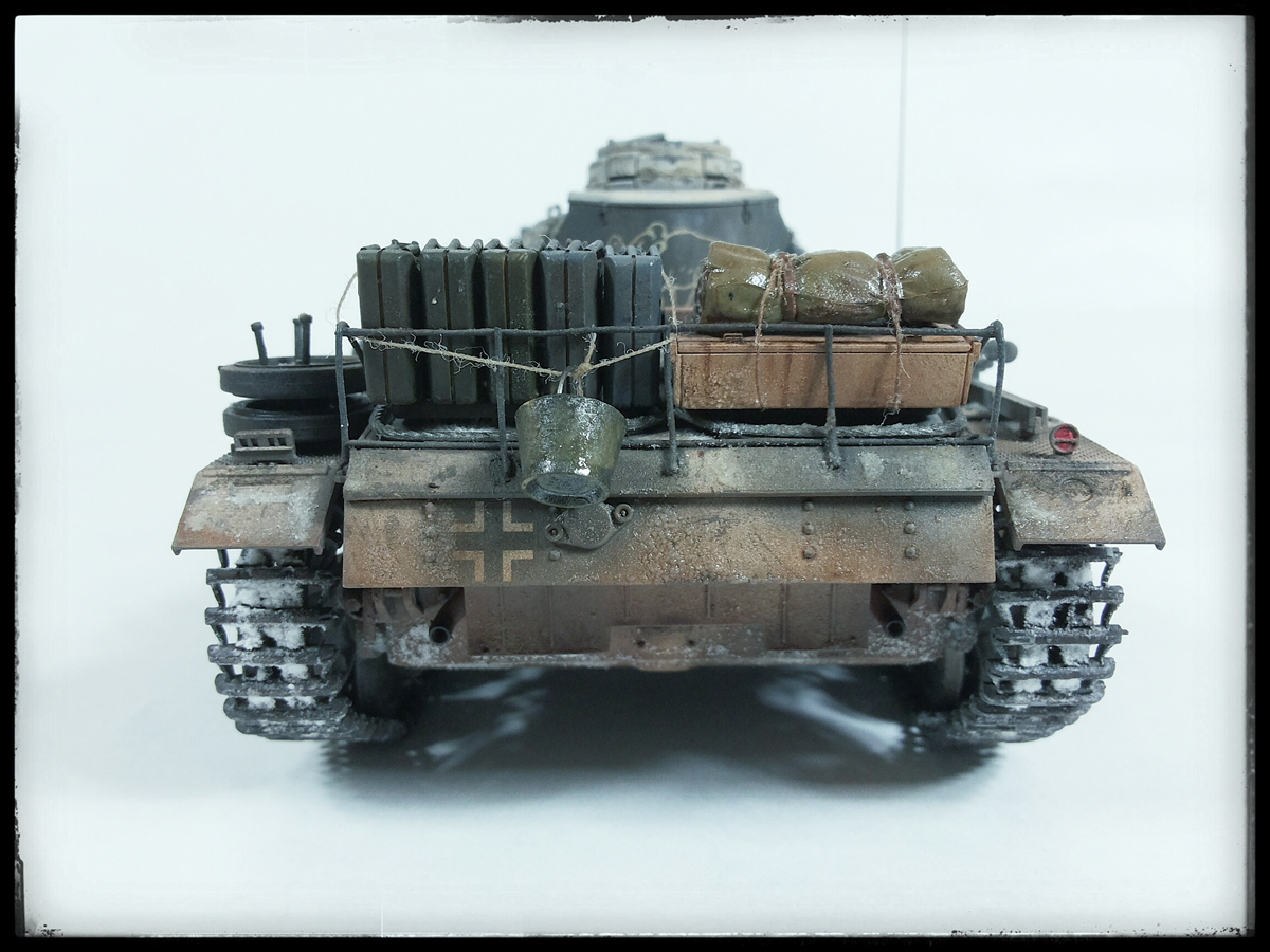 Не размещал свои модели больше года, т.к. было много работы. Вот наконец-то время появилось и вот собственно: Pz.Kpfw III Ausf. N Sd.Kfz.141/2 от Тамии. Сей кит всем известен и описывать я его не буду. Скажу, что модель в сборке отличная!!! Собрал практически из коробки, добавил от себя решётки МТО на Stug III от Тамии, сделав из проволоки усиление на них по середине (см. оригинальное фото), поставил алюминиевые "гусли" от Spade Ace Models. Кстати весьма клёвая альтернатива Фриулу, дешевле и по качеству не уступают!!! Вставил плёнку от DVD во все смотровые отверстия, доработал крепление бруса под домкрат, антенна из литника. Боковые и командирский люки открываются, рассверлил выхлопные трубы, сымитировал сварные швы на башне, седлал из проволоки багажник, как на оригинальном фото, поклажа от Tamiya и Academy вперемешку, ведро из Доширак, провёл проводку к фарам, декали "приварил" Тамиевским Mark Fit-ом... Снег сода+ПВА.