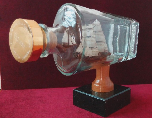 Постамент сделан из черного мрамора, на нём установлена ножка из бука. Пробка запечатана изнутри бутылки. Замок выполнен из яхты. На парусе яхты нанесена роспись и год изготовления модели.