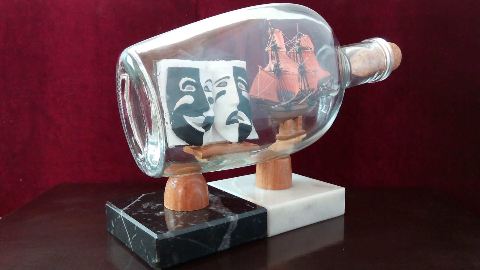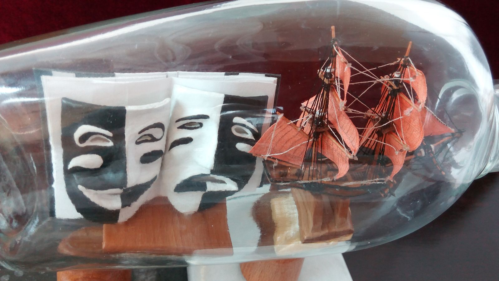 В бутылке объёмом 0,5л. размещена книга, с пустыми страницами, а на фоне их театральные маски, сама книга олицетворяет жизнь, которую пишет сам человек. Маски как символ радости и горя. Корабль с алыми парусами, как символ девичий мечты.