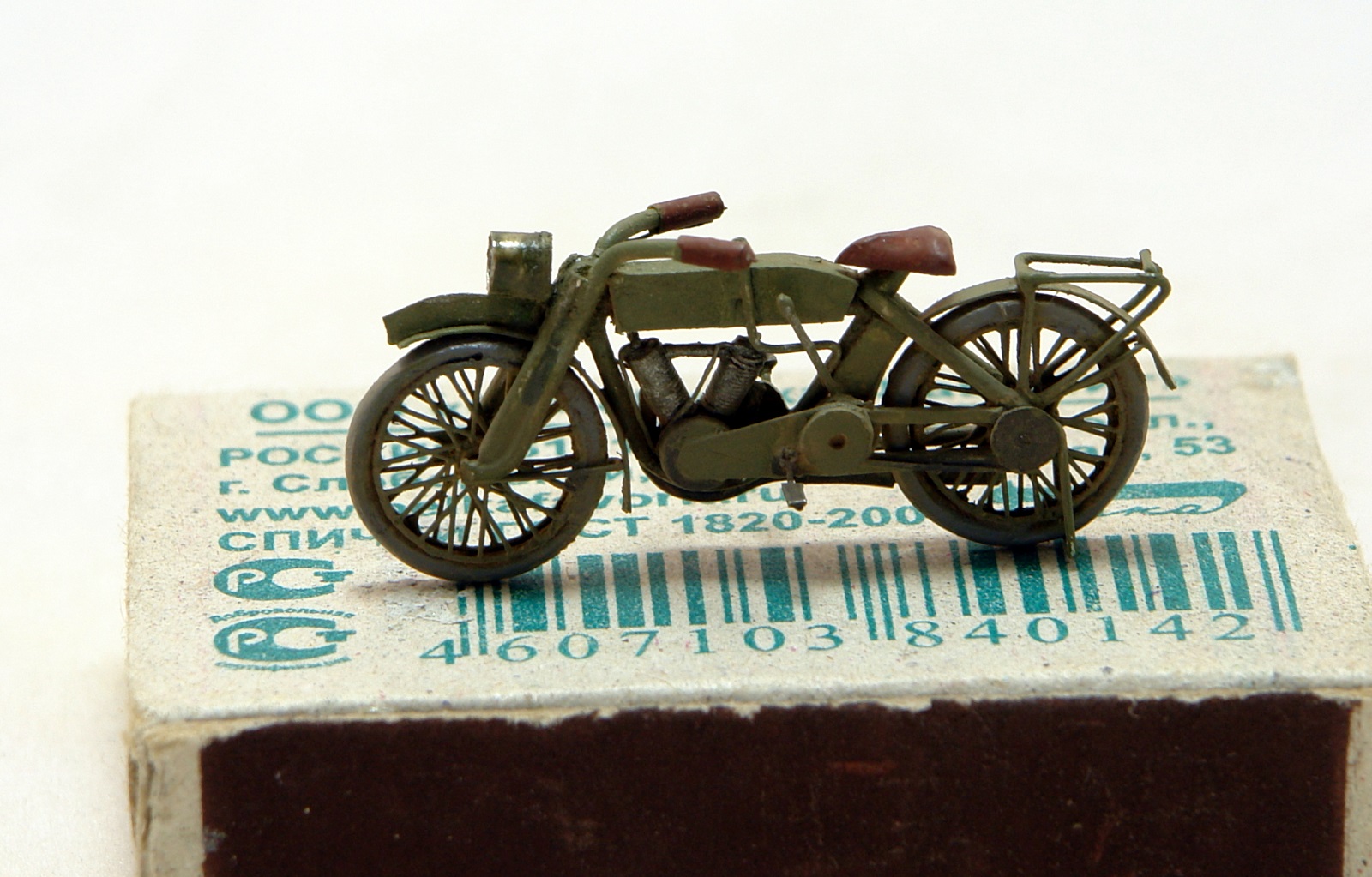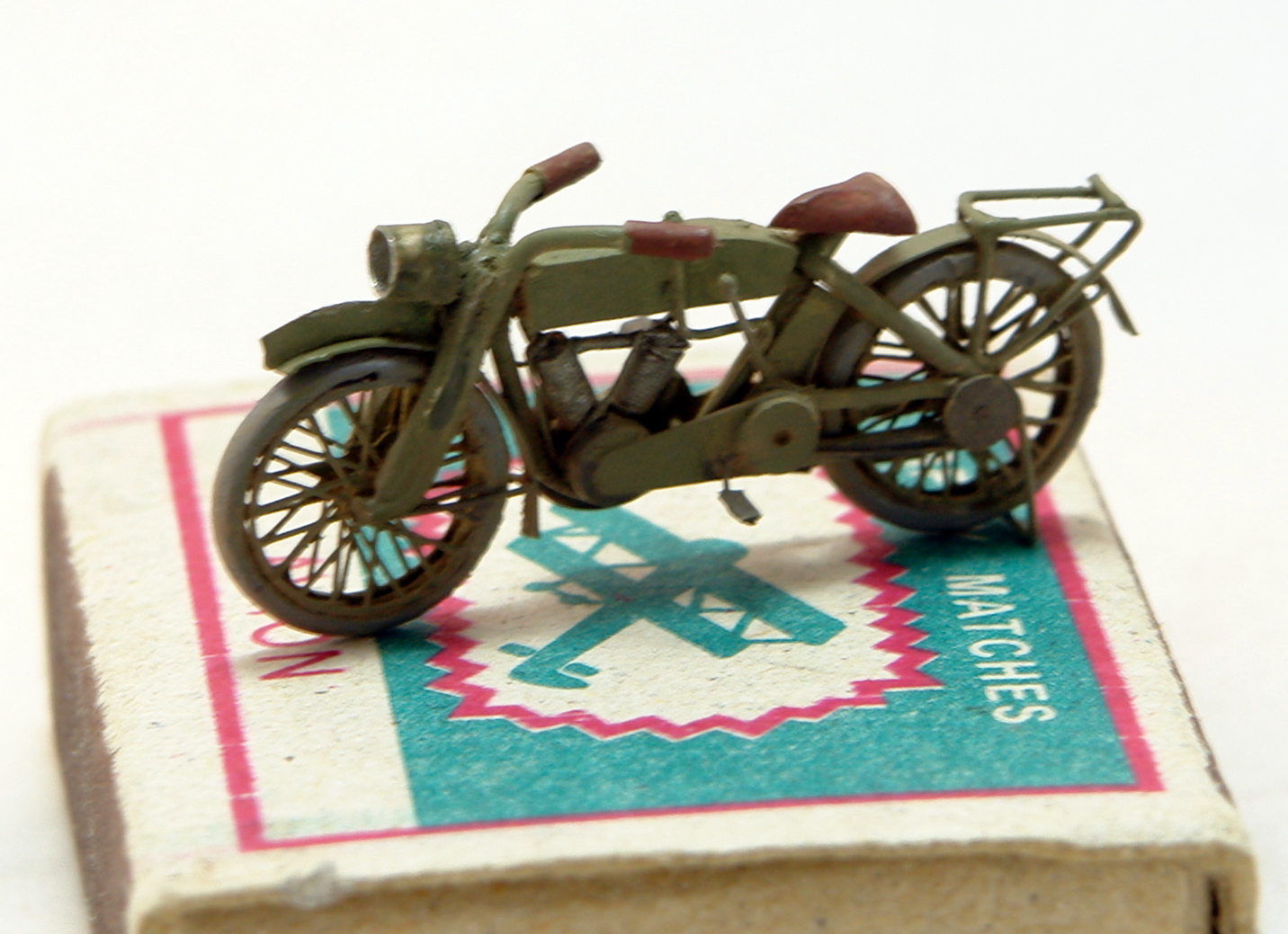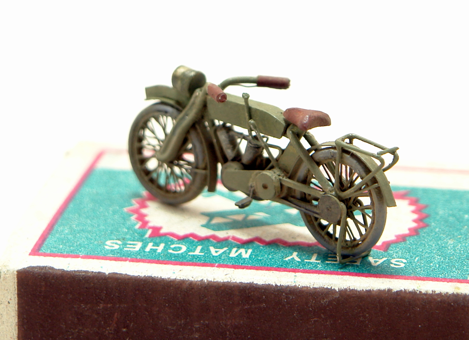 Раму, вилку и багажник спаял из канцелярских скрепок. Очень даже ничего с кислотой. Остальное это струна, пластик, проволока. Сорри за фотки с коробком, но мотик нормально стоит только на нем;) Краска Тамия.