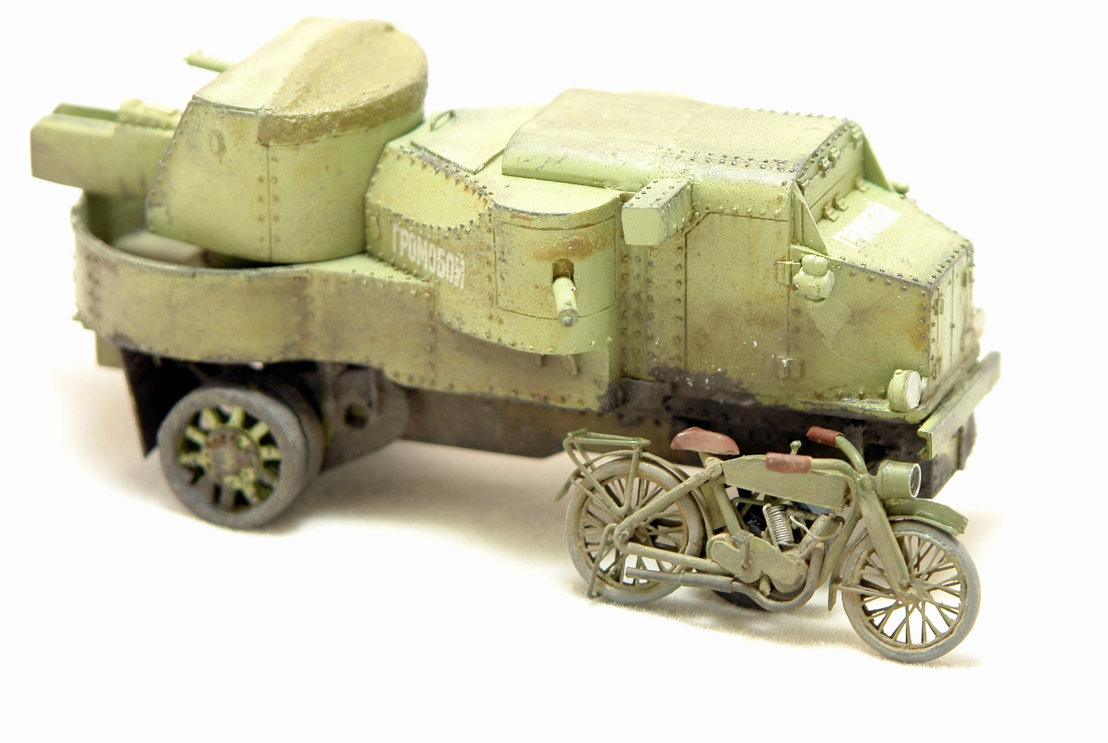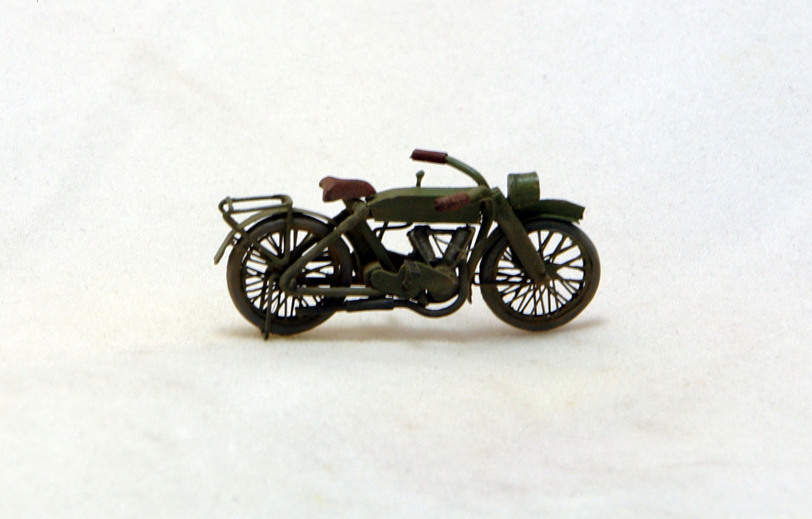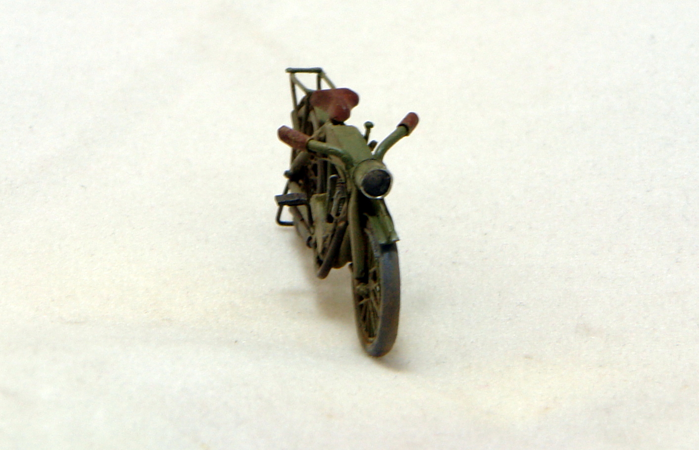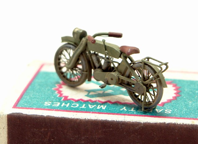 Раму, вилку и багажник спаял из канцелярских скрепок. Очень даже ничего с кислотой. Остальное это струна, пластик, проволока. Сорри за фотки с коробком, но мотик нормально стоит только на нем;) Краска Тамия.